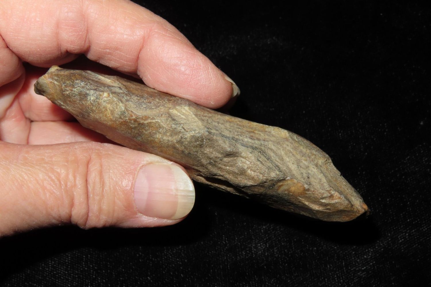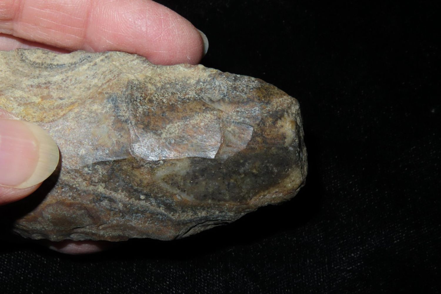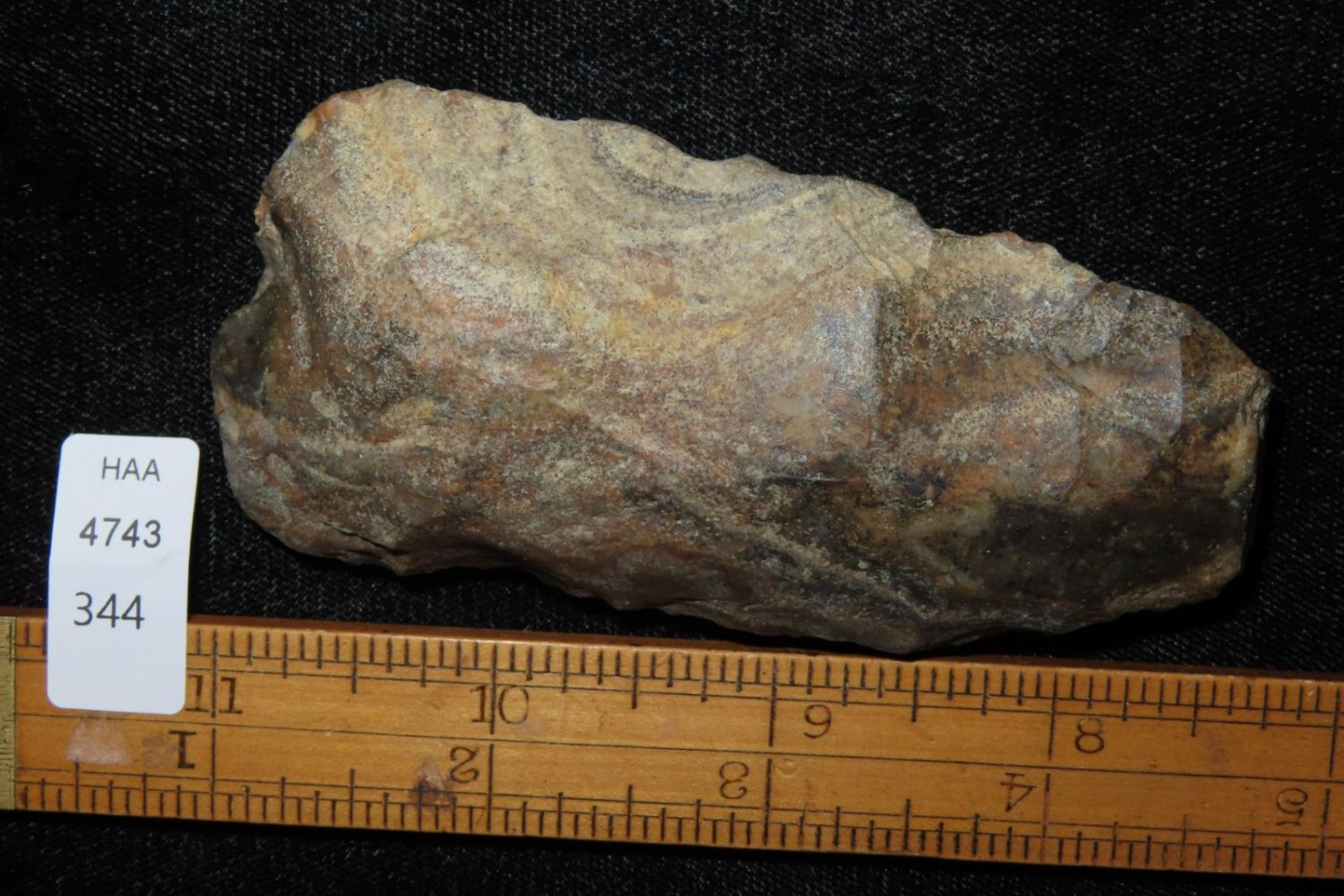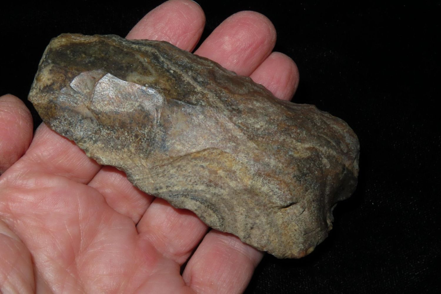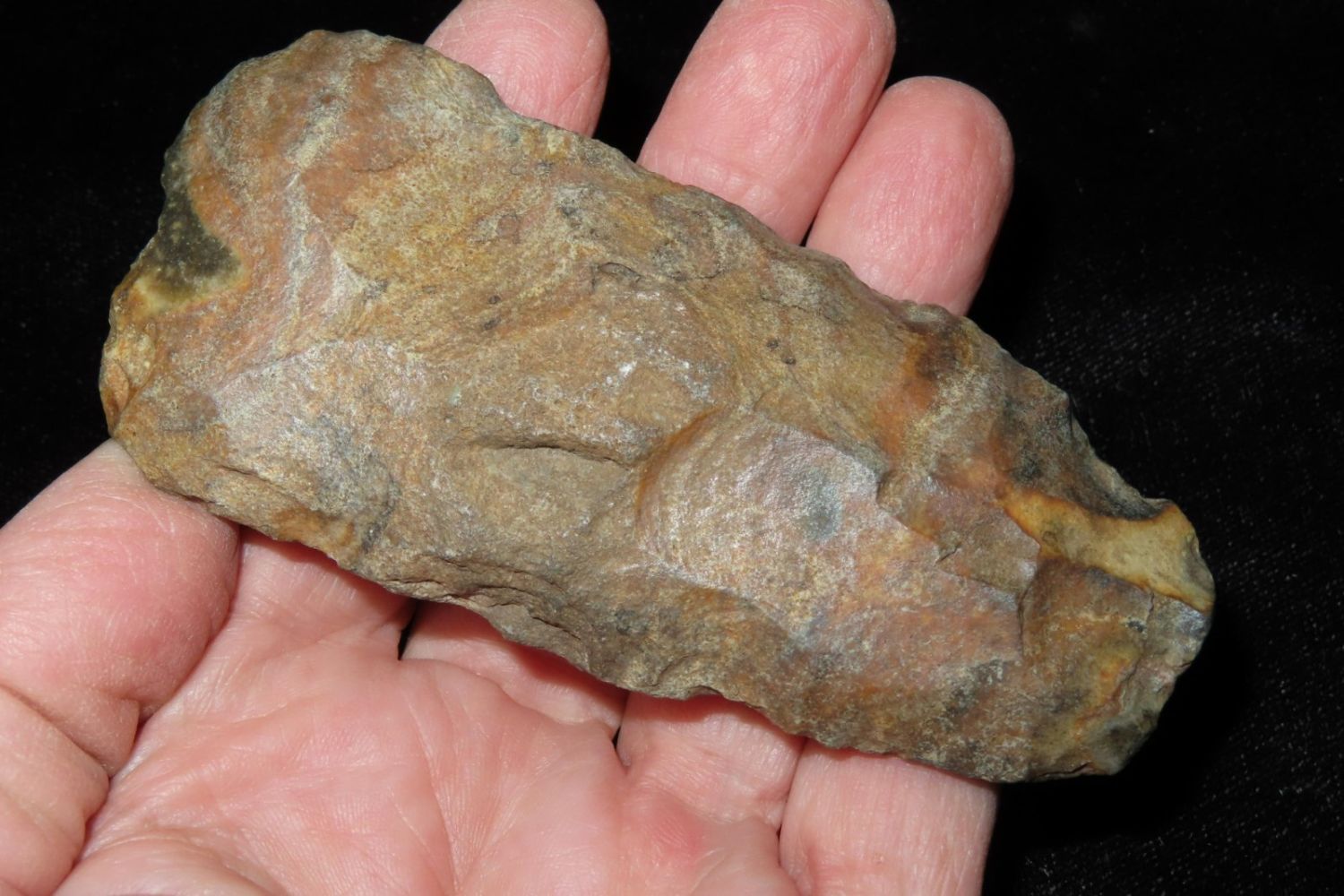 3.3/4" Colorful Adze, Nice From the James and Joe George Collection. Joe George was an avid collector and finder of Native American artifacts in the greater St Louis Missouri area. Joe collected his entire life. Upon his passing he turned his collection over to his son James. James was also a very avid collector. He enjoyed walking various waterways and attending artifact shows. James is looking forward to passing down his collection to the relic community for caretaking.