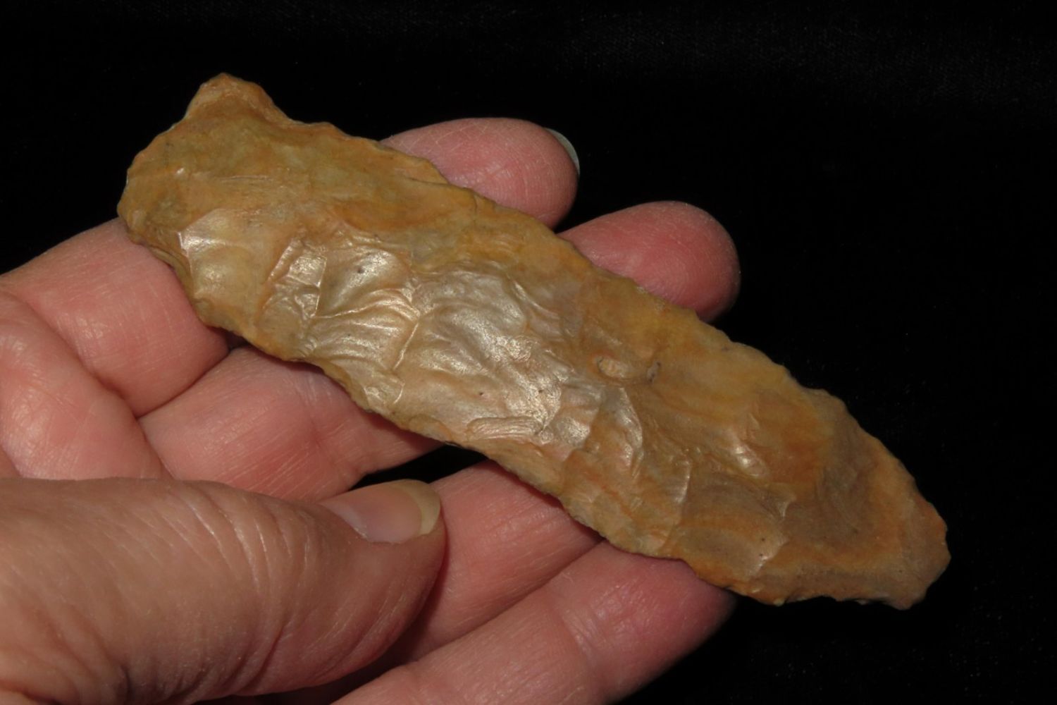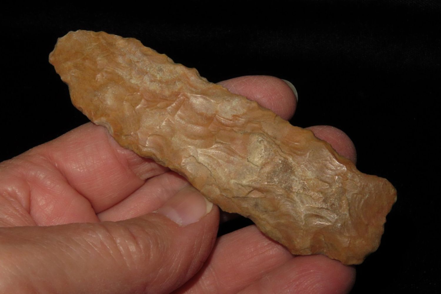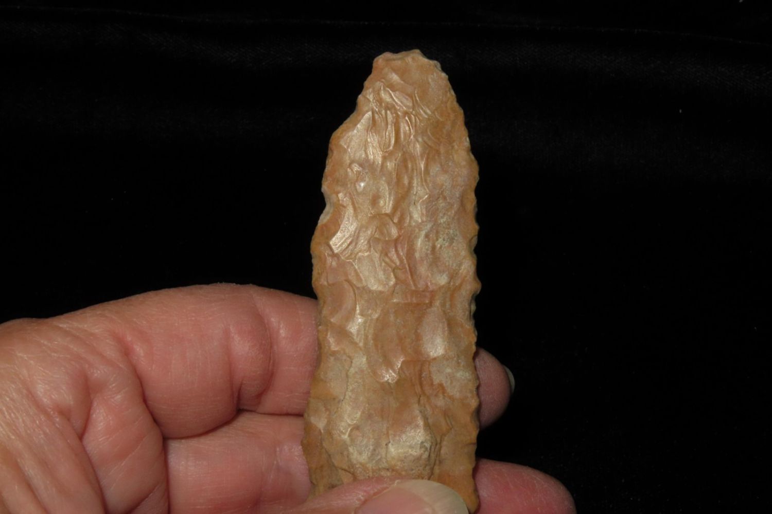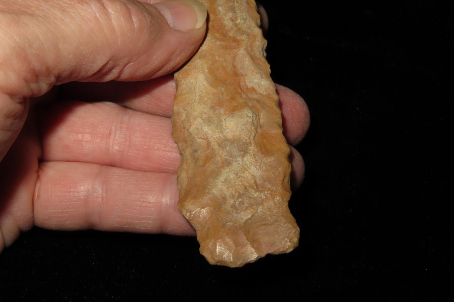 3.3/4" River Polished Blade, Thin, From the James and Joe George Collection. Joe George was an avid collector and finder of Native American artifacts in the greater St Louis Missouri area. Joe collected his entire life. Upon his passing he turned his collection over to his son James. James was also a very avid collector. He enjoyed walking various waterways and attending artifact shows. James is looking forward to passing down his collection to the relic community for caretaking.