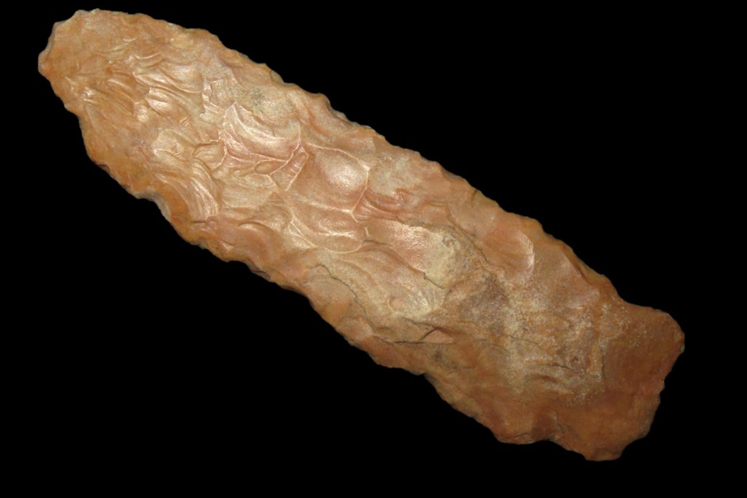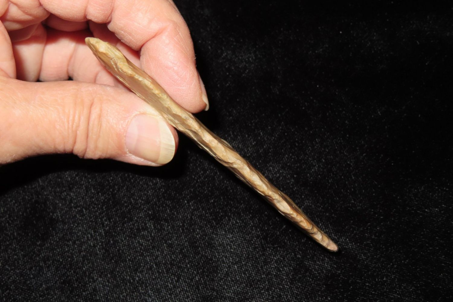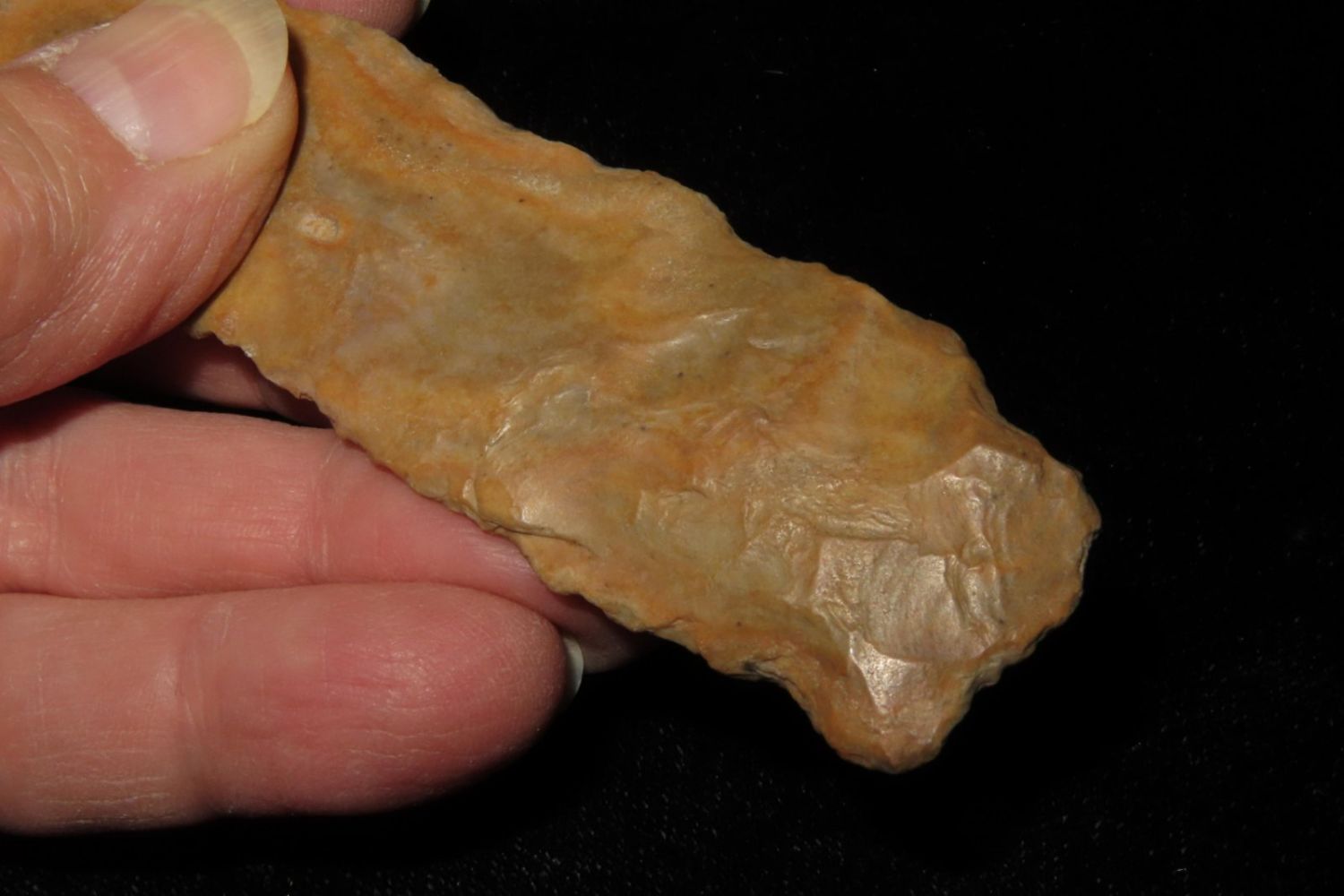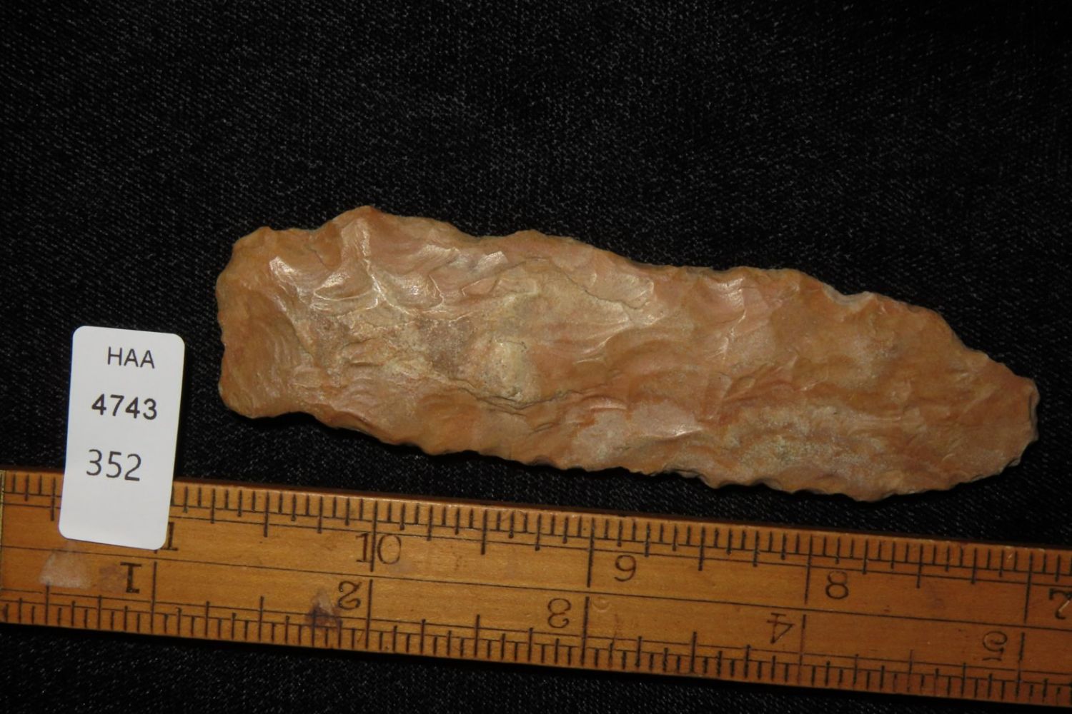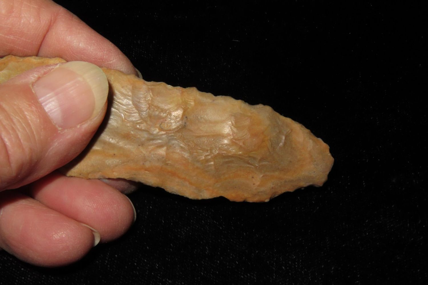 3.3/4" River Polished Blade, Thin, From the James and Joe George Collection. Joe George was an avid collector and finder of Native American artifacts in the greater St Louis Missouri area. Joe collected his entire life. Upon his passing he turned his collection over to his son James. James was also a very avid collector. He enjoyed walking various waterways and attending artifact shows. James is looking forward to passing down his collection to the relic community for caretaking.