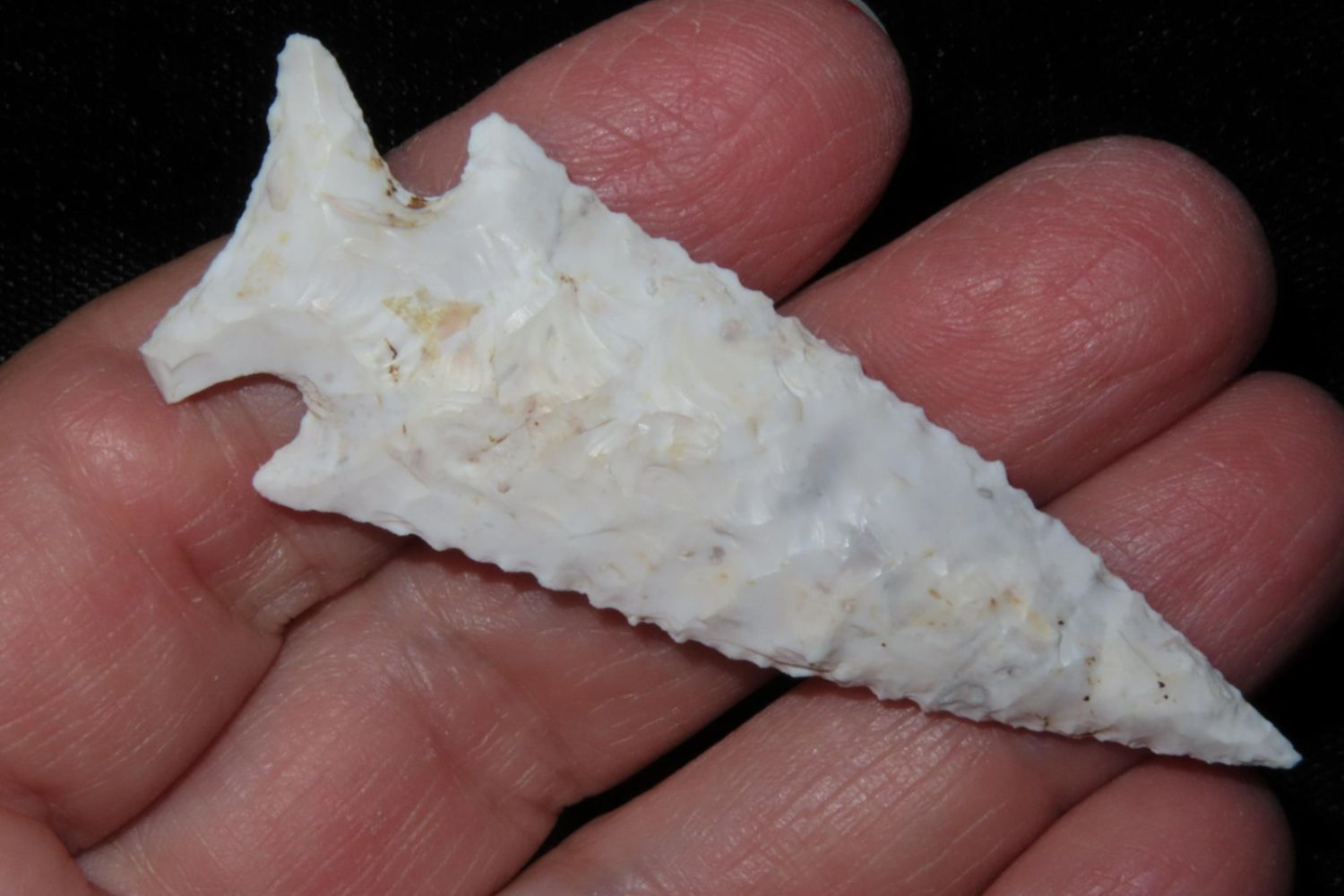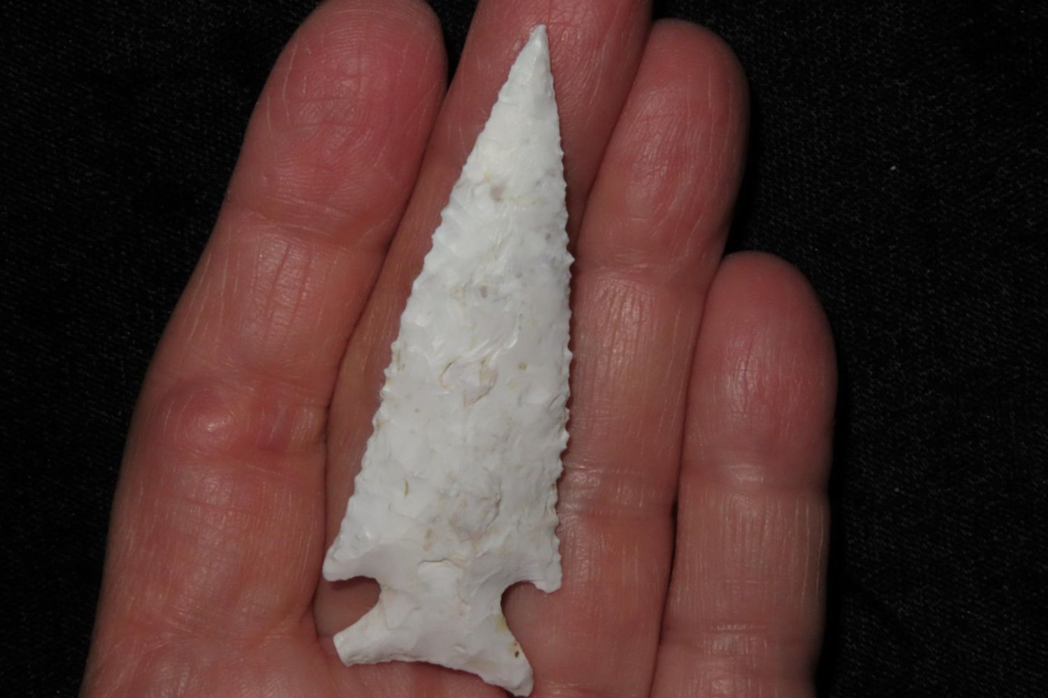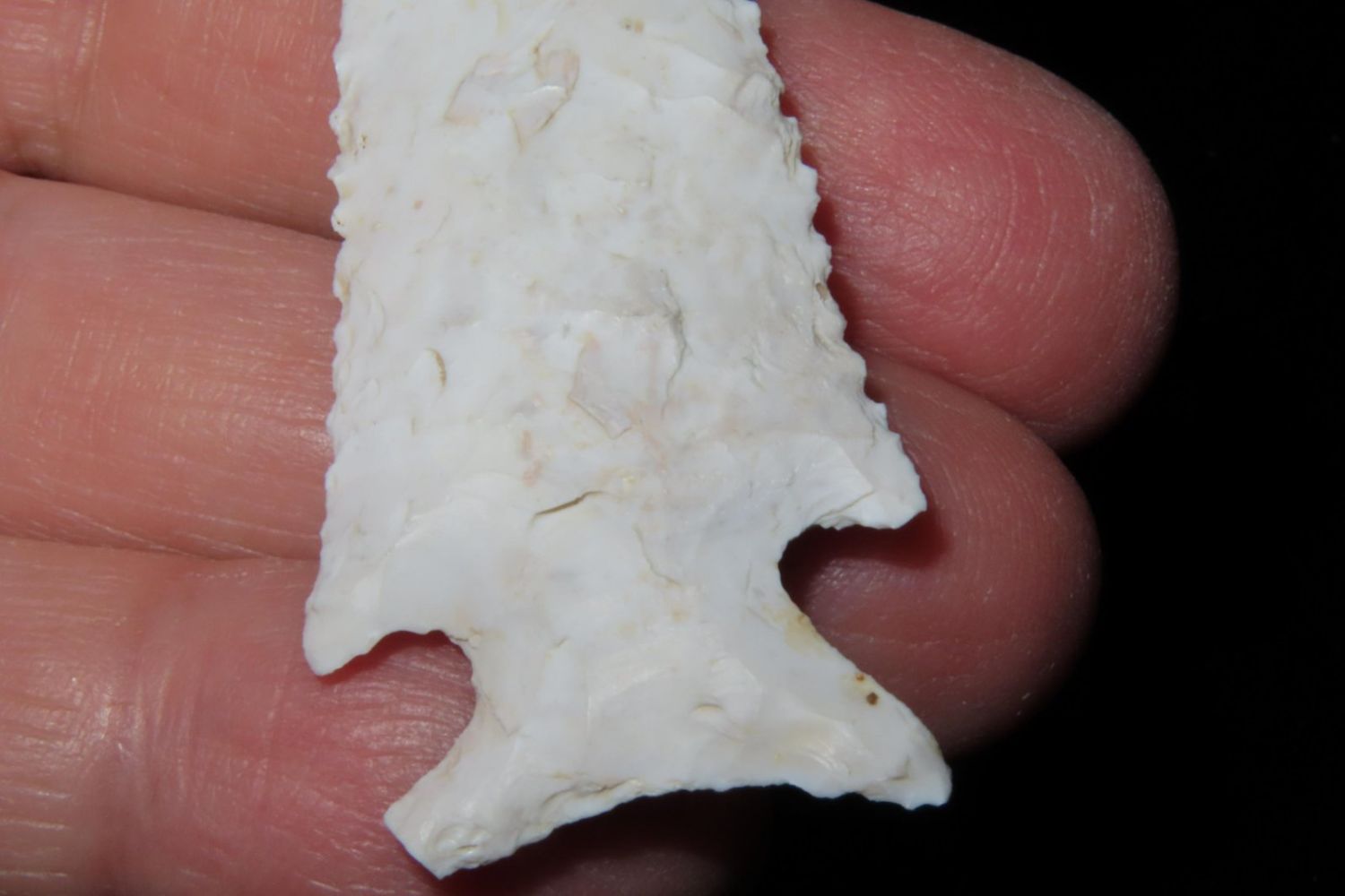2 1/2" Kings Corner Notch. Serrated and extremely well made, nice rare example. From the James and Joe George Collection. Joe George was an avid collector and finder of Native American artifacts in the greater St Louis Missouri area. Joe collected his entire life. Upon his passing he turned his collection over to his son James. James was also a very avid collector. He enjoyed walking various waterways and attending artifact shows. James is looking forward to passing down his collection to the relic community for caretaking.