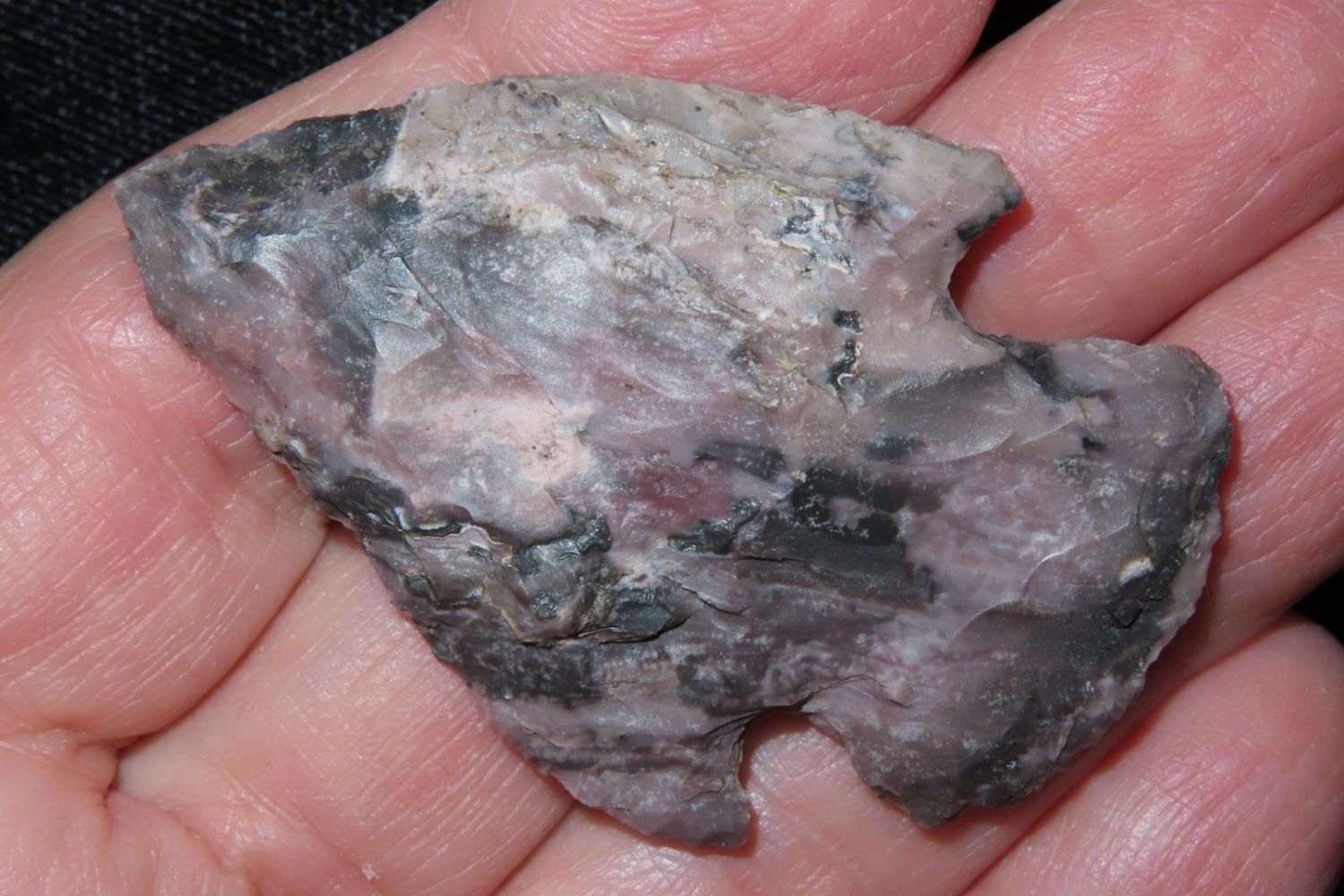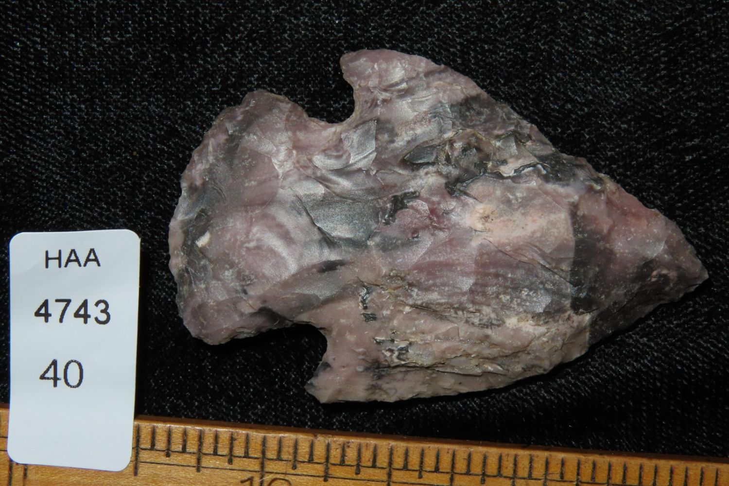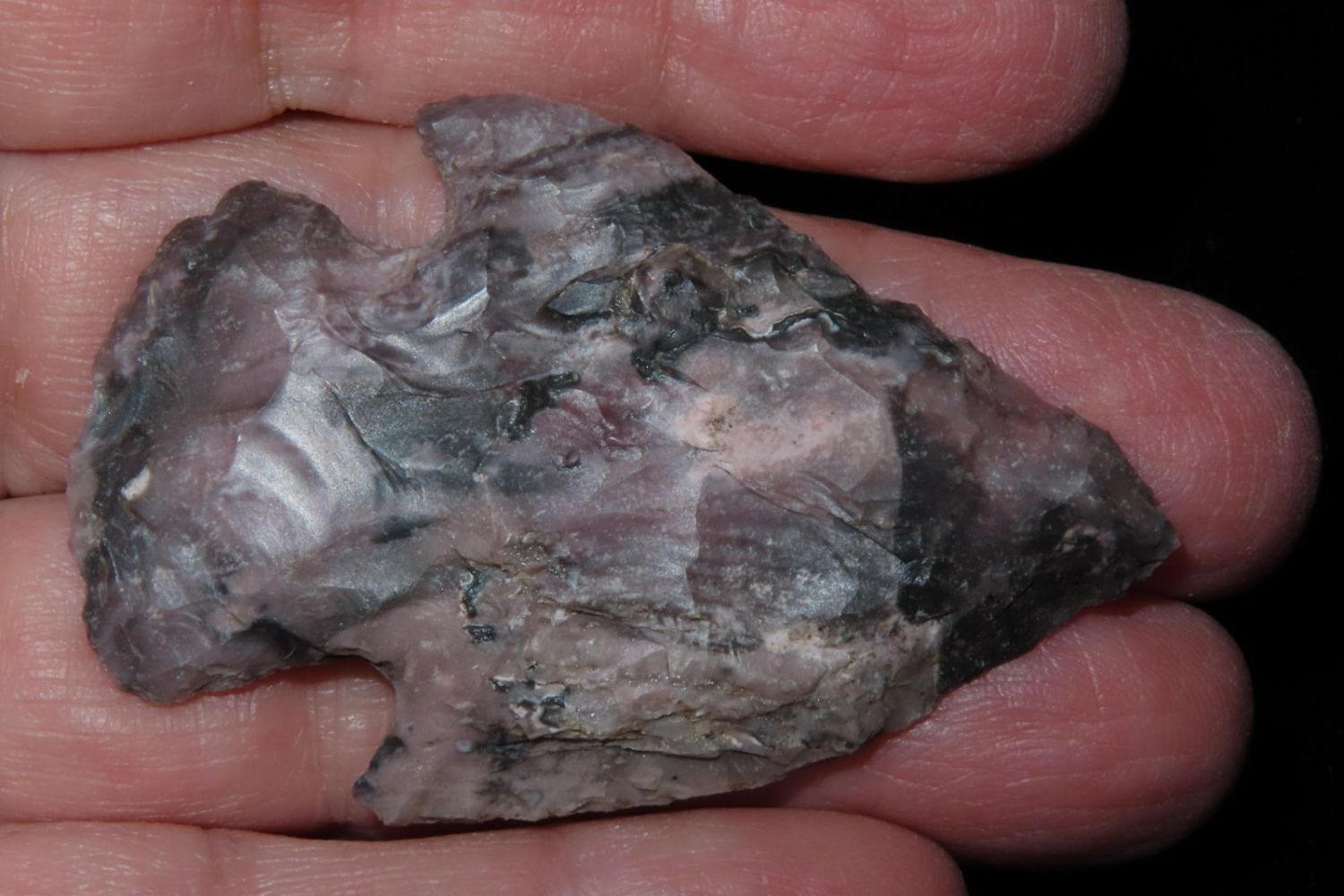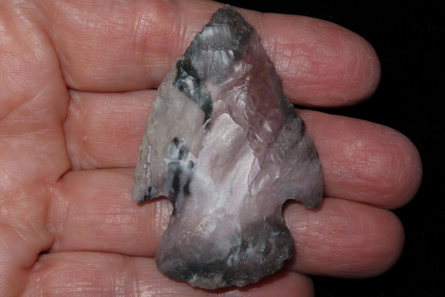 2 1/8" Extremely colorful Hopewell Point. From the James and Joe George Collection. Joe George was an avid collector and finder of Native American artifacts in the greater St Louis Missouri area. Joe collected his entire life. Upon his passing he turned his collection over to his son James. James was also a very avid collector. He enjoyed walking various waterways and attending artifact shows. James is looking forward to passing down his collection to the relic community for caretaking.