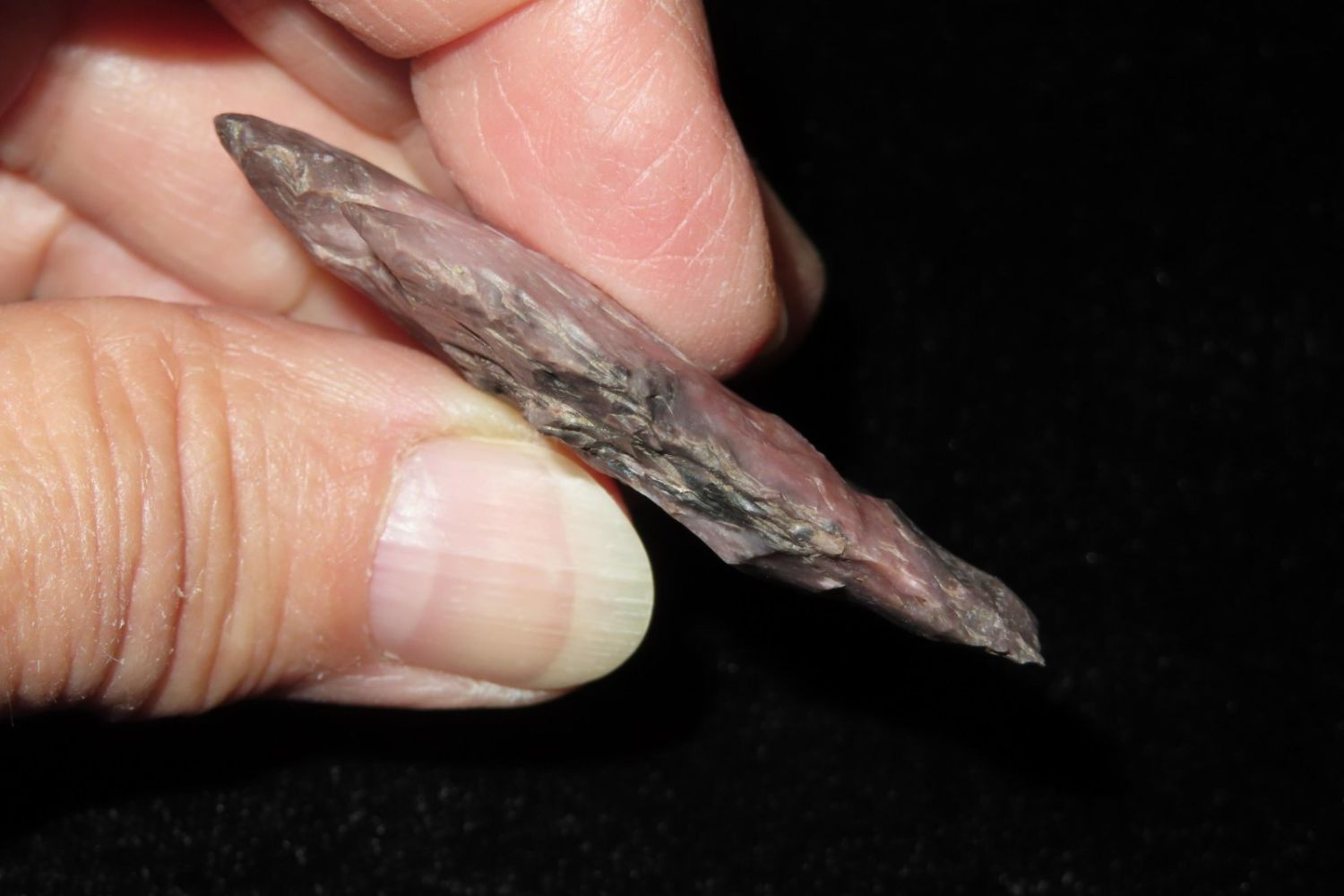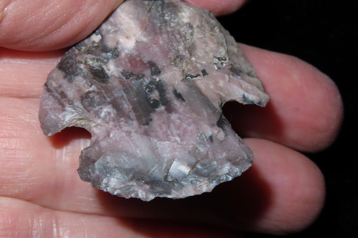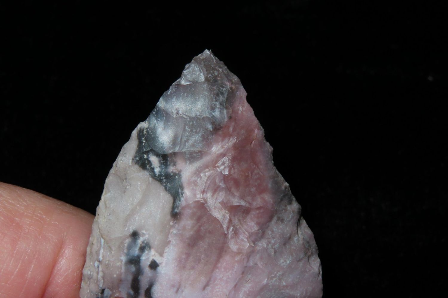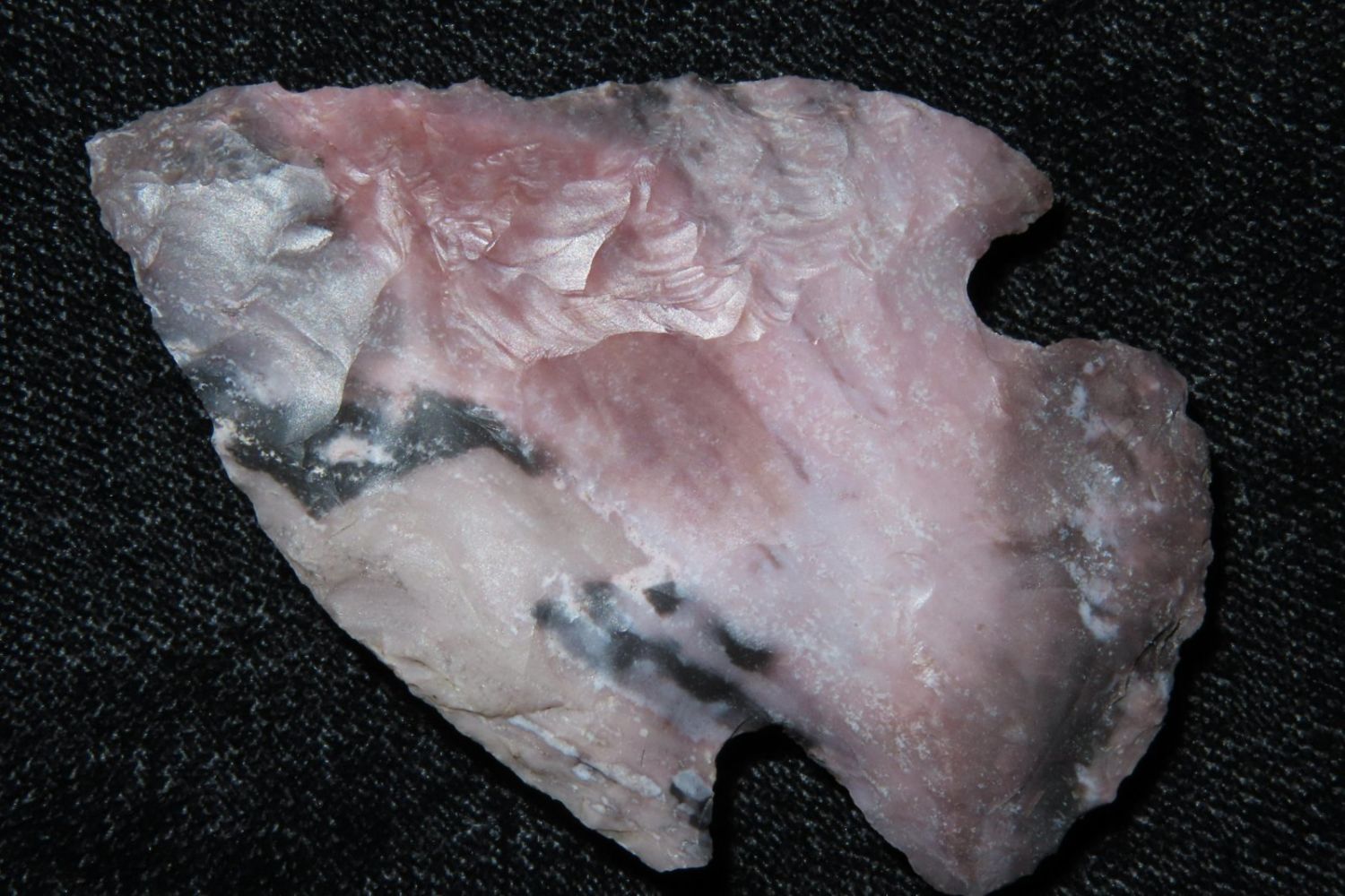 2 1/8" Extremely colorful Hopewell Point. From the James and Joe George Collection. Joe George was an avid collector and finder of Native American artifacts in the greater St Louis Missouri area. Joe collected his entire life. Upon his passing he turned his collection over to his son James. James was also a very avid collector. He enjoyed walking various waterways and attending artifact shows. James is looking forward to passing down his collection to the relic community for caretaking.