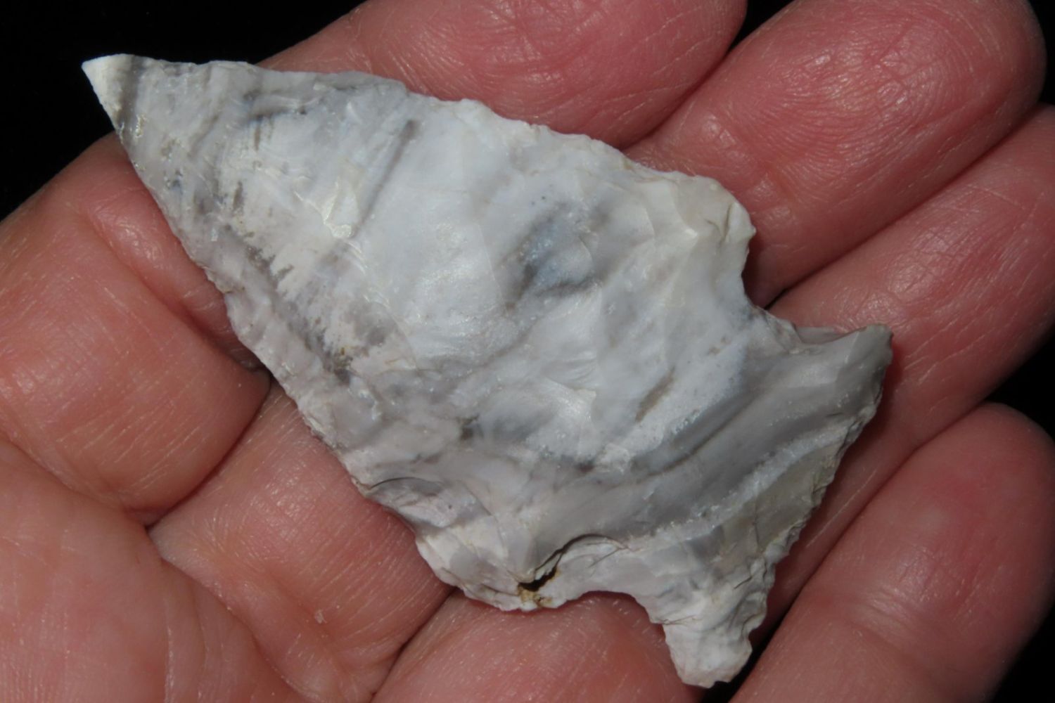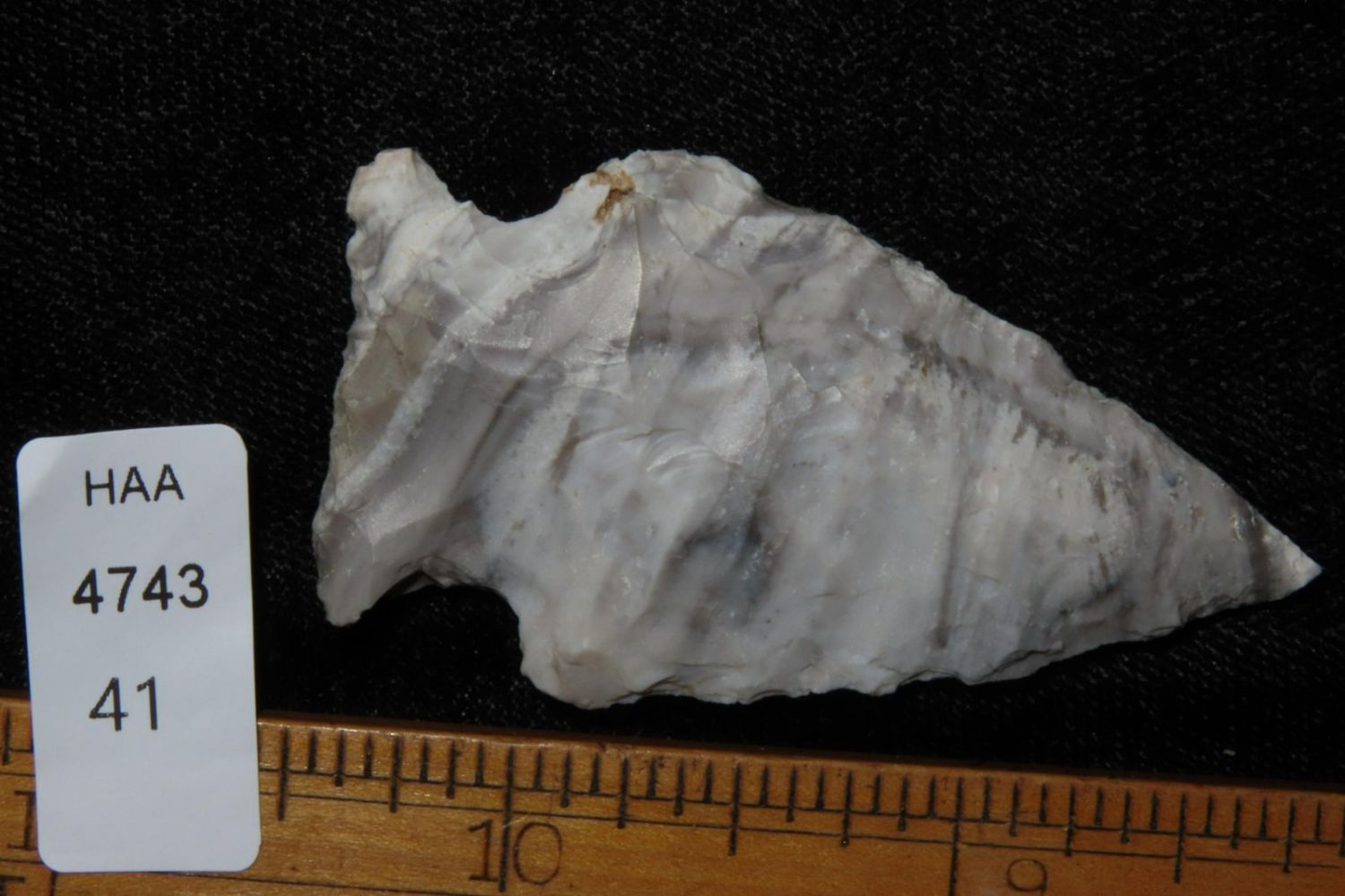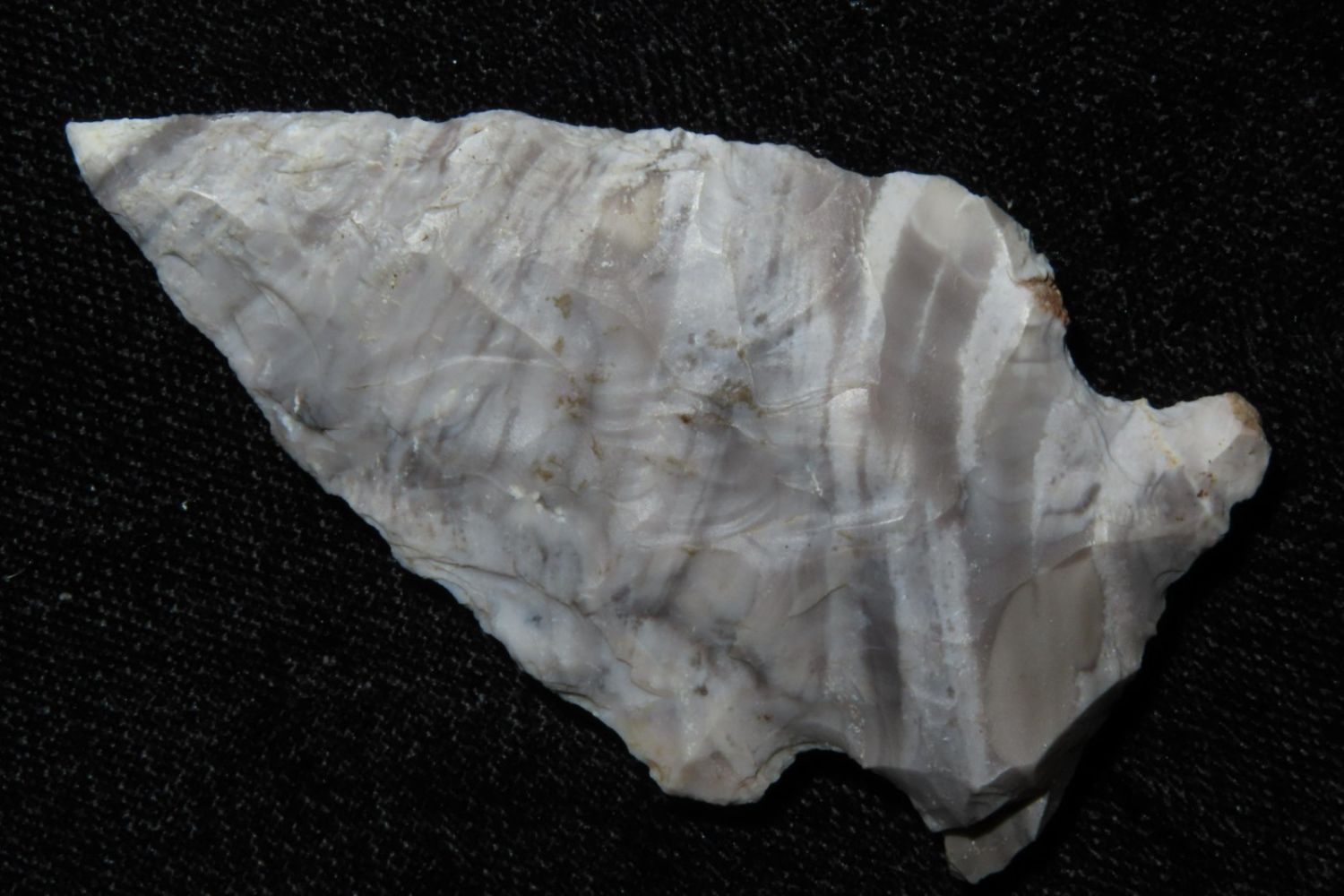 2 1/4" Mozarkite Side Notch. From the James and Joe George Collection. Joe George was an avid collector and finder of Native American artifacts in the greater St Louis Missouri area. Joe collected his entire life. Upon his passing he turned his collection over to his son James. James was also a very avid collector. He enjoyed walking various waterways and attending artifact shows. James is looking forward to passing down his collection to the relic community for caretaking.