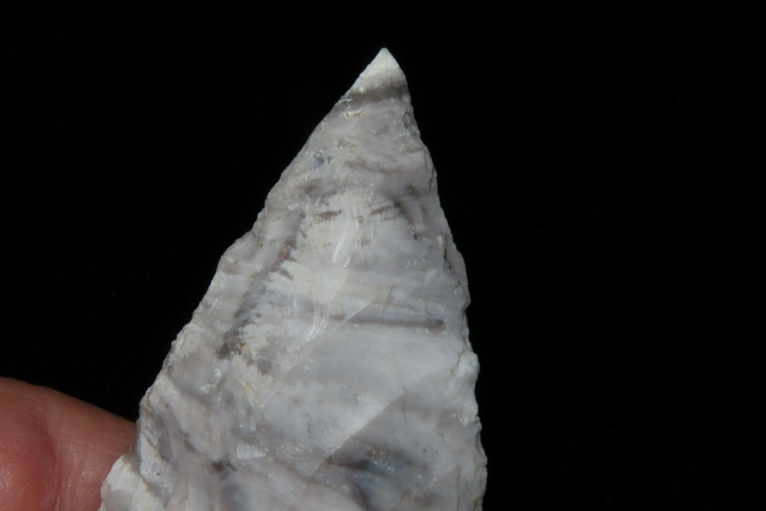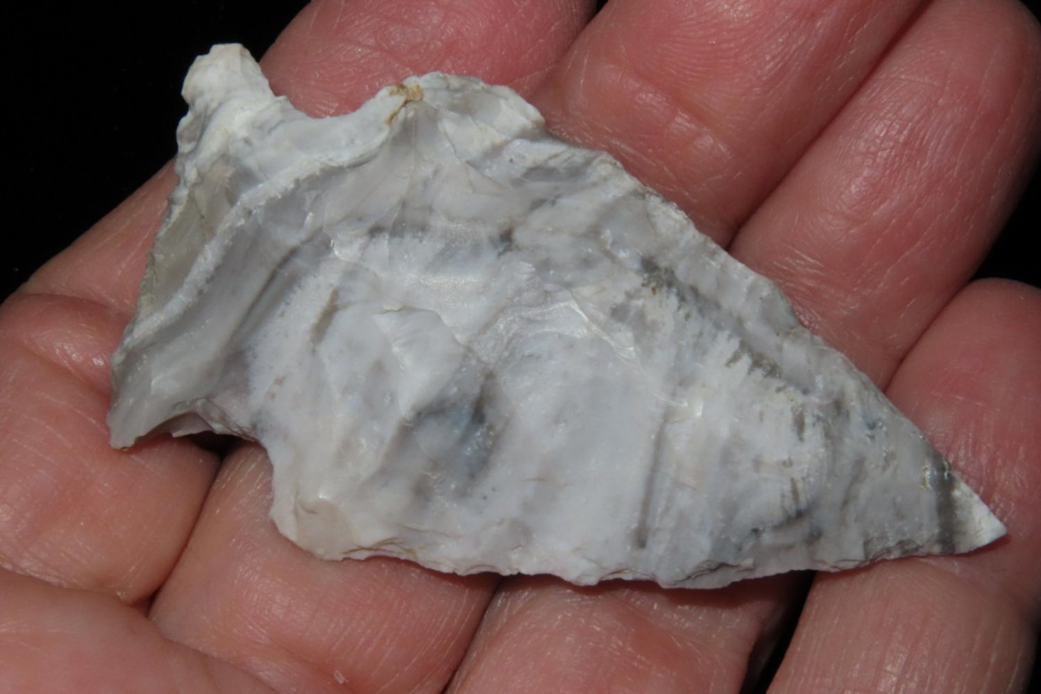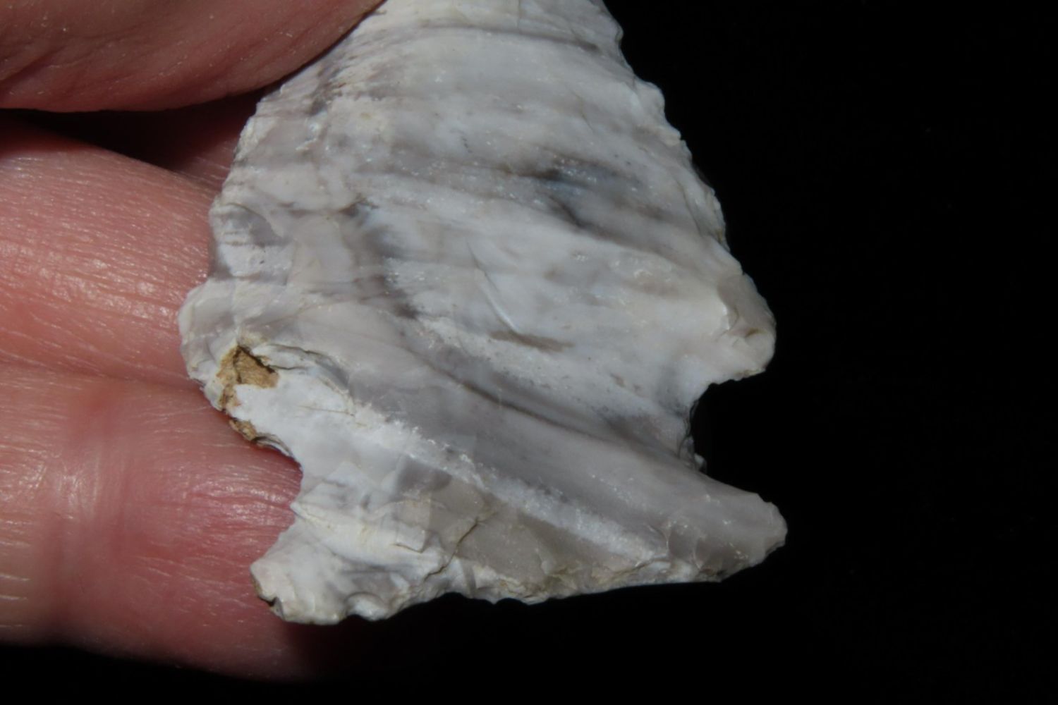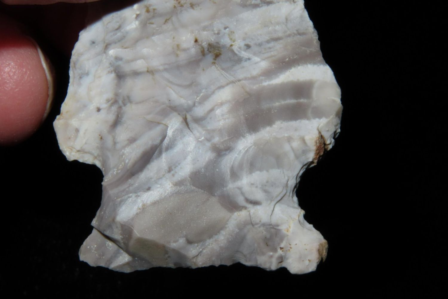 2 1/4" Mozarkite Side Notch. From the James and Joe George Collection. Joe George was an avid collector and finder of Native American artifacts in the greater St Louis Missouri area. Joe collected his entire life. Upon his passing he turned his collection over to his son James. James was also a very avid collector. He enjoyed walking various waterways and attending artifact shows. James is looking forward to passing down his collection to the relic community for caretaking.