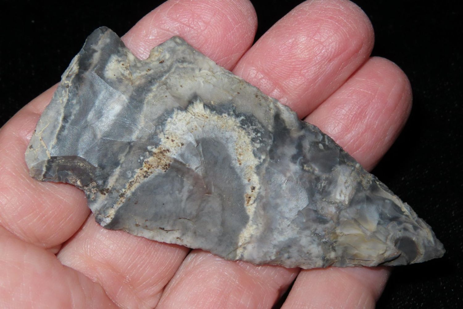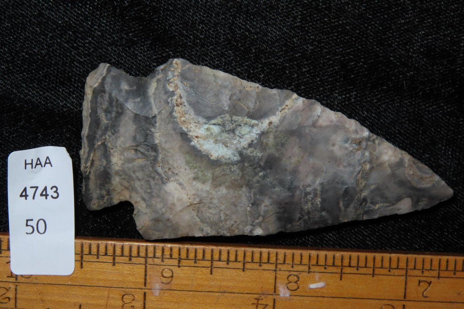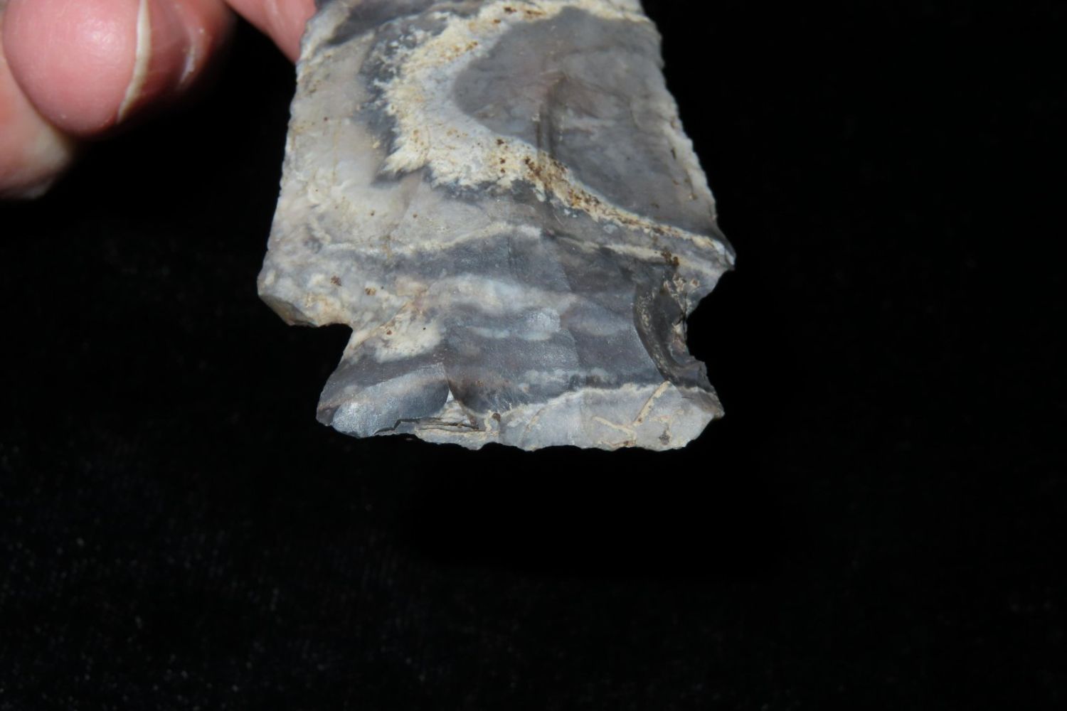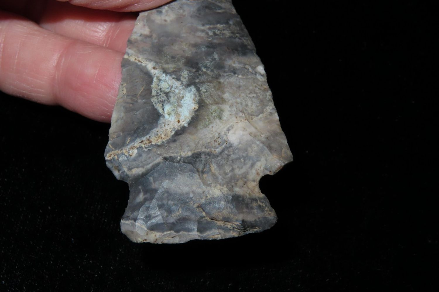 2 7/8" Etley. From the James and Joe George Collection. Joe George was an avid collector and finder of Native American artifacts in the greater St Louis Missouri area. Joe collected his entire life. Upon his passing he turned his collection over to his son James. James was also a very avid collector. He enjoyed walking various waterways and attending artifact shows. James is looking forward to passing down his collection to the relic community for caretaking.