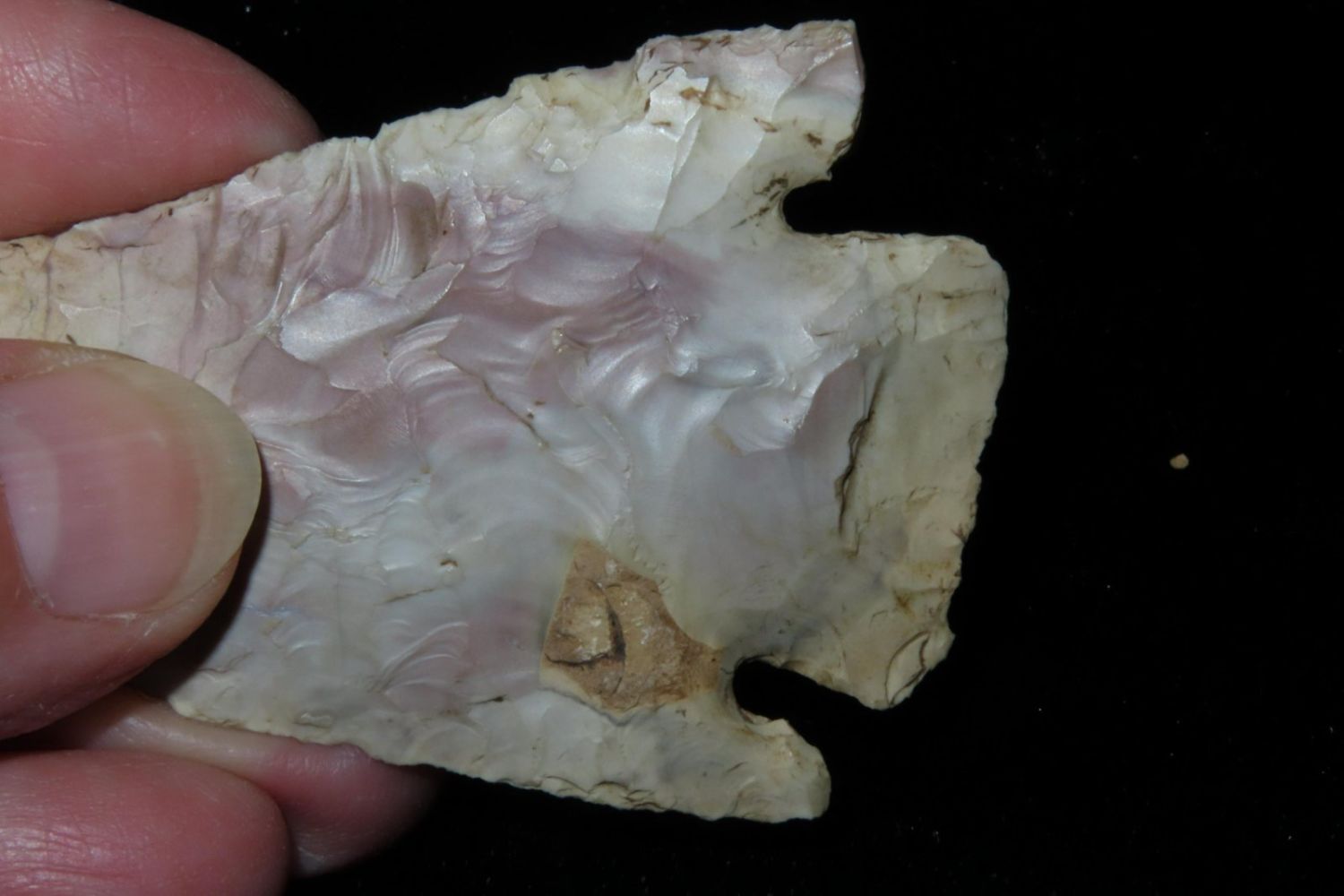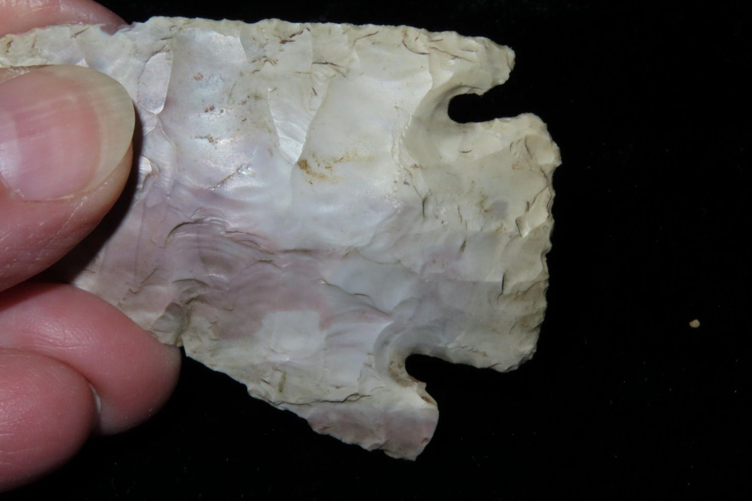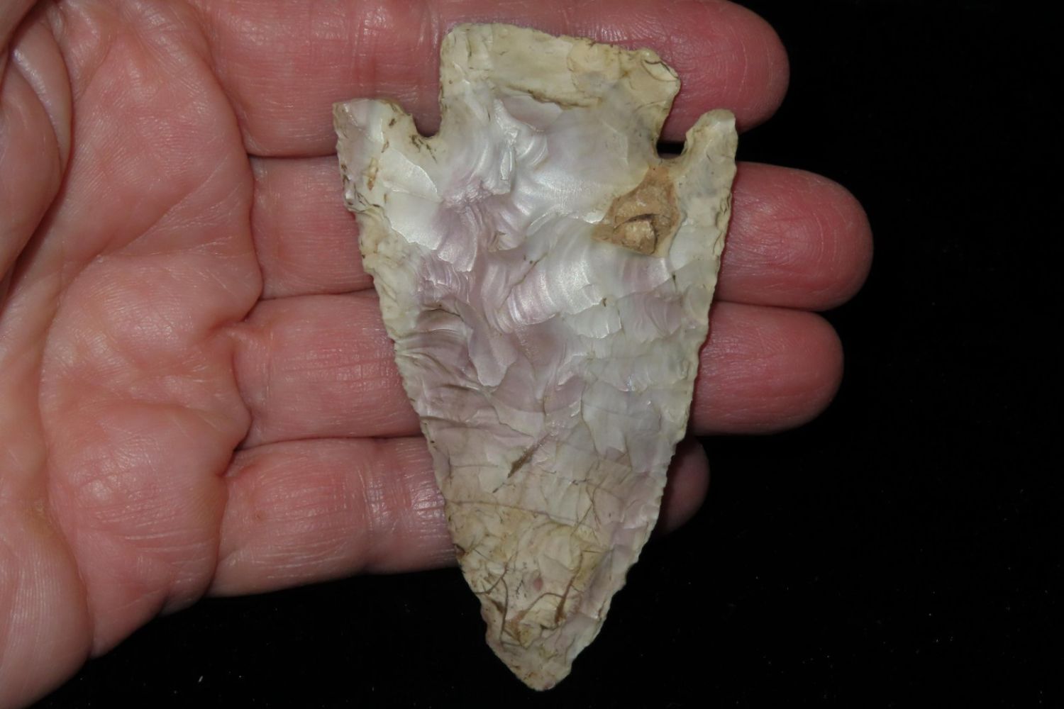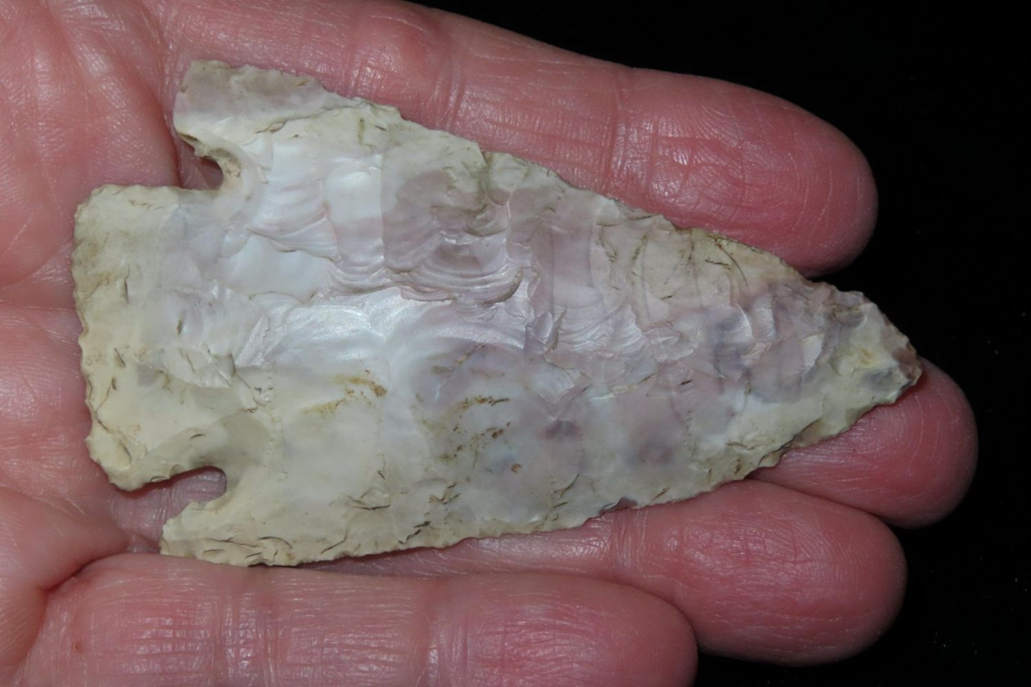2 7/8" Calf Creek. From the James and Joe George Collection. Joe George was an avid collector and finder of Native American artifacts in the greater St Louis Missouri area. Joe collected his entire life. Upon his passing he turned his collection over to his son James. James was also a very avid collector. He enjoyed walking various waterways and attending artifact shows. James is looking forward to passing down his collection to the relic community for caretaking.