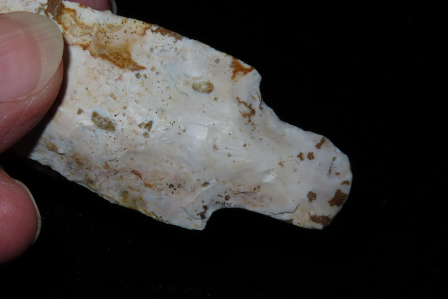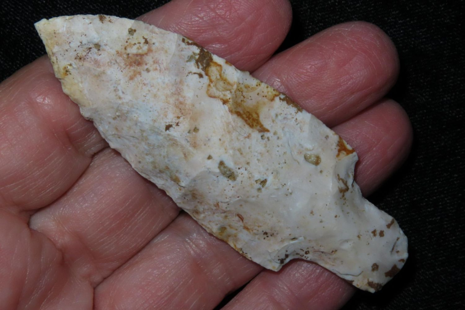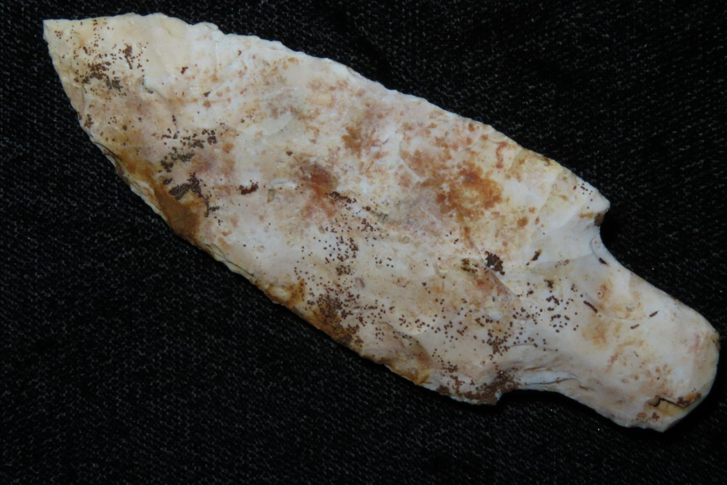 3" Narrow Stemmed Adena. From the James and Joe George Collection. Joe George was an avid collector and finder of Native American artifacts in the greater St Louis Missouri area. Joe collected his entire life. Upon his passing he turned his collection over to his son James. James was also a very avid collector. He enjoyed walking various waterways and attending artifact shows. James is looking forward to passing down his collection to the relic community for caretaking.