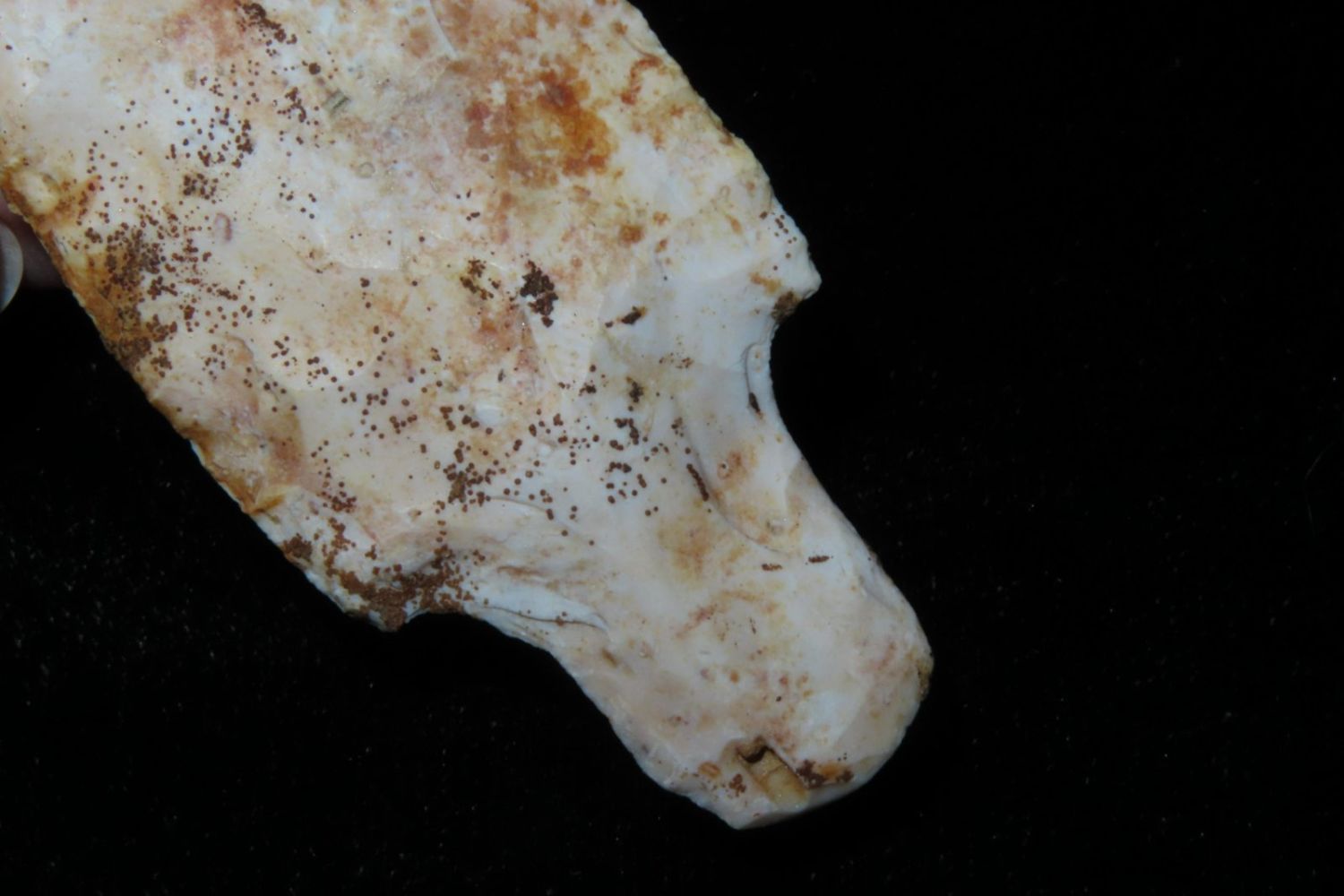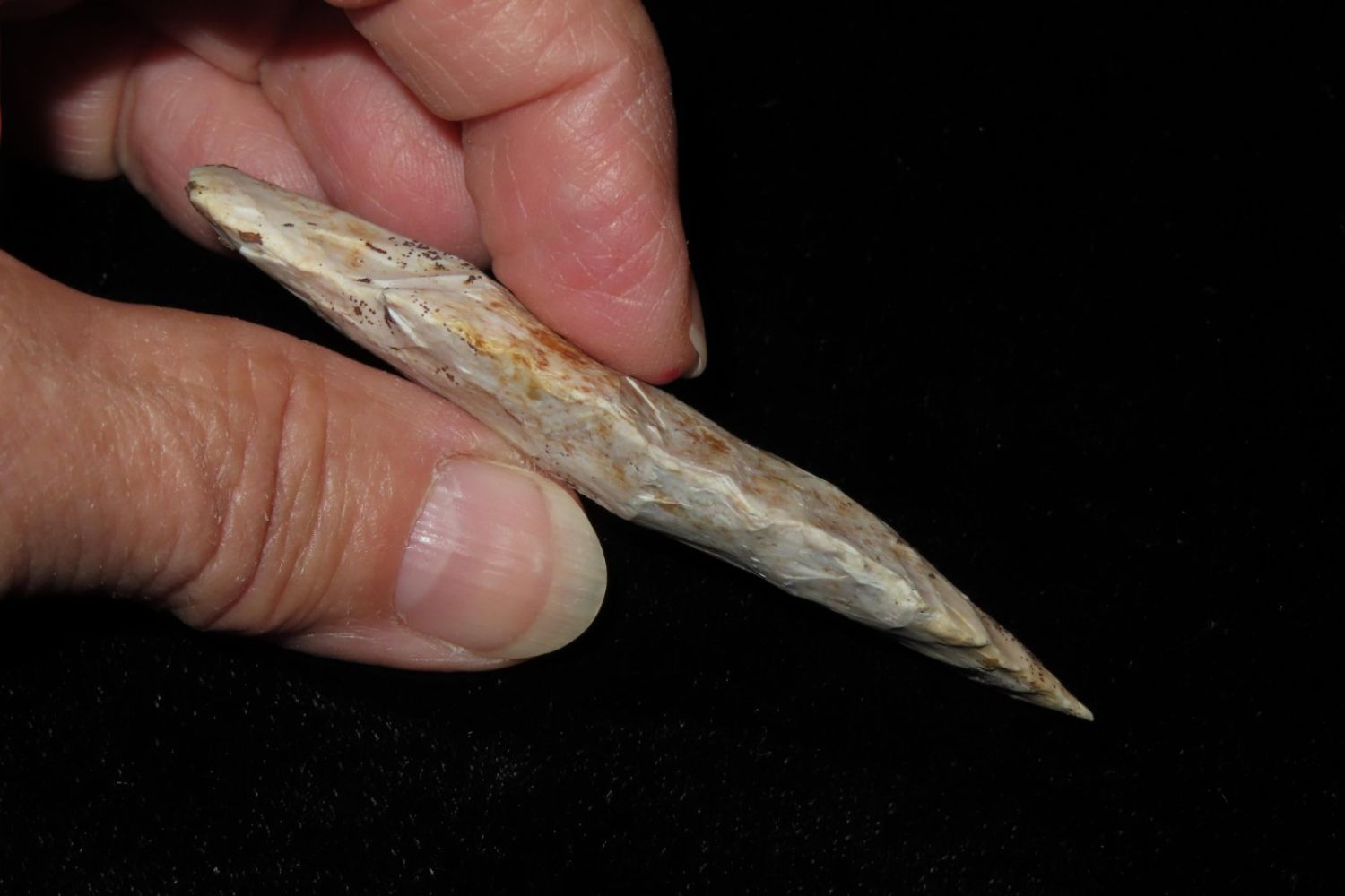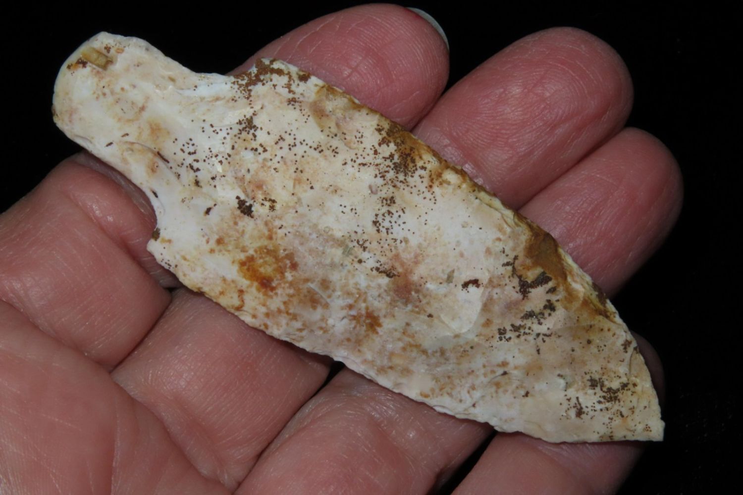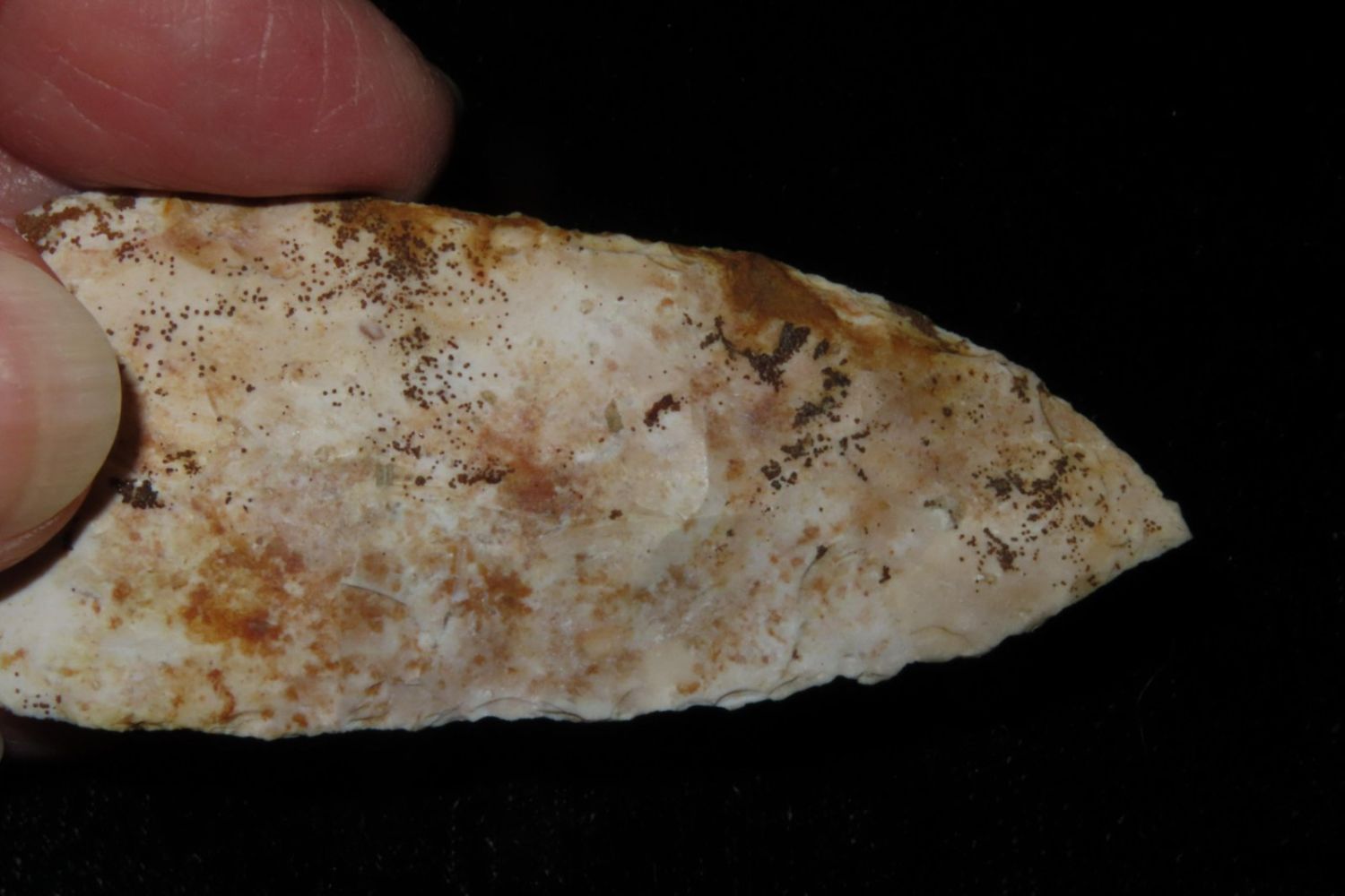 3" Narrow Stemmed Adena. From the James and Joe George Collection. Joe George was an avid collector and finder of Native American artifacts in the greater St Louis Missouri area. Joe collected his entire life. Upon his passing he turned his collection over to his son James. James was also a very avid collector. He enjoyed walking various waterways and attending artifact shows. James is looking forward to passing down his collection to the relic community for caretaking.