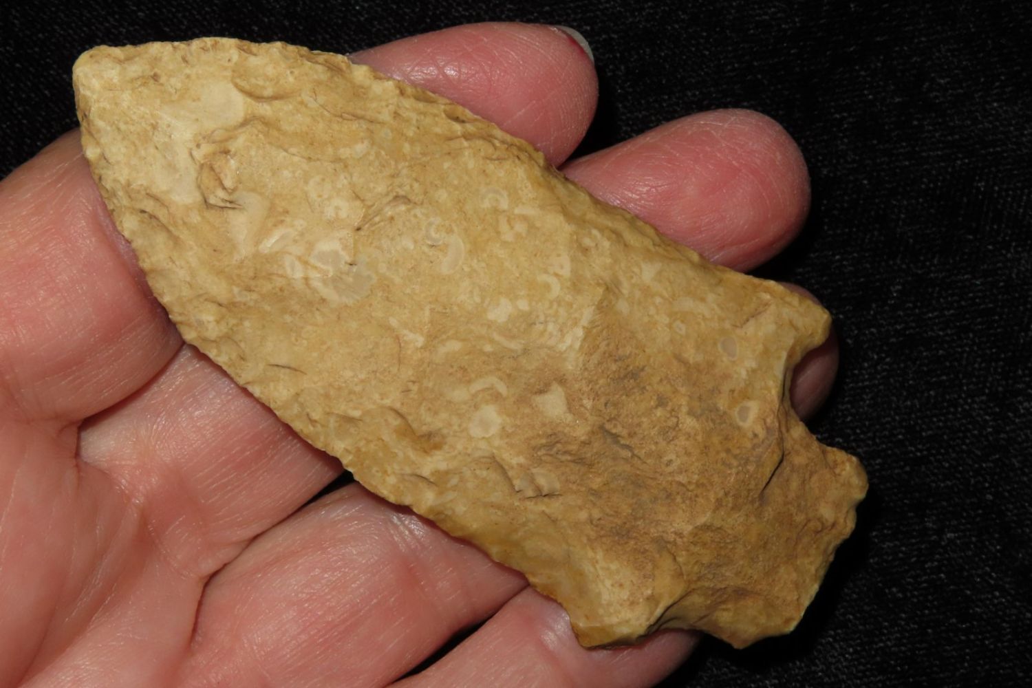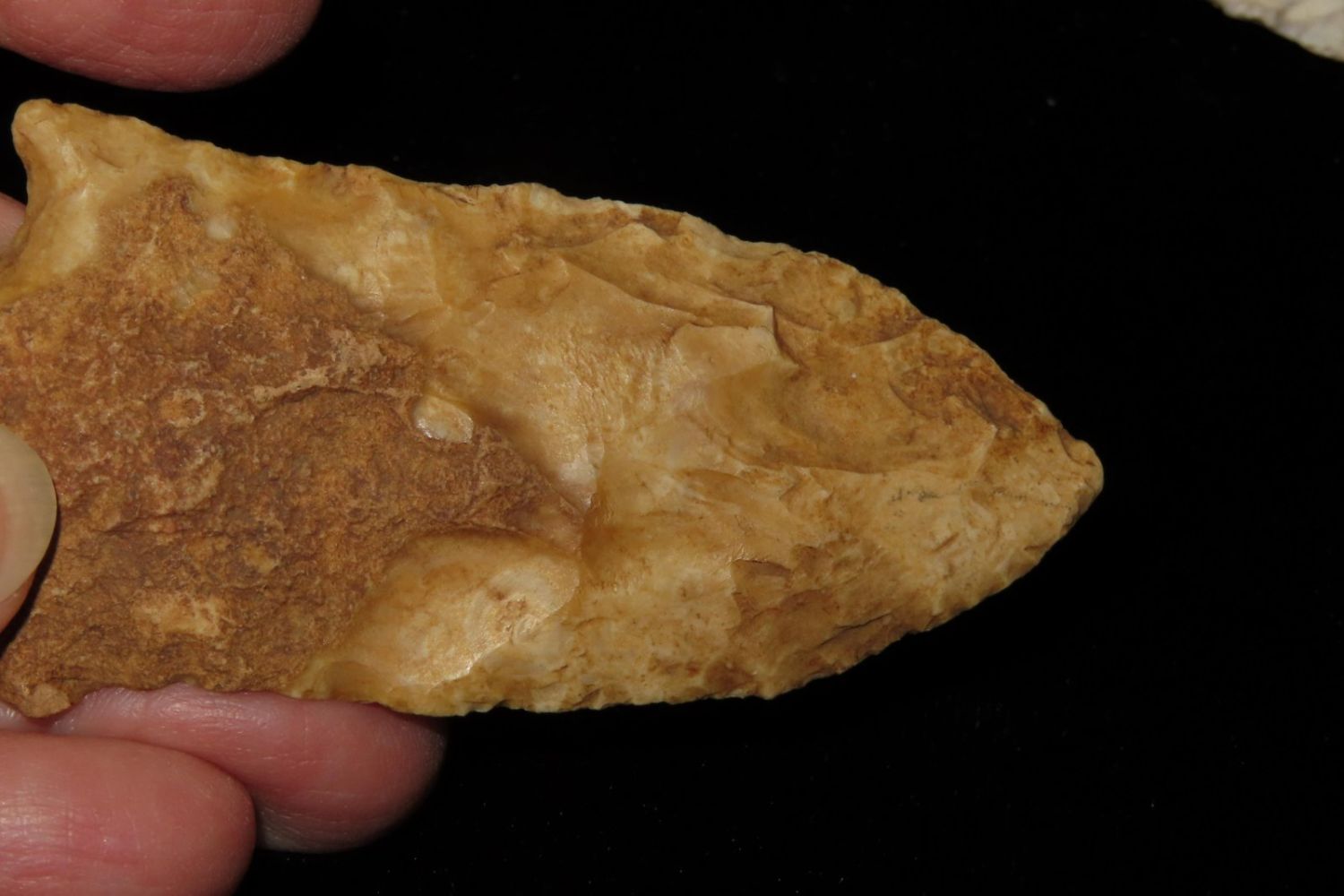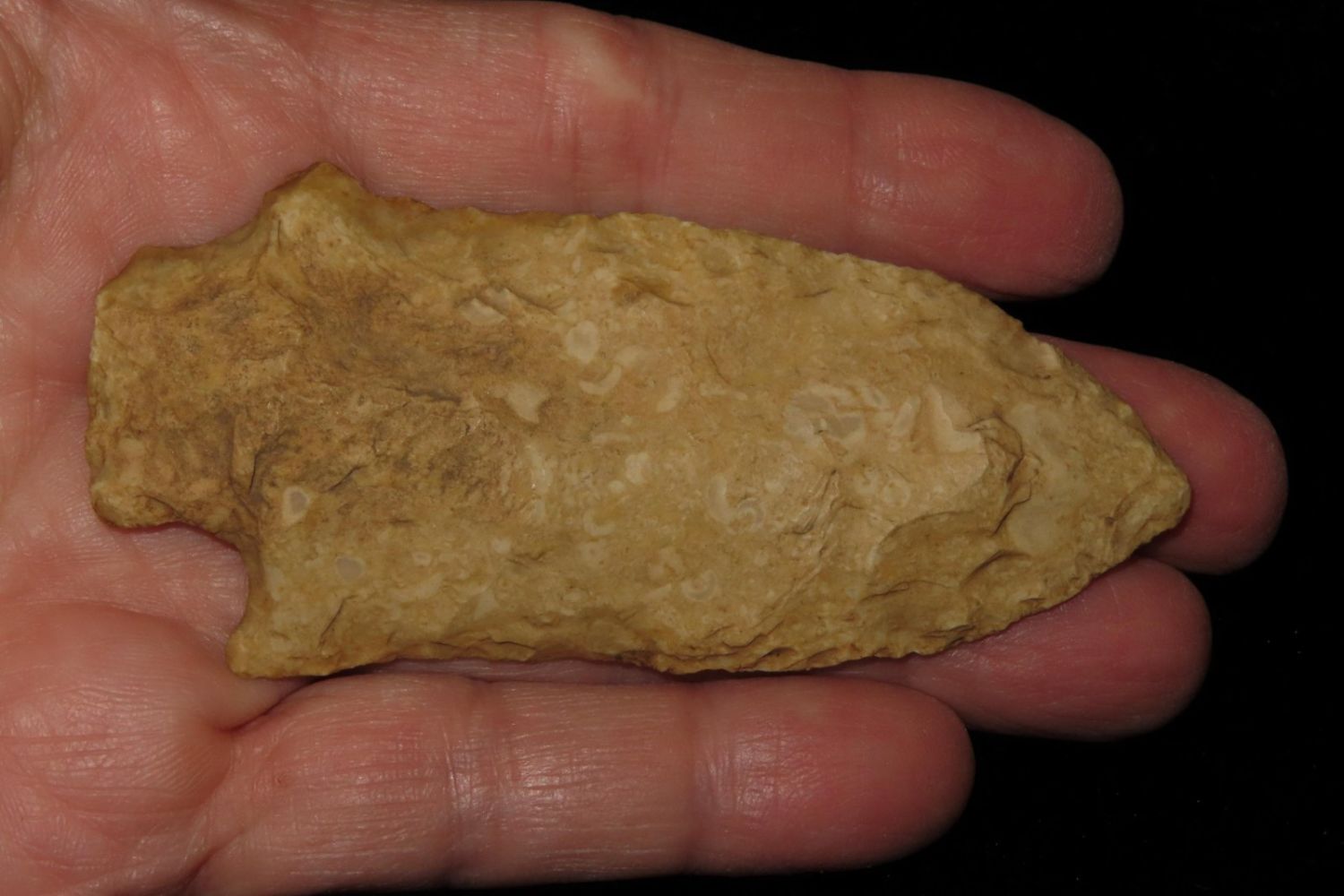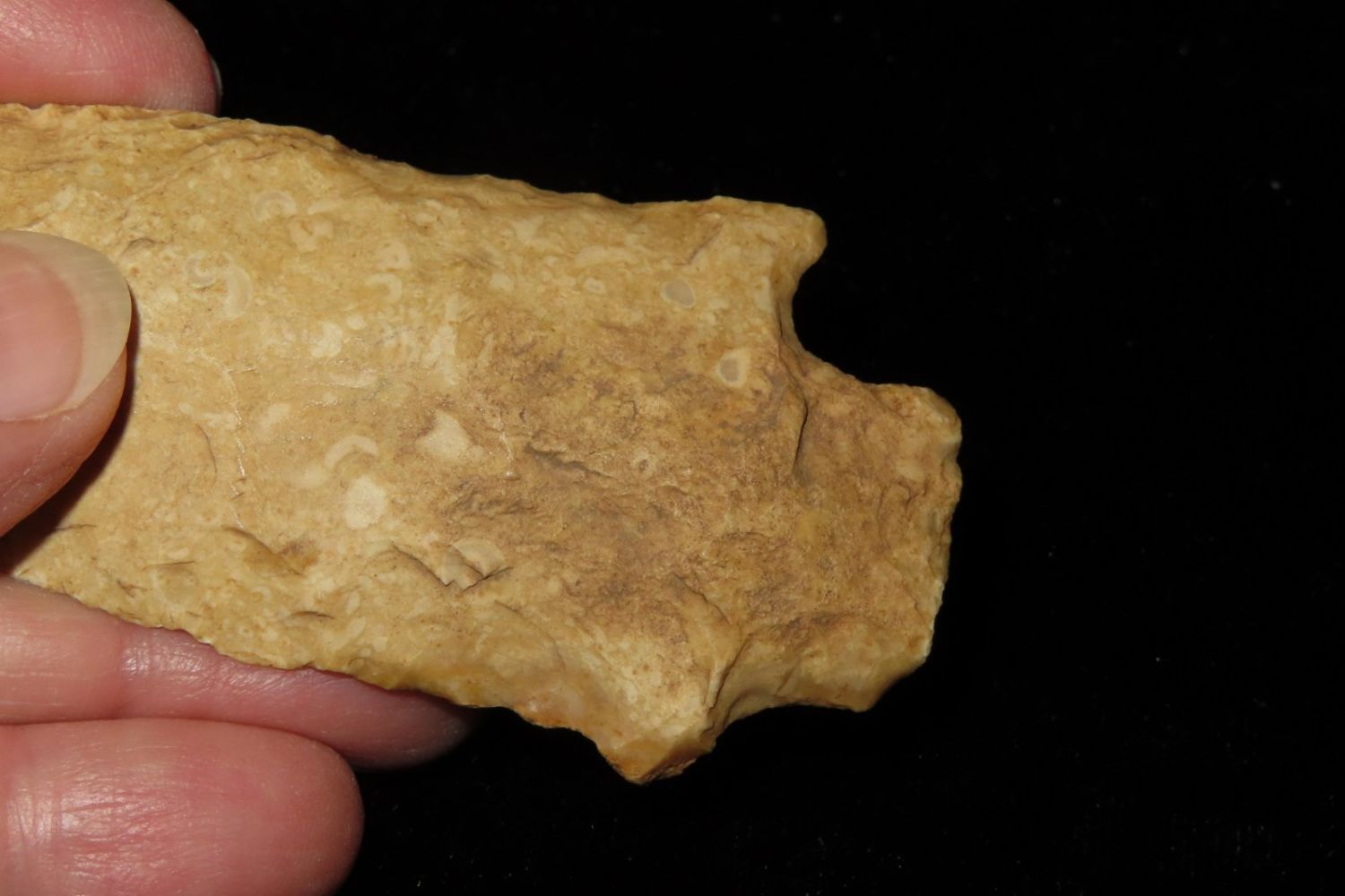 3 1/4" Etley. From the James and Joe George Collection. Joe George was an avid collector and finder of Native American artifacts in the greater St Louis Missouri area. Joe collected his entire life. Upon his passing he turned his collection over to his son James. James was also a very avid collector. He enjoyed walking various waterways and attending artifact shows. James is looking forward to passing down his collection to the relic community for caretaking.