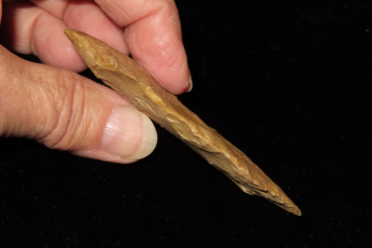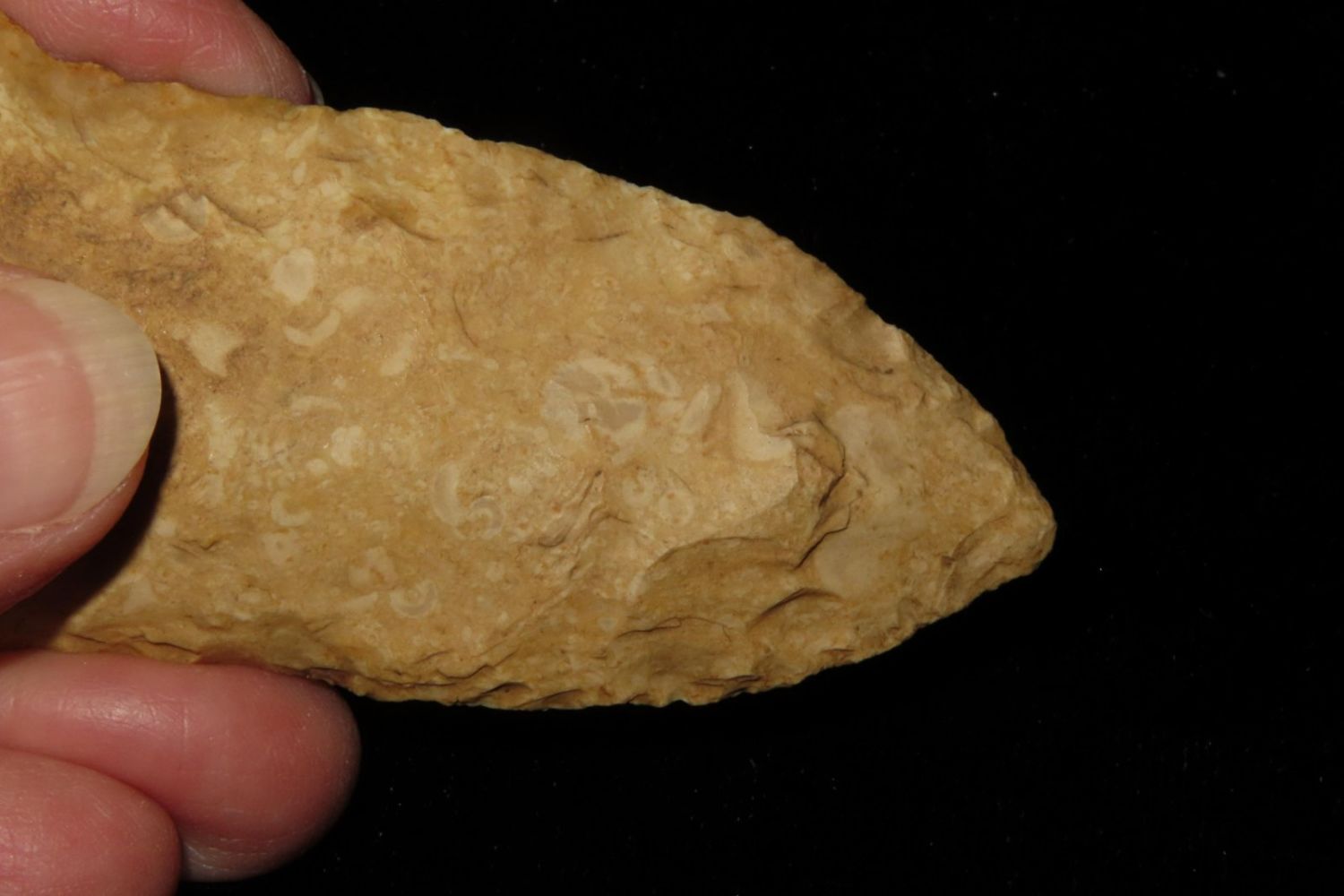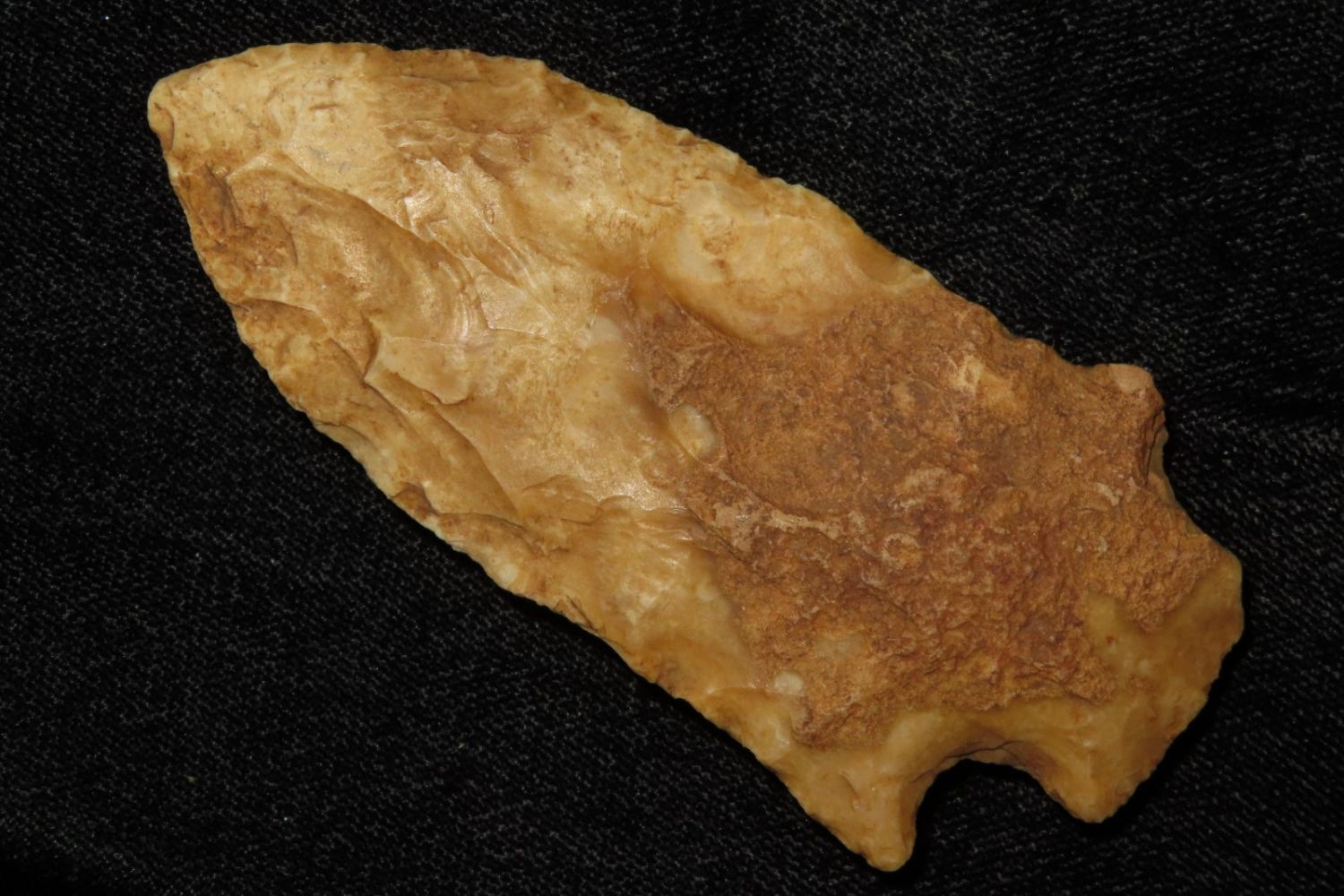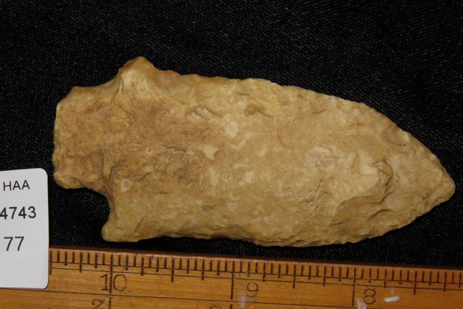 3 1/4" Etley. From the James and Joe George Collection. Joe George was an avid collector and finder of Native American artifacts in the greater St Louis Missouri area. Joe collected his entire life. Upon his passing he turned his collection over to his son James. James was also a very avid collector. He enjoyed walking various waterways and attending artifact shows. James is looking forward to passing down his collection to the relic community for caretaking.