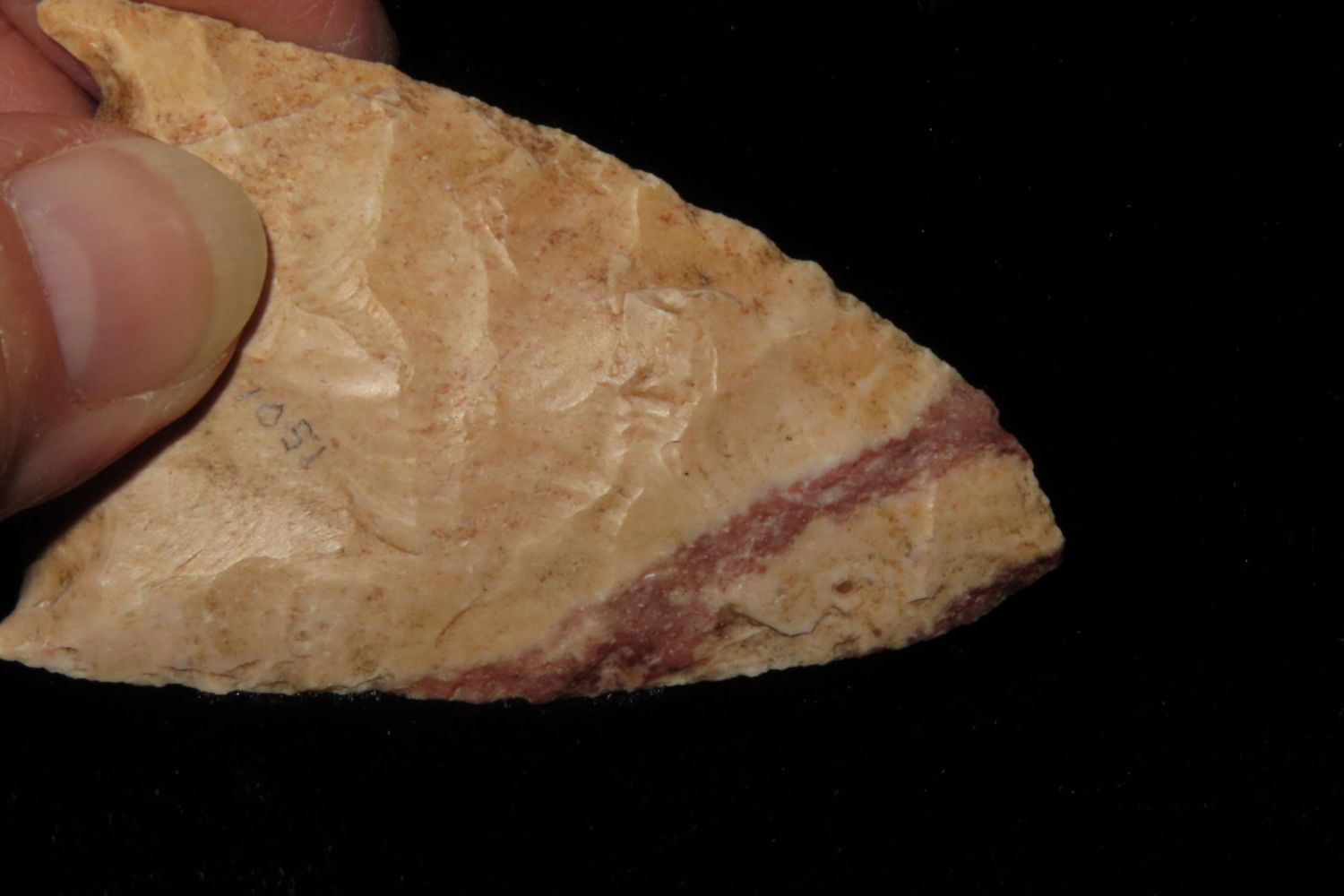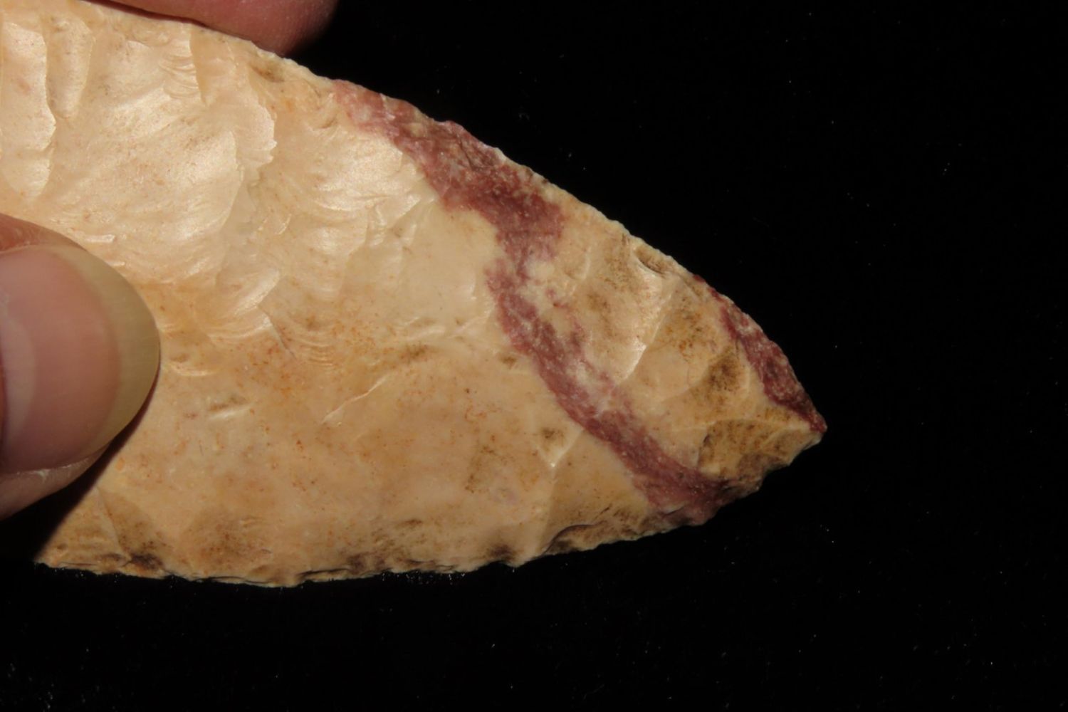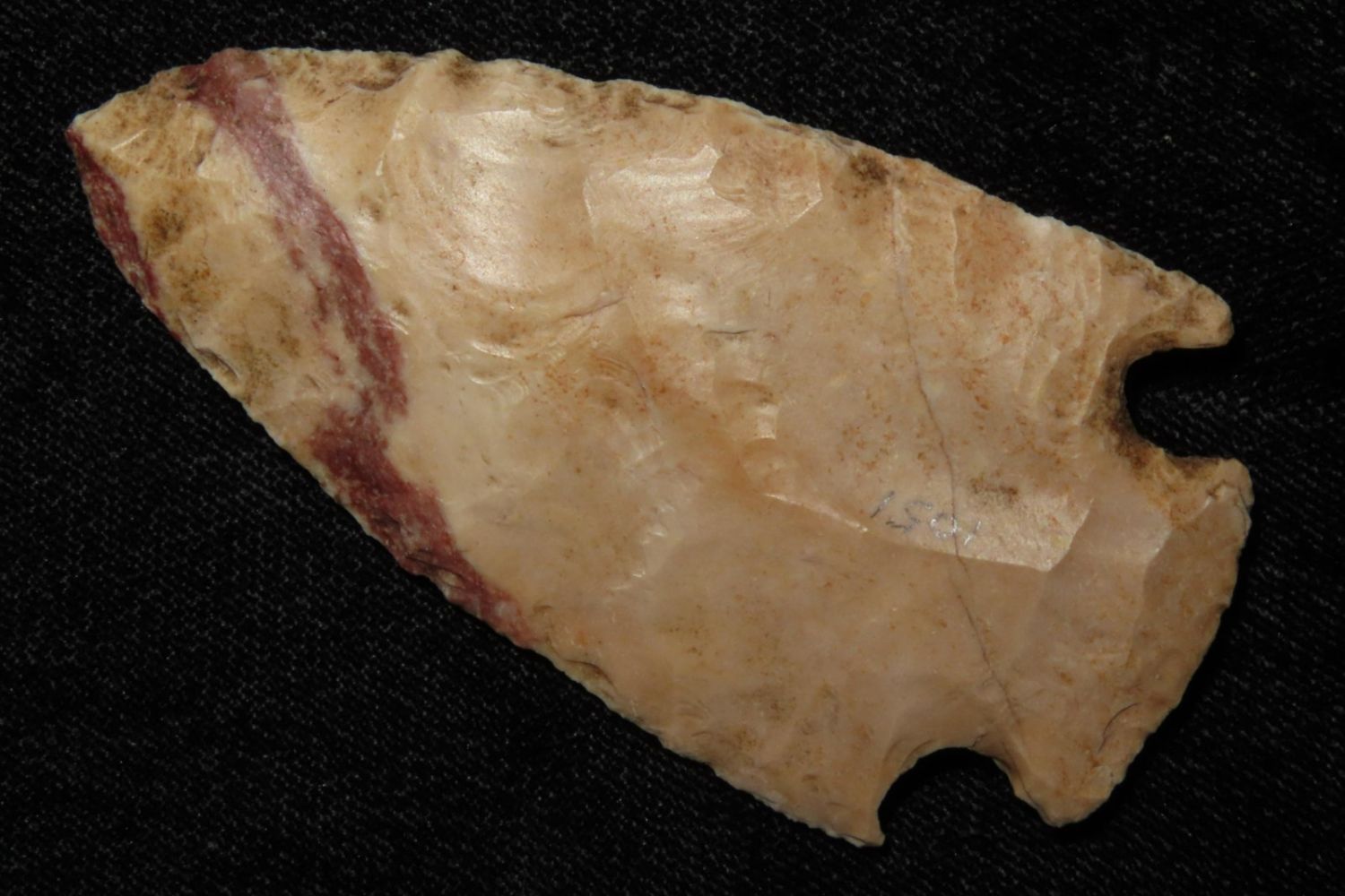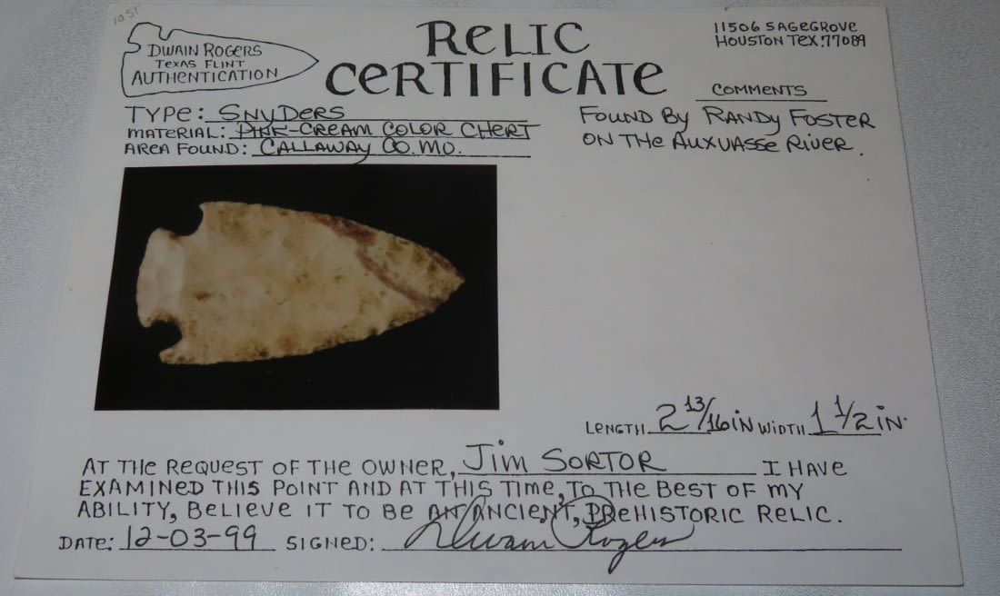 2 7/8" Hopewell Point with beautiful orange and red material. From the James and Joe George Collection. Joe George was an avid collector and finder of Native American artifacts in the greater St Louis Missouri area. Joe collected his entire life. Upon his passing he turned his collection over to his son James. James was also a very avid collector. He enjoyed walking various waterways and attending artifact shows. James is looking forward to passing down his collection to the relic community for caretaking.