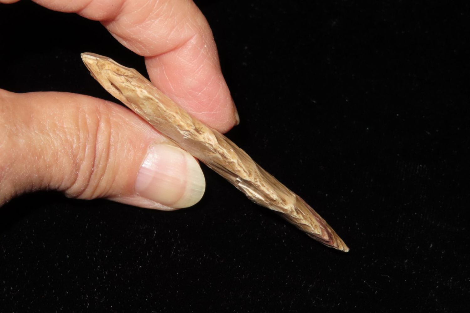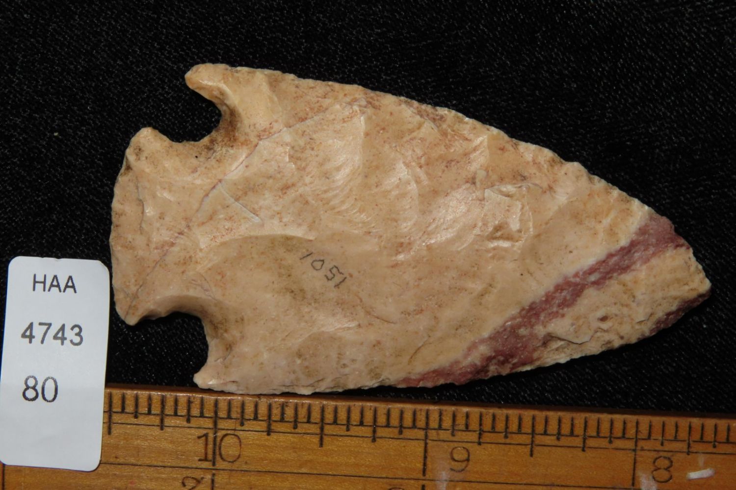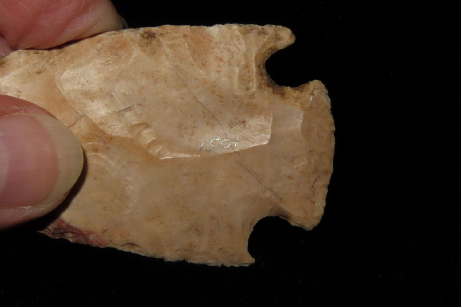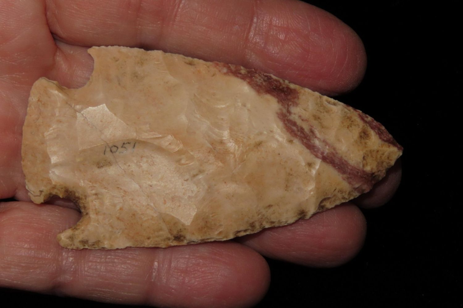 2 7/8" Hopewell Point with beautiful orange and red material. From the James and Joe George Collection. Joe George was an avid collector and finder of Native American artifacts in the greater St Louis Missouri area. Joe collected his entire life. Upon his passing he turned his collection over to his son James. James was also a very avid collector. He enjoyed walking various waterways and attending artifact shows. James is looking forward to passing down his collection to the relic community for caretaking.