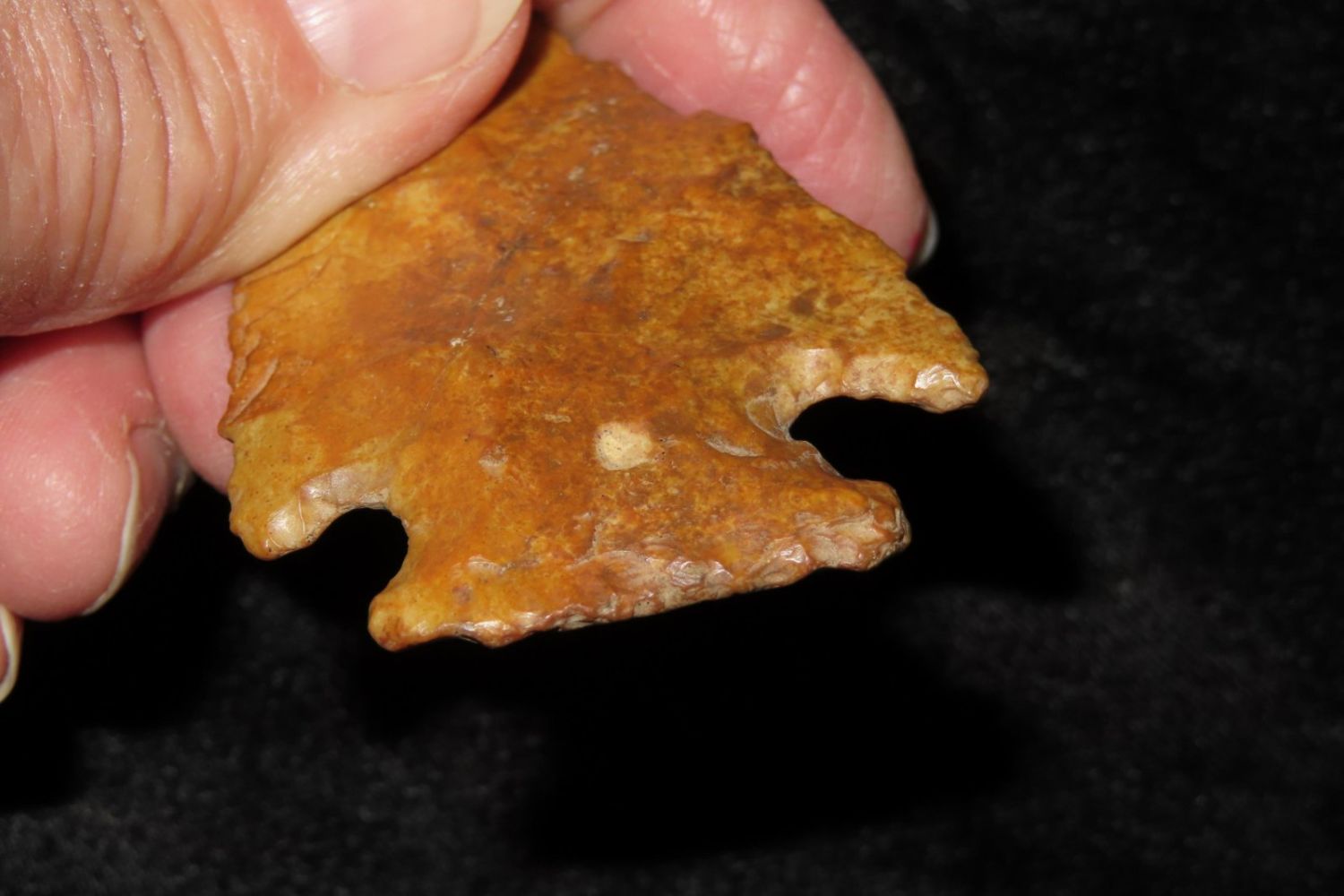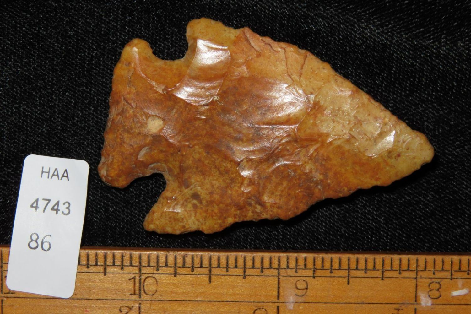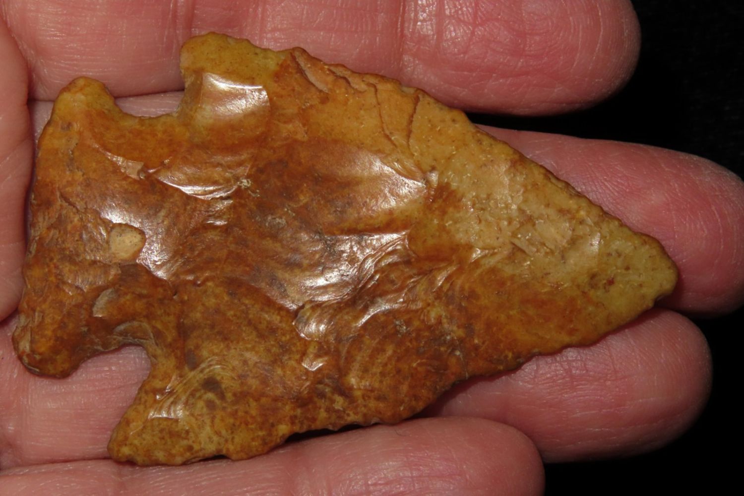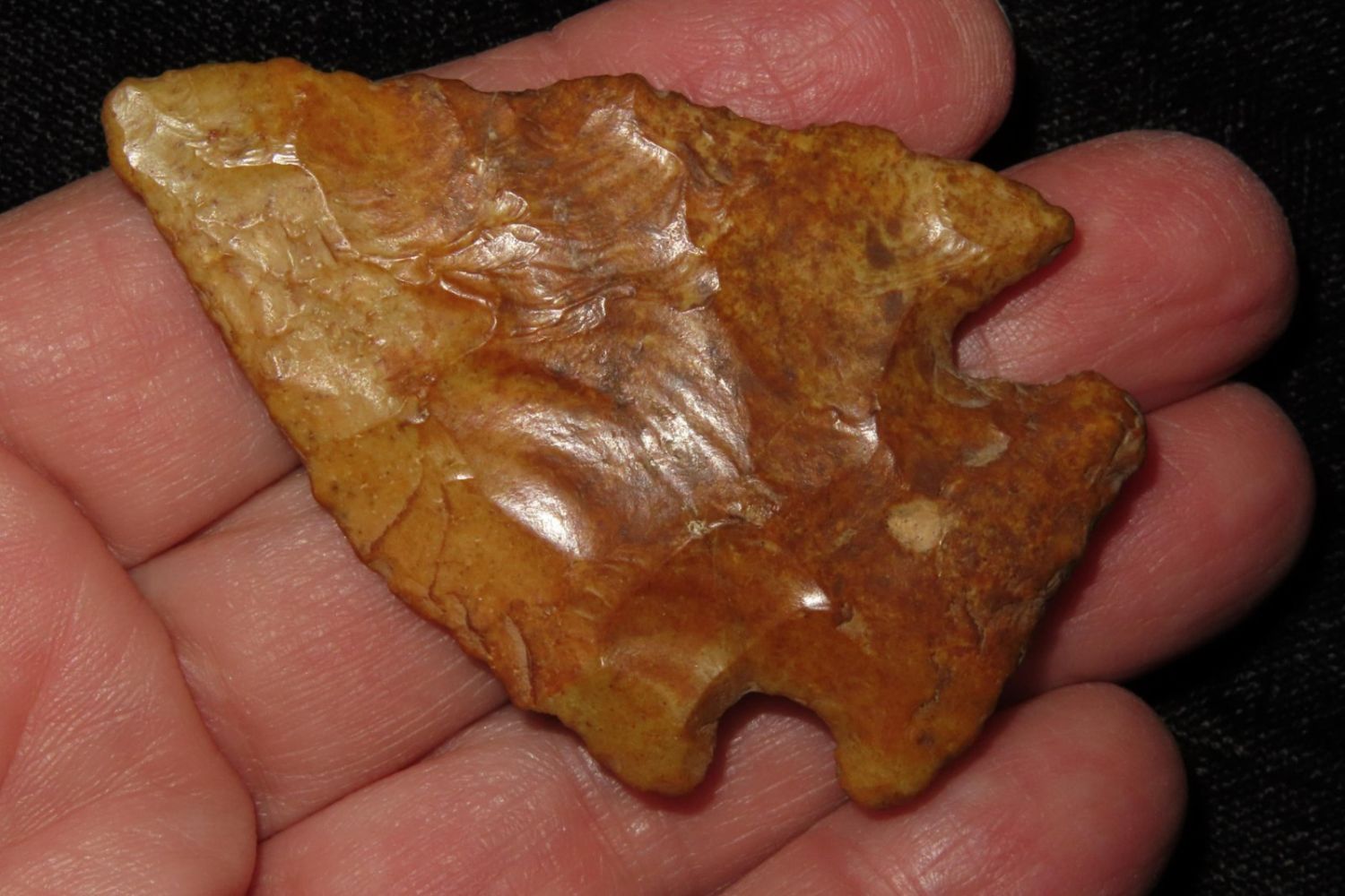 3 2/8" River Polished Kirk Corner Notch. From the James and Joe George Collection. Joe George was an avid collector and finder of Native American artifacts in the greater St Louis Missouri area. Joe collected his entire life. Upon his passing he turned his collection over to his son James. James was also a very avid collector. He enjoyed walking various waterways and attending artifact shows. James is looking forward to passing down his collection to the relic community for caretaking.