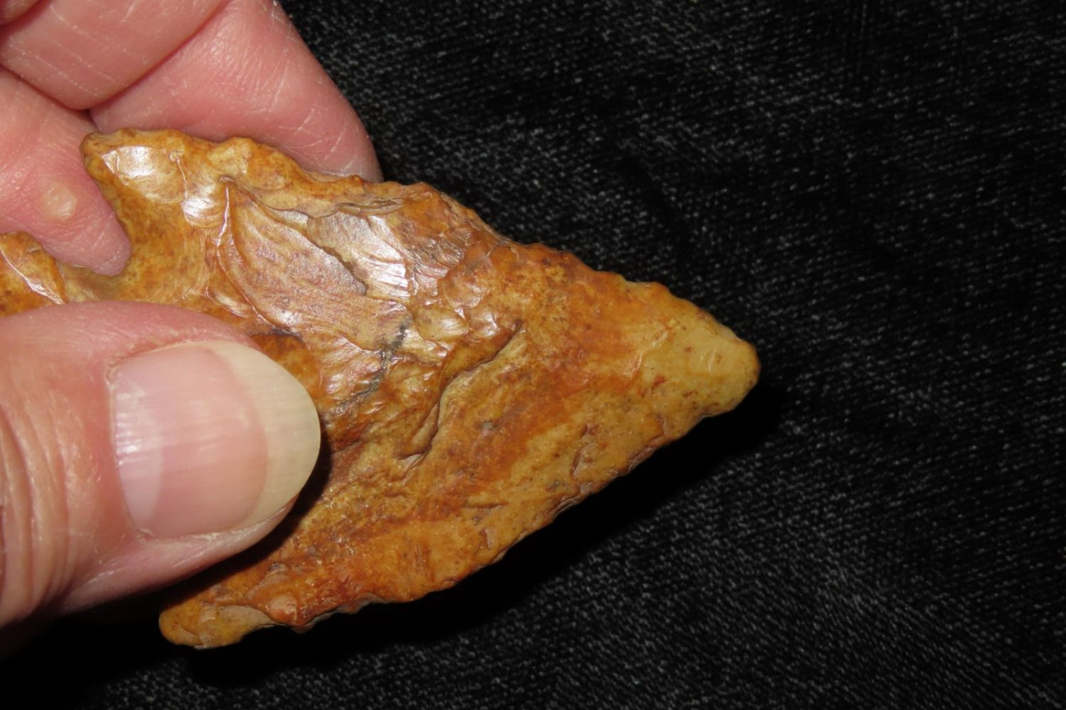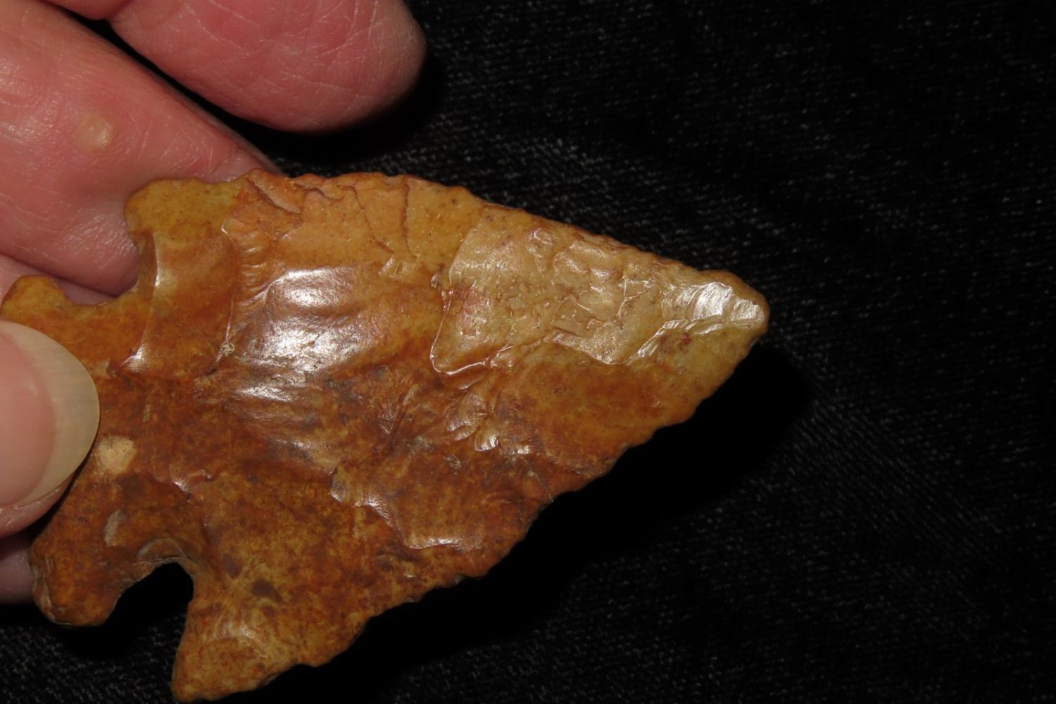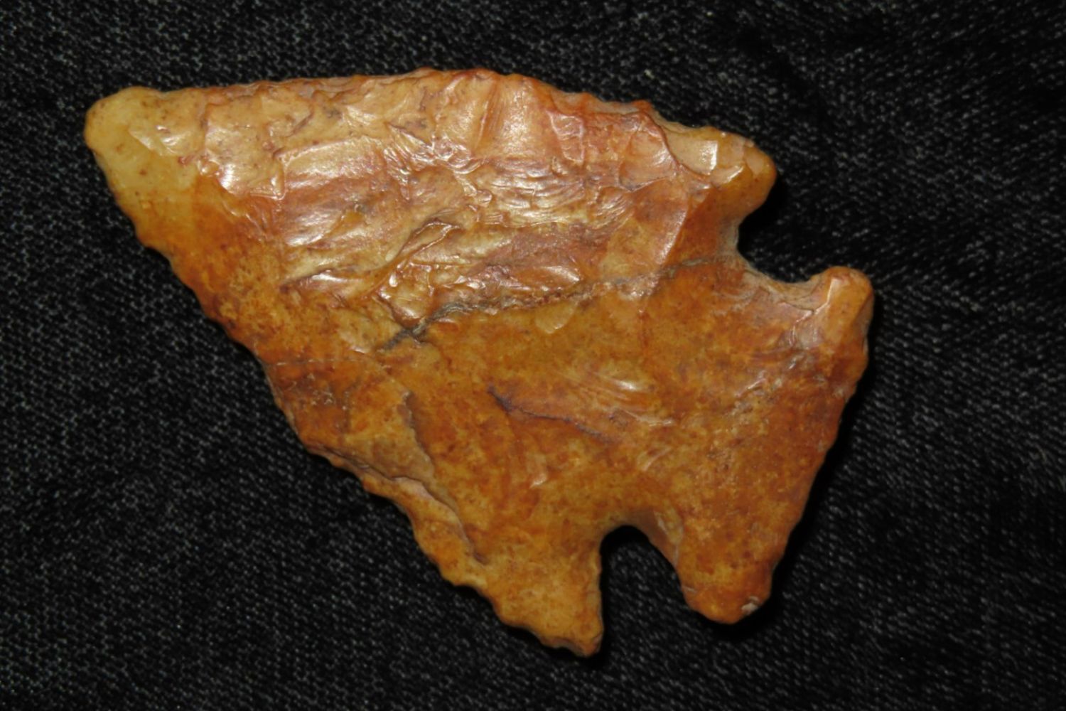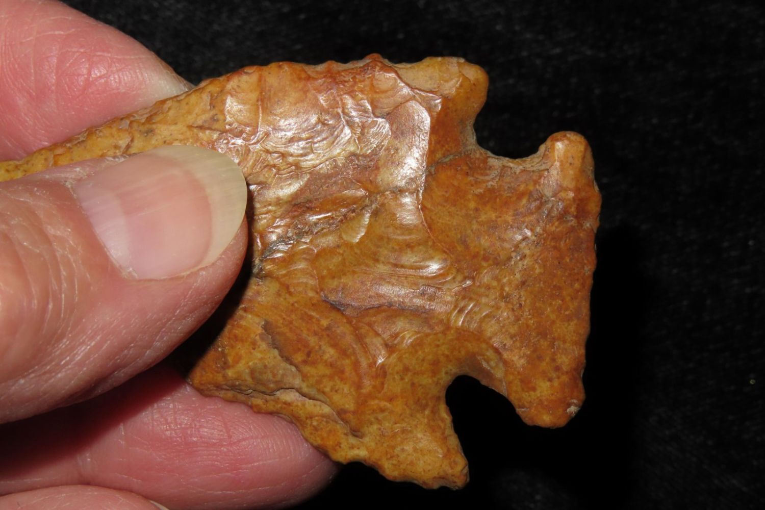 3 2/8" River Polished Kirk Corner Notch. From the James and Joe George Collection. Joe George was an avid collector and finder of Native American artifacts in the greater St Louis Missouri area. Joe collected his entire life. Upon his passing he turned his collection over to his son James. James was also a very avid collector. He enjoyed walking various waterways and attending artifact shows. James is looking forward to passing down his collection to the relic community for caretaking.