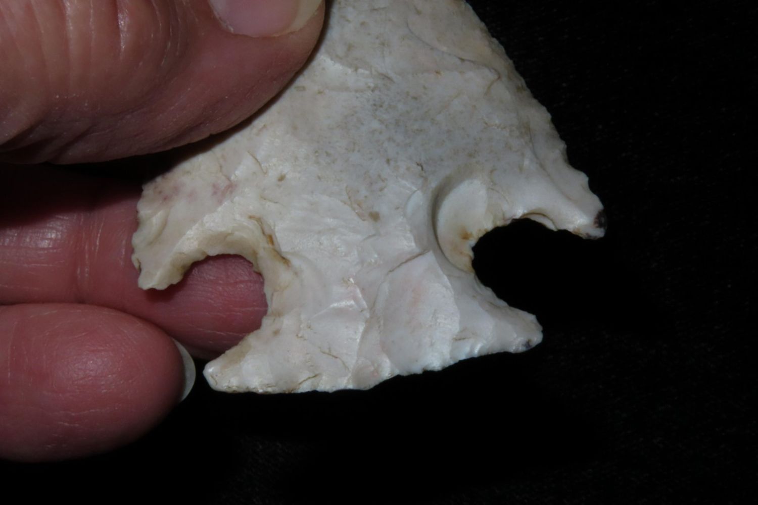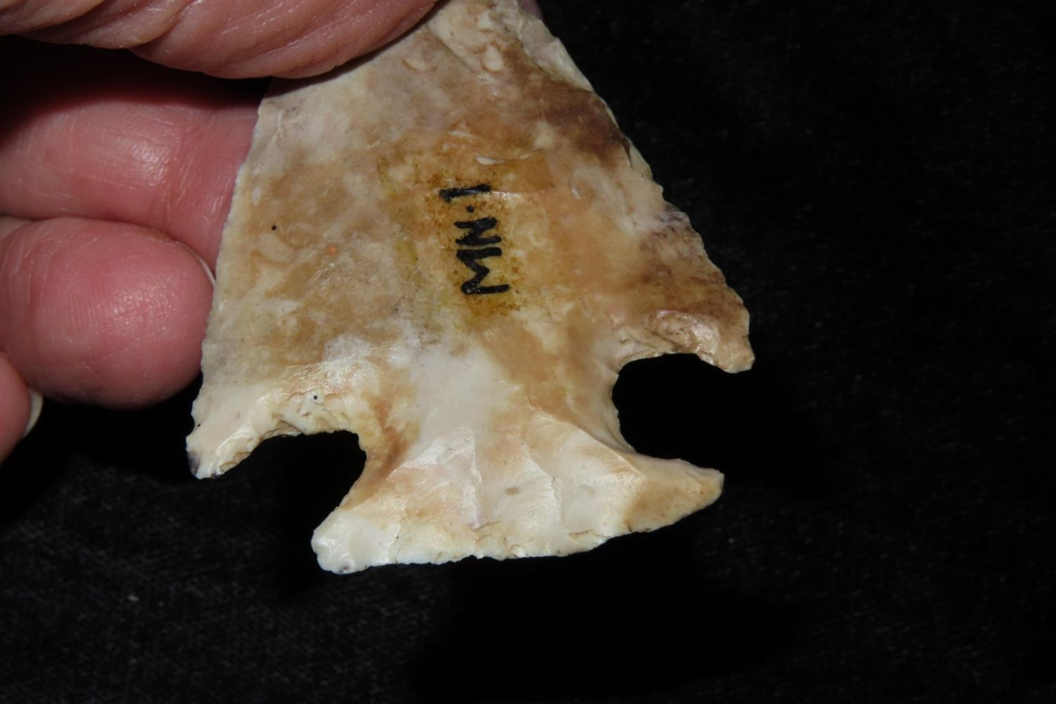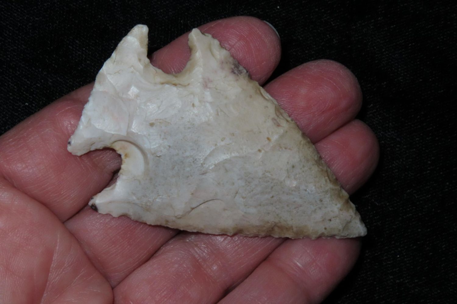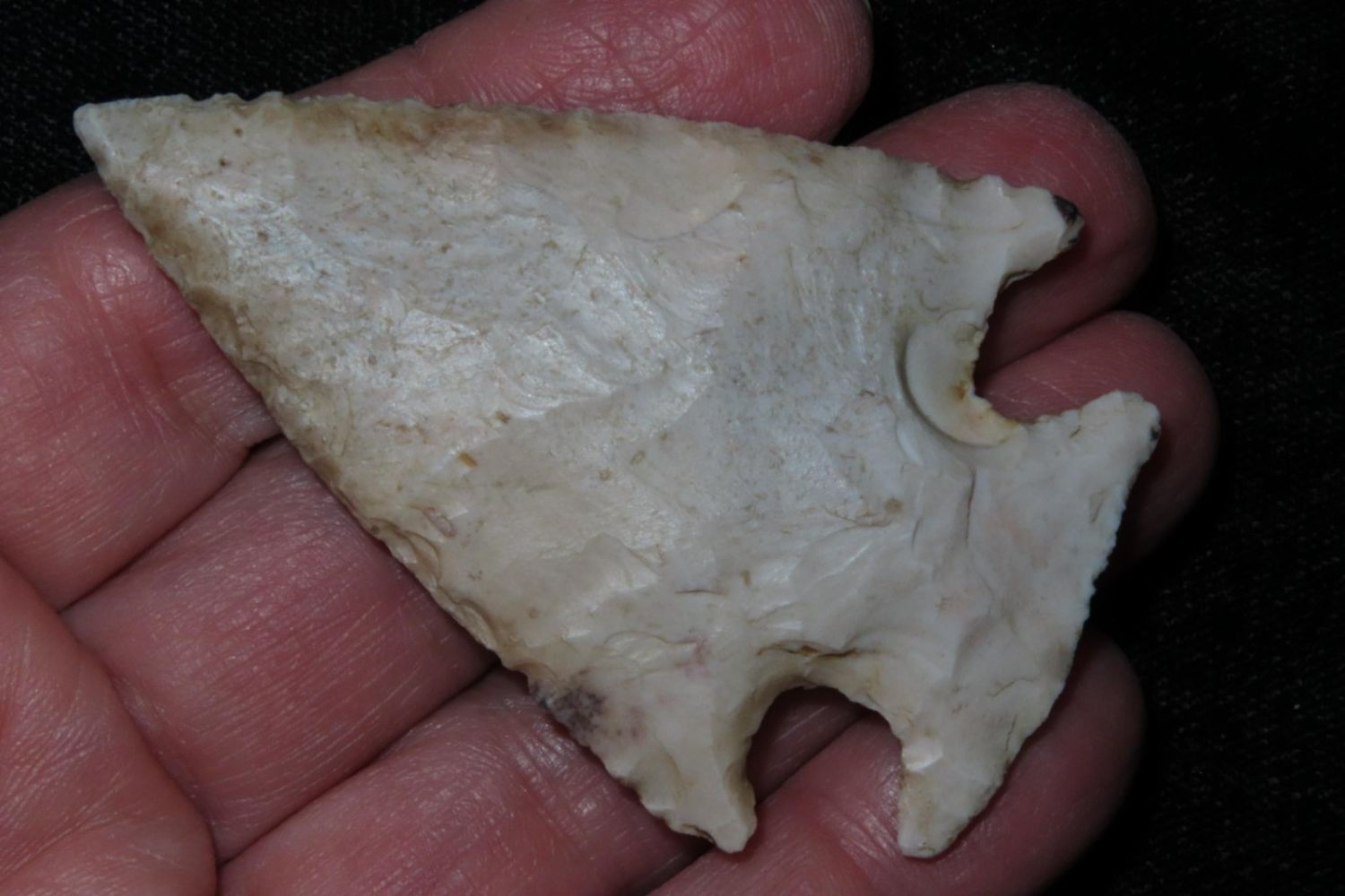 2 1/2" Snyders with wonder intact ears. From the James and Joe George Collection. Joe George was an avid collector and finder of Native American artifacts in the greater St Louis Missouri area. Joe collected his entire life. Upon his passing he turned his collection over to his son James. James was also a very avid collector. He enjoyed walking various waterways and attending artifact shows. James is looking forward to passing down his collection to the relic community for caretaking.