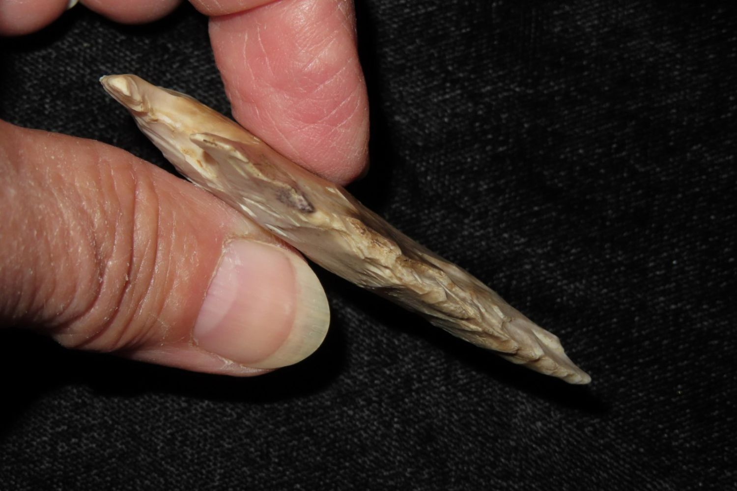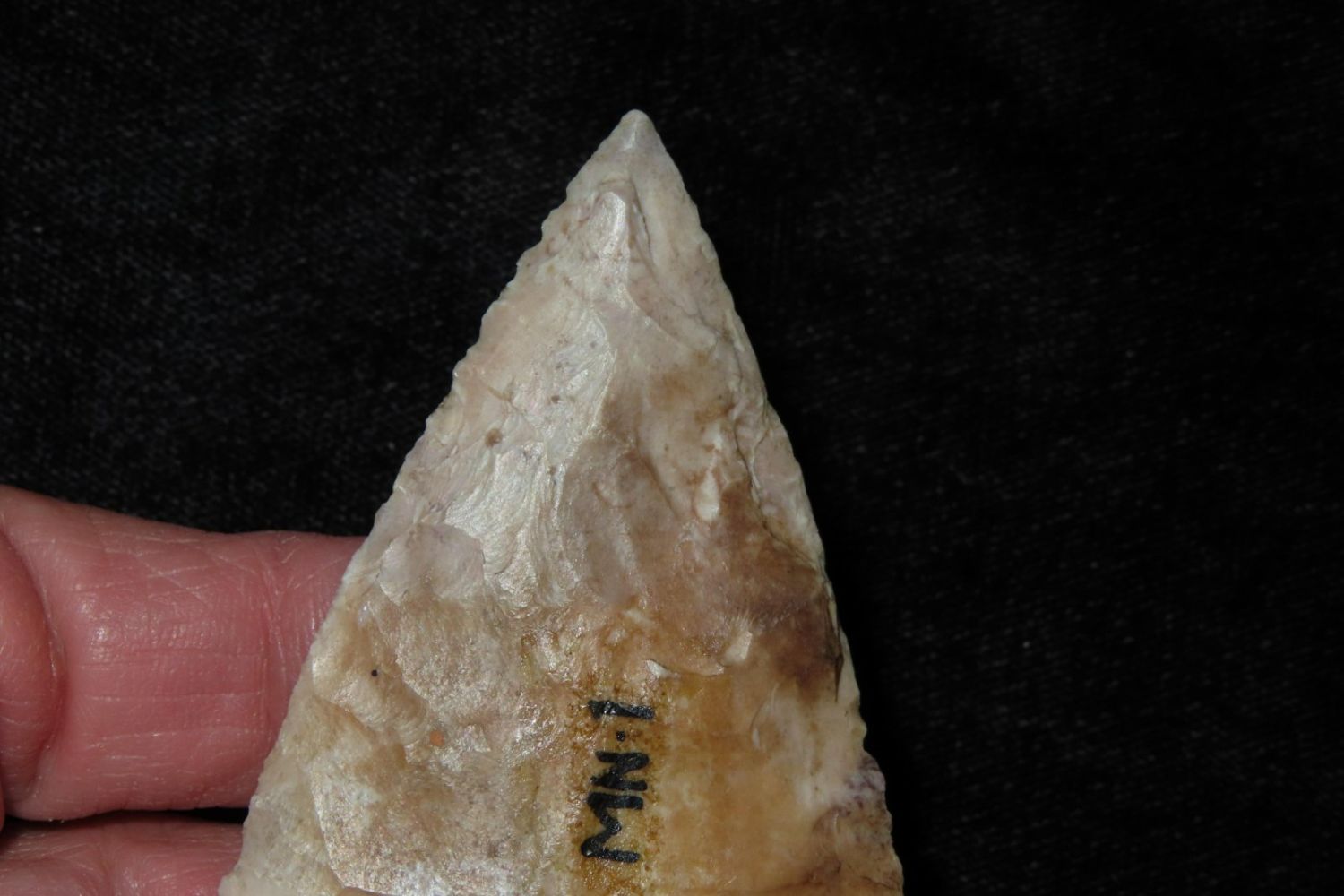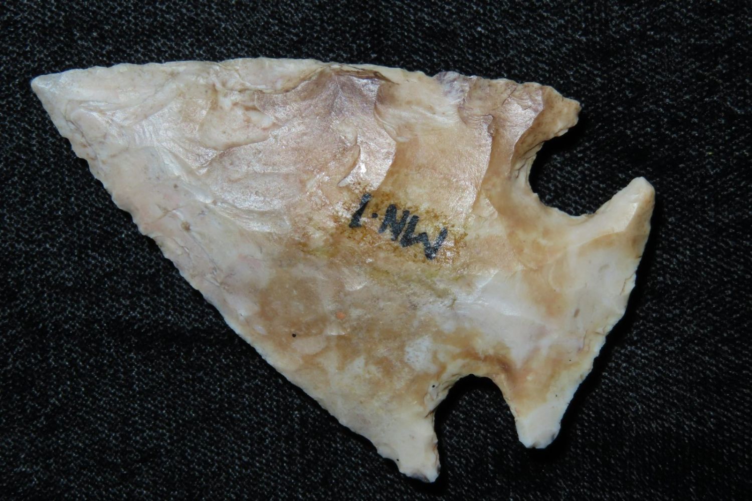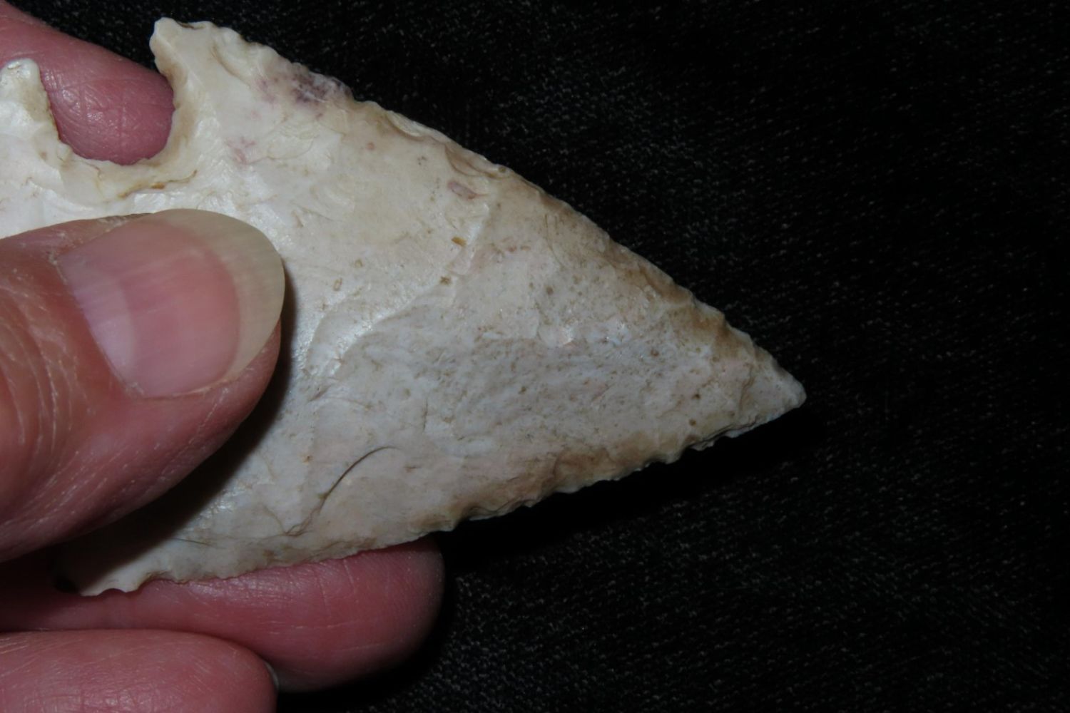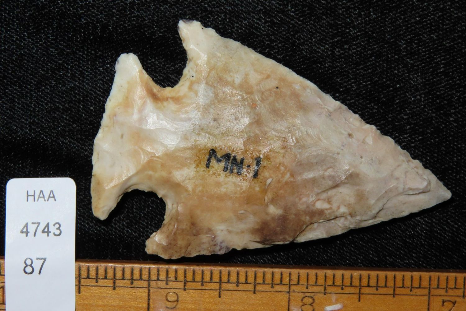 2 1/2" Snyders with wonder intact ears. From the James and Joe George Collection. Joe George was an avid collector and finder of Native American artifacts in the greater St Louis Missouri area. Joe collected his entire life. Upon his passing he turned his collection over to his son James. James was also a very avid collector. He enjoyed walking various waterways and attending artifact shows. James is looking forward to passing down his collection to the relic community for caretaking.