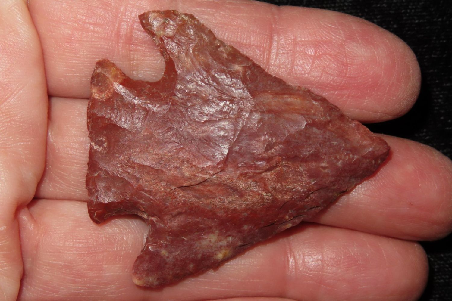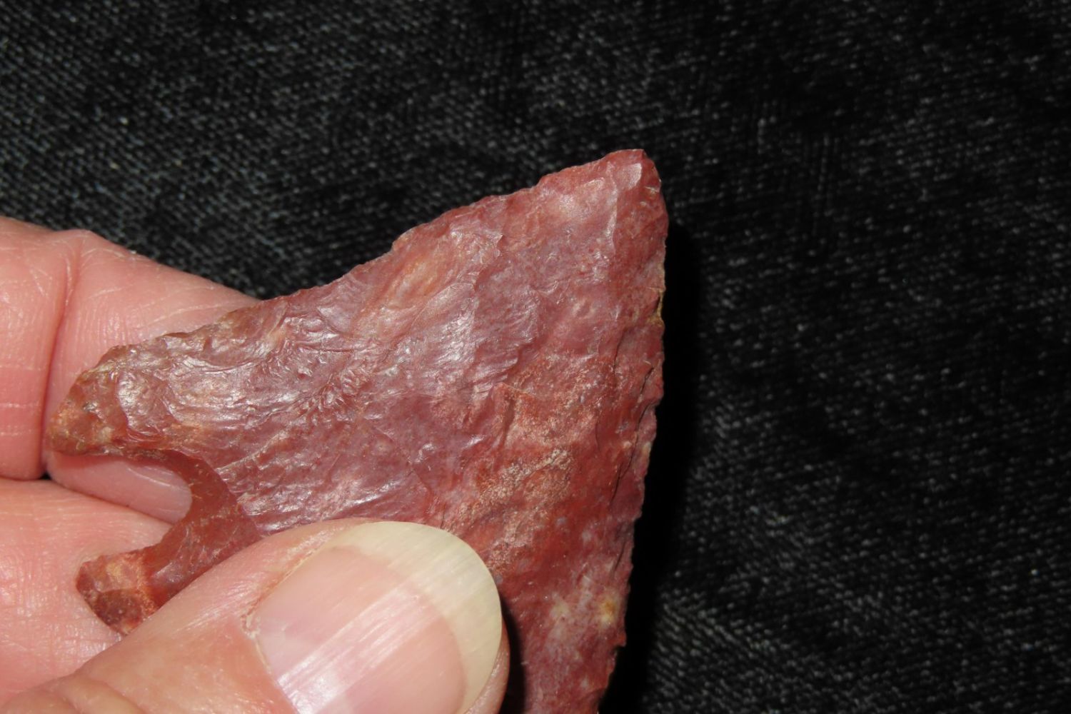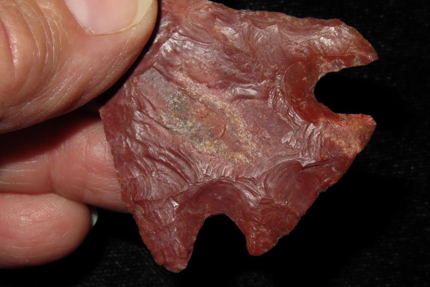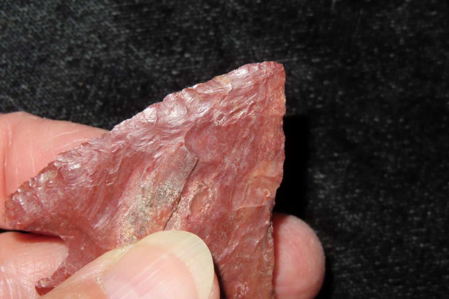 1 7/8" Snyders made from amazing blood red Burlington. From the James and Joe George Collection. Joe George was an avid collector and finder of Native American artifacts in the greater St Louis Missouri area. Joe collected his entire life. Upon his passing he turned his collection over to his son James. James was also a very avid collector. He enjoyed walking various waterways and attending artifact shows. James is looking forward to passing down his collection to the relic community for caretaking.