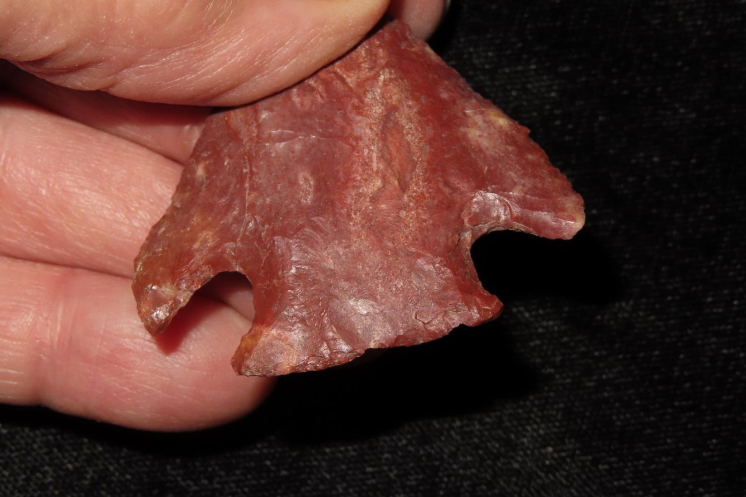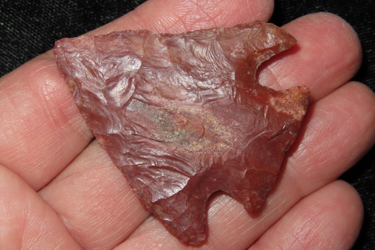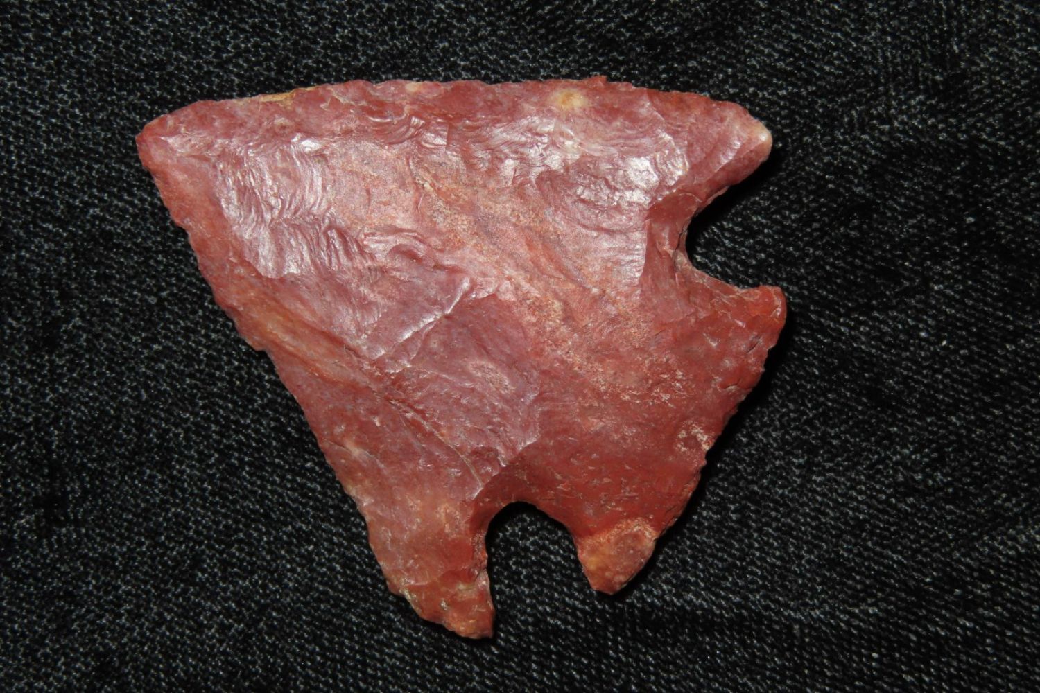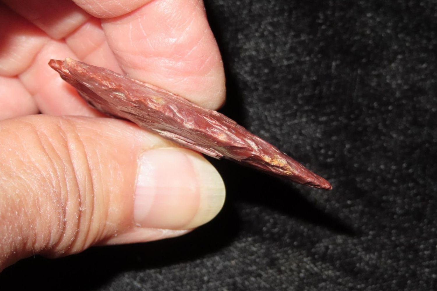 1 7/8" Snyders made from amazing blood red Burlington. From the James and Joe George Collection. Joe George was an avid collector and finder of Native American artifacts in the greater St Louis Missouri area. Joe collected his entire life. Upon his passing he turned his collection over to his son James. James was also a very avid collector. He enjoyed walking various waterways and attending artifact shows. James is looking forward to passing down his collection to the relic community for caretaking.