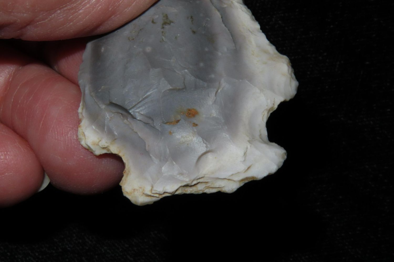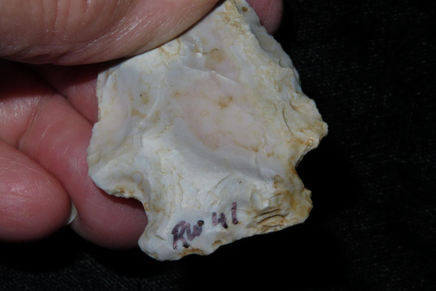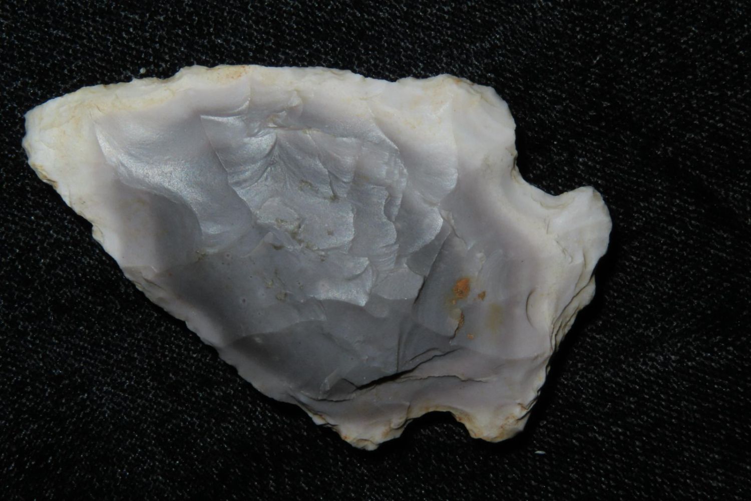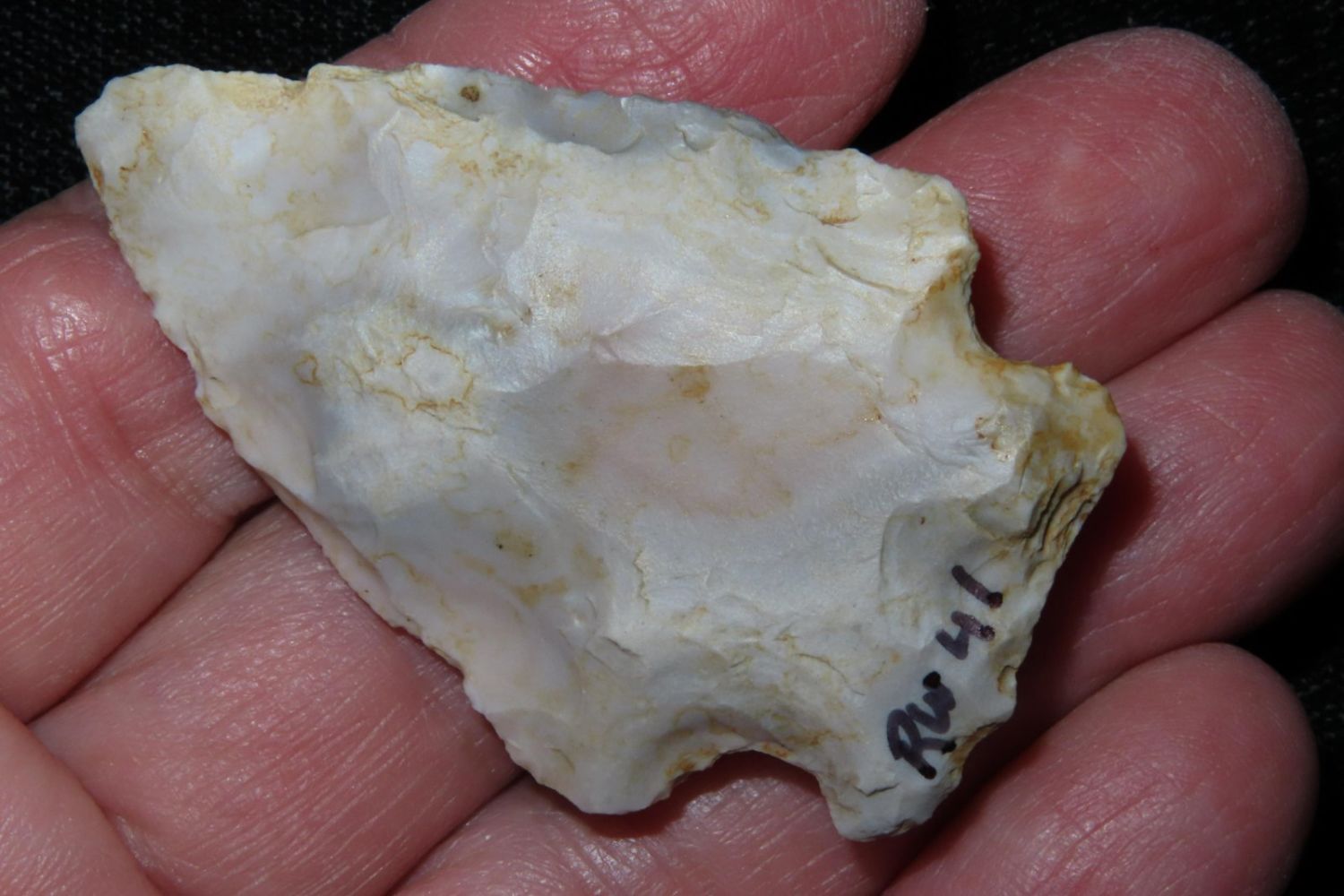 2" Rice Lobbed found by Richard Whittle. From the James and Joe George Collection. Joe George was an avid collector and finder of Native American artifacts in the greater St Louis Missouri area. Joe collected his entire life. Upon his passing he turned his collection over to his son James. James was also a very avid collector. He enjoyed walking various waterways and attending artifact shows. James is looking forward to passing down his collection to the relic community for caretaking.