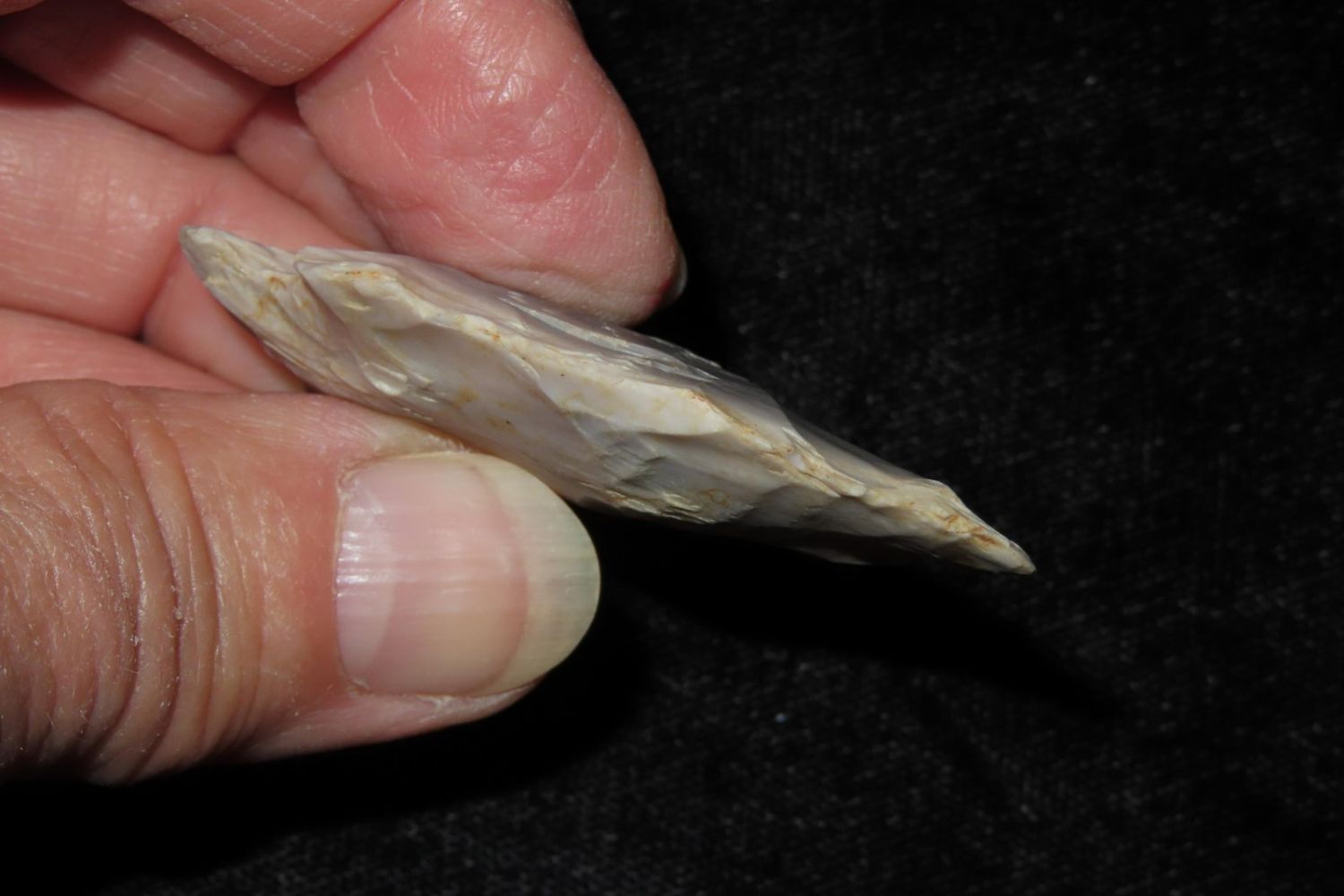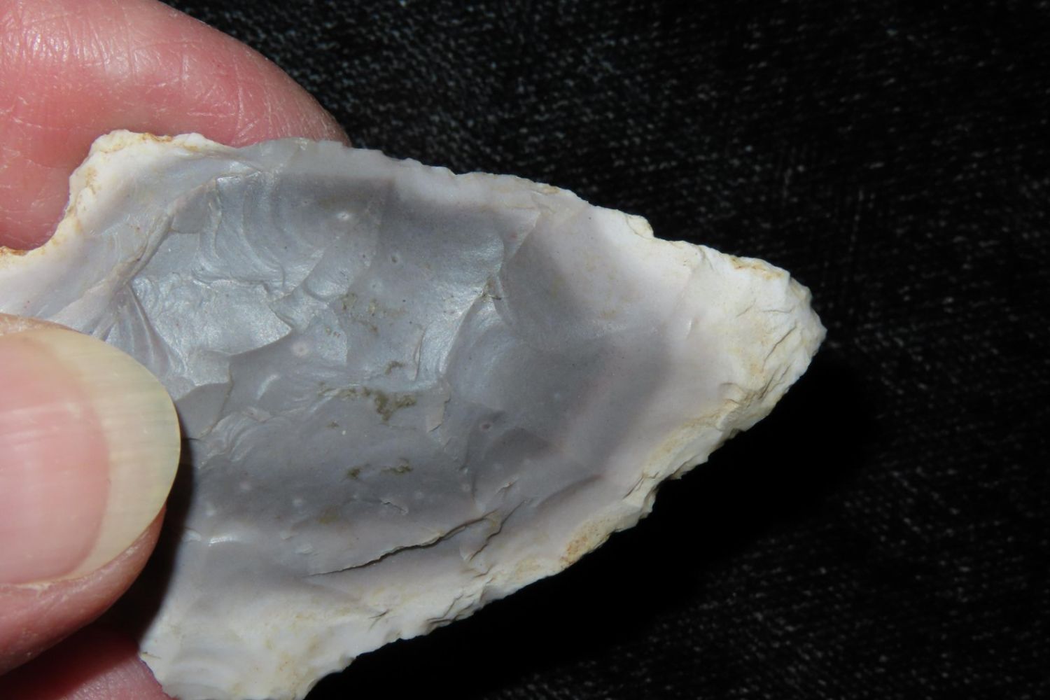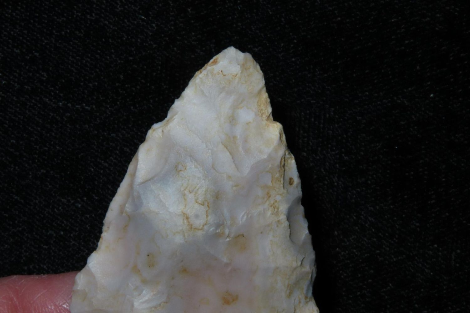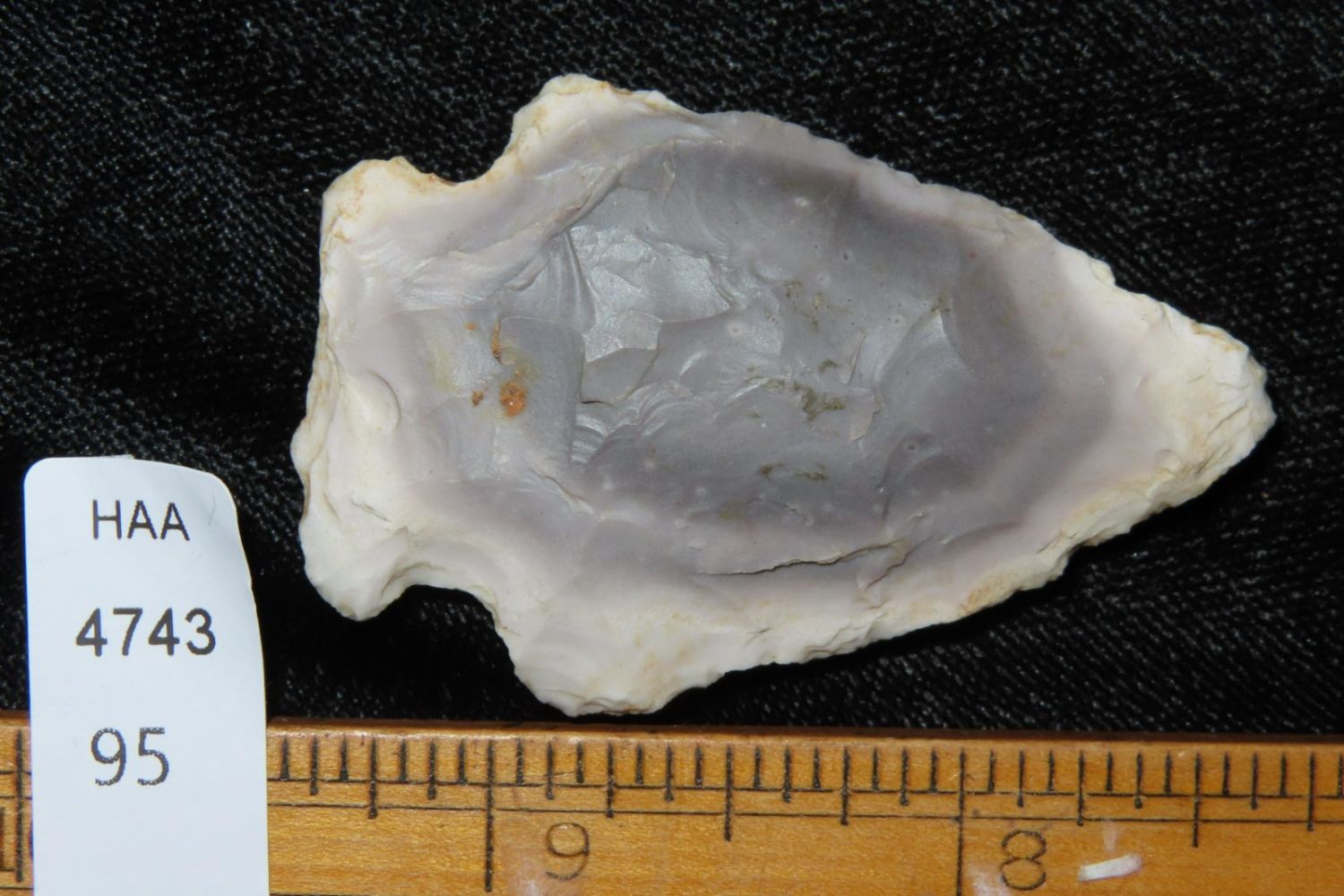 2" Rice Lobbed found by Richard Whittle. From the James and Joe George Collection. Joe George was an avid collector and finder of Native American artifacts in the greater St Louis Missouri area. Joe collected his entire life. Upon his passing he turned his collection over to his son James. James was also a very avid collector. He enjoyed walking various waterways and attending artifact shows. James is looking forward to passing down his collection to the relic community for caretaking.