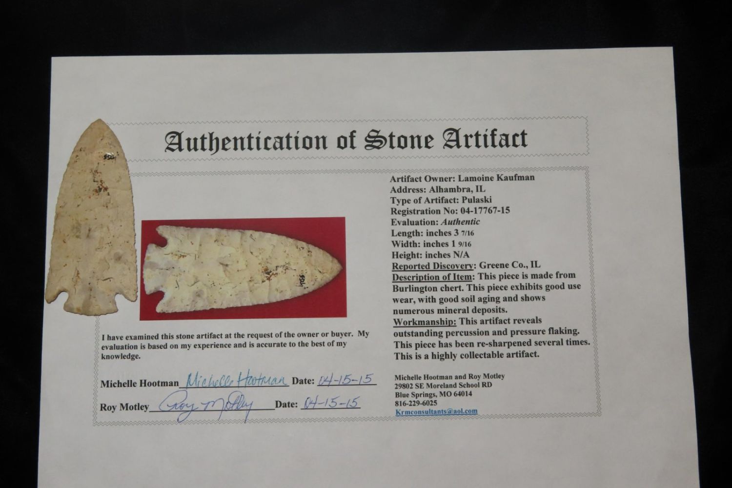 3 7/16″ Pulaski, Motley COA, Greene Co IL, Burlington Chert