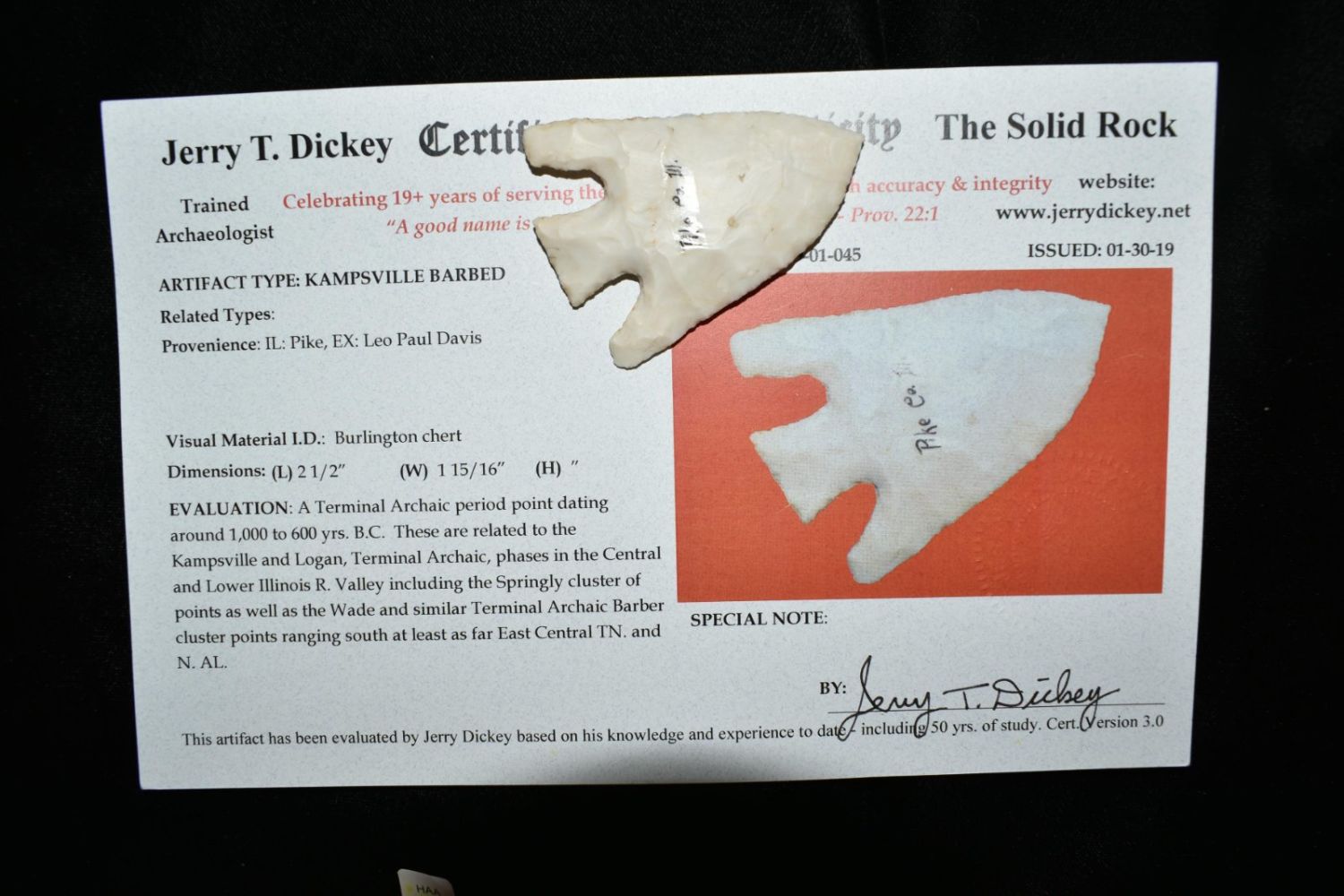 2 1/2″ Kampsville Barbed Dickey COA found in Pike Co, Illinois.