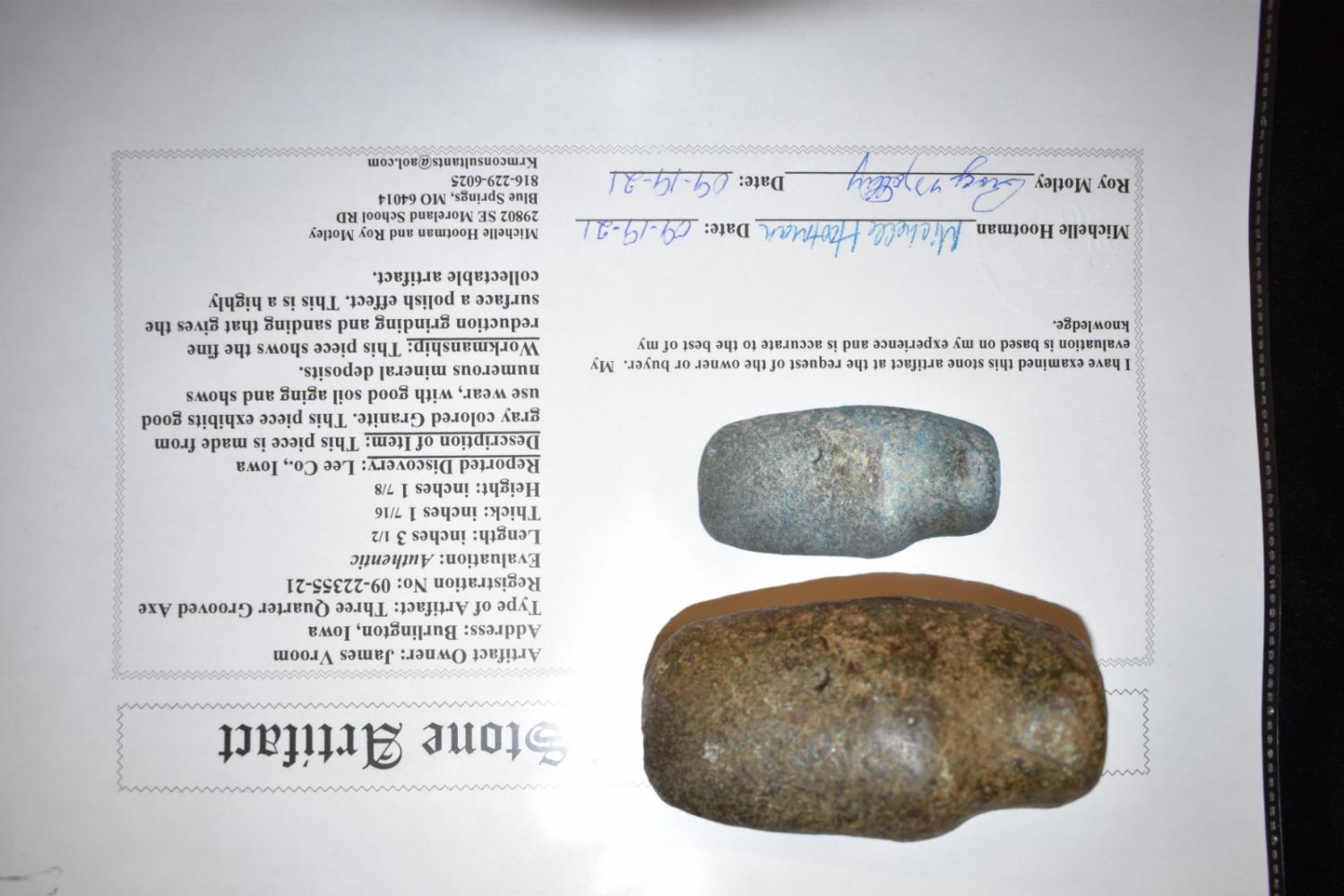3 1/2″ 3/4 Grooved Axe Motley COA found in Lee Co, Iowa.
