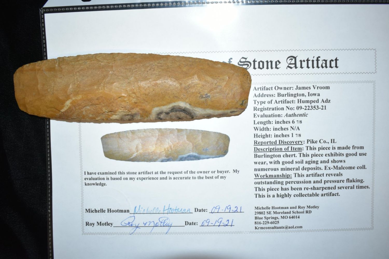 6 7/8" Humped Adz Motley COA found in Pike Co, Illinois.