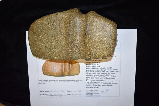 8 3/4" Iowa Slant Grooved Axe 2X COA Motley, Meadows, Ex Cain, Ex Crawford, Ex Steve Lee pictured in Who’s Who Vol.8 Pg 31. Found in Hardin Co, Iowa.
