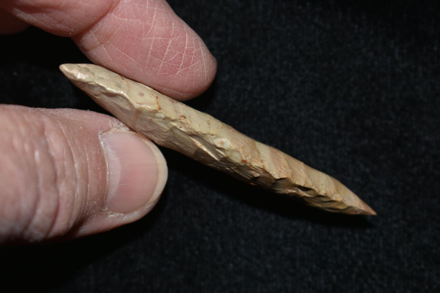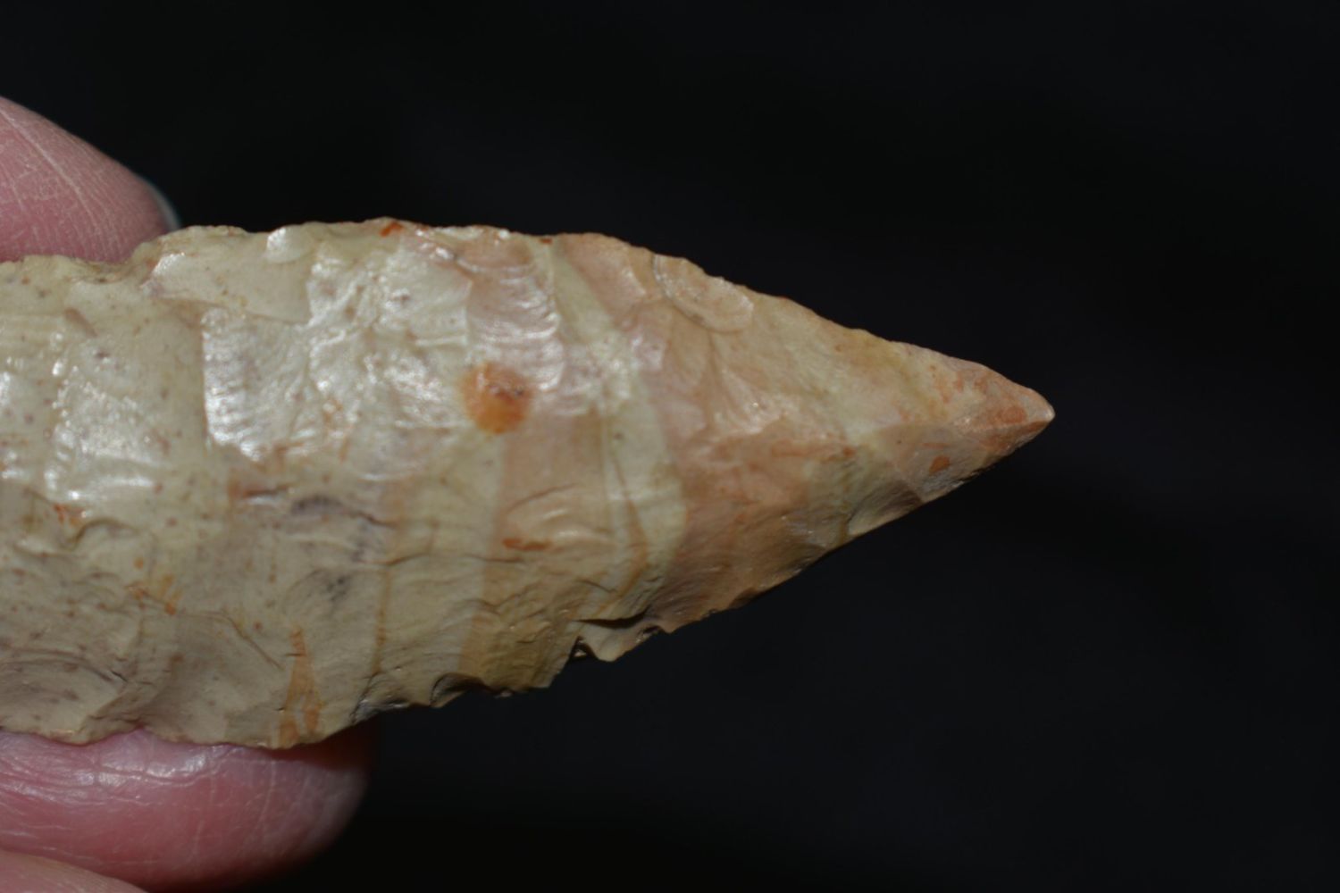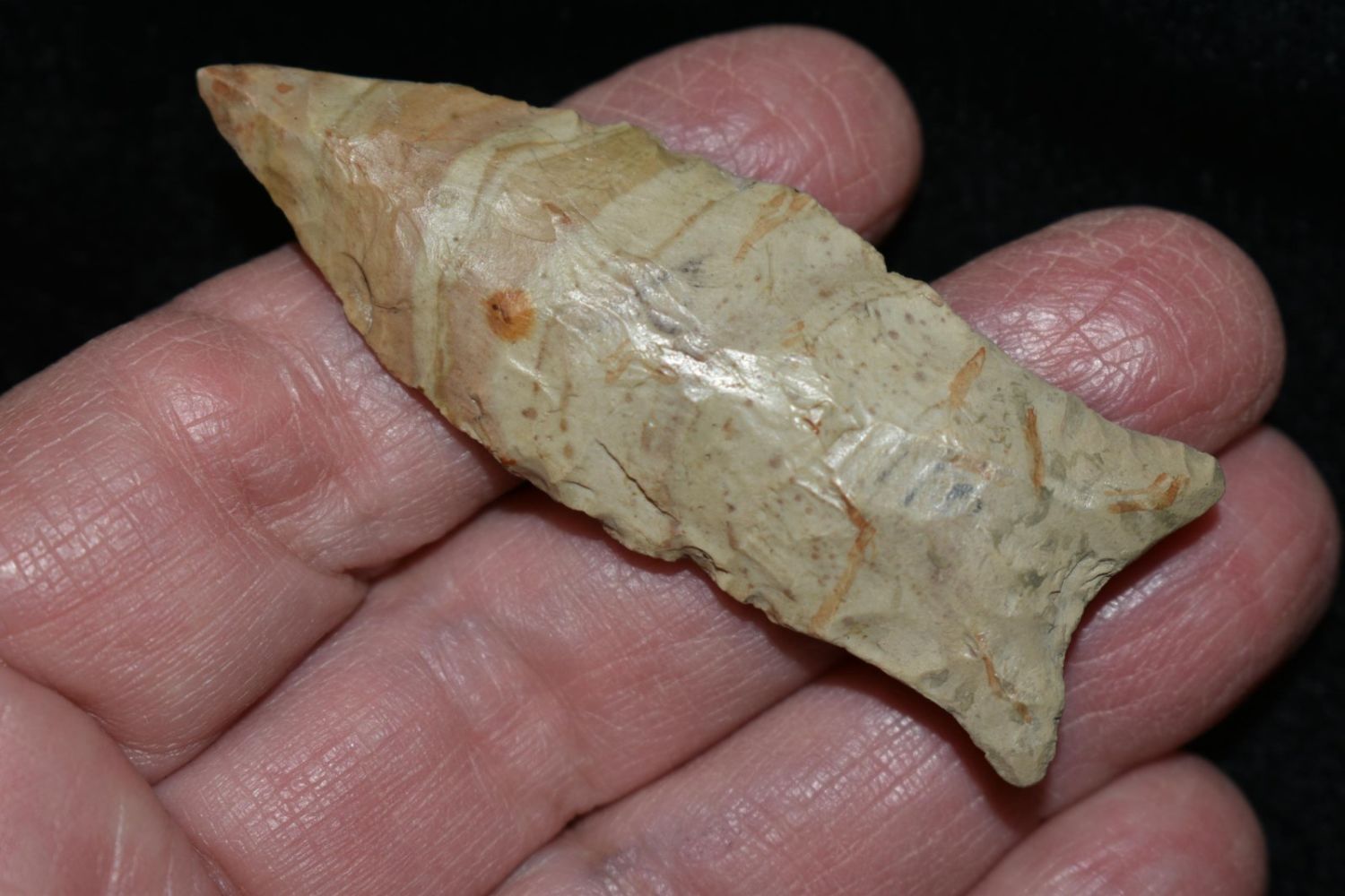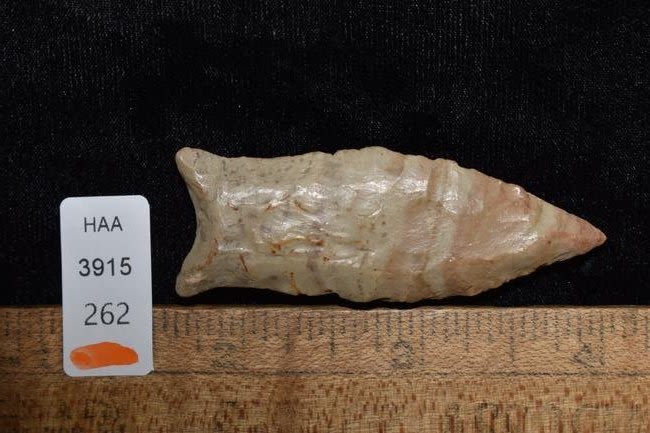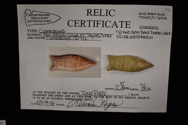 2 5/16" Cumberland Rogers COA with filler restoration to the base barbs and the tip. Made from Ft. Payne Chert and was found in Cumberland Co, Tennessee.