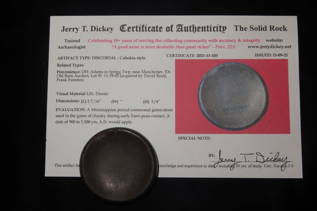 2 7/16" Cahokia Style Discoidal, Dickey COA, Ex. Frank Foremny, Ex. David Root, Extremely Fine with well defined edges and nice polish