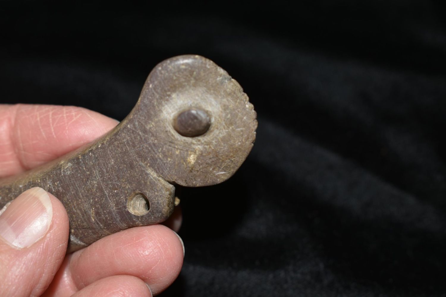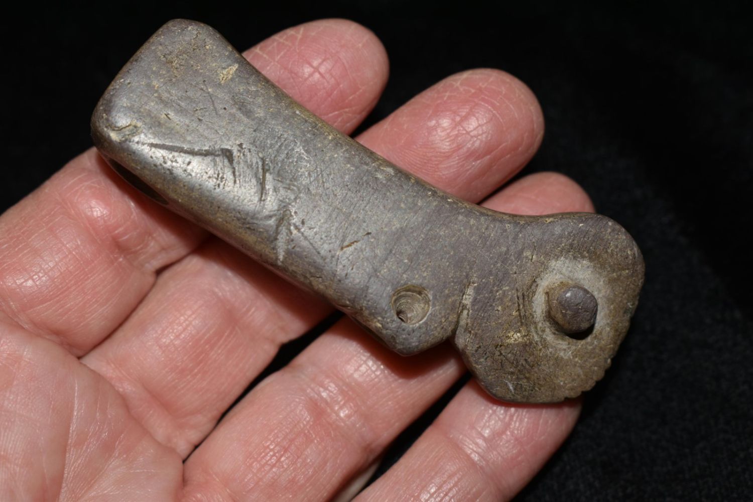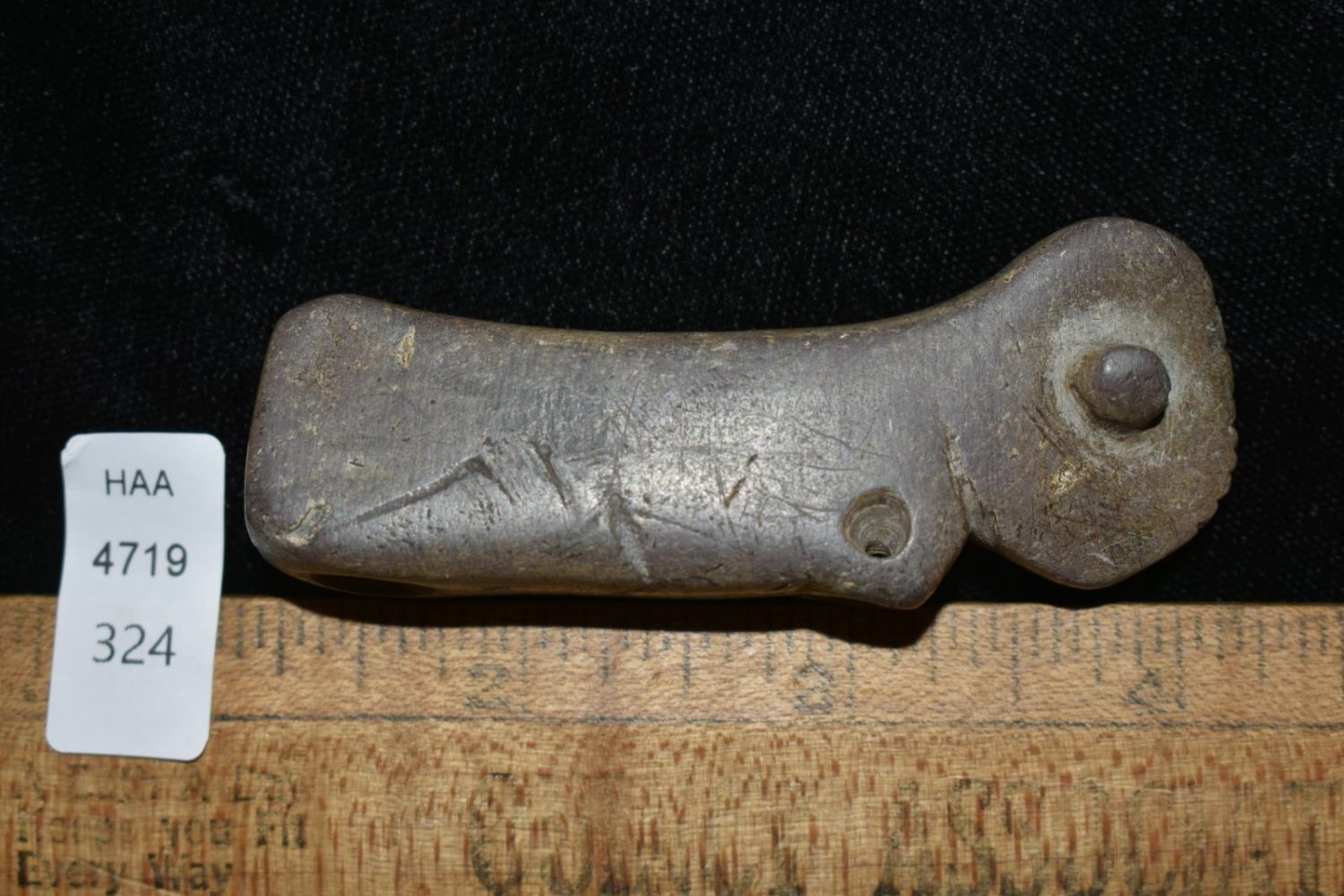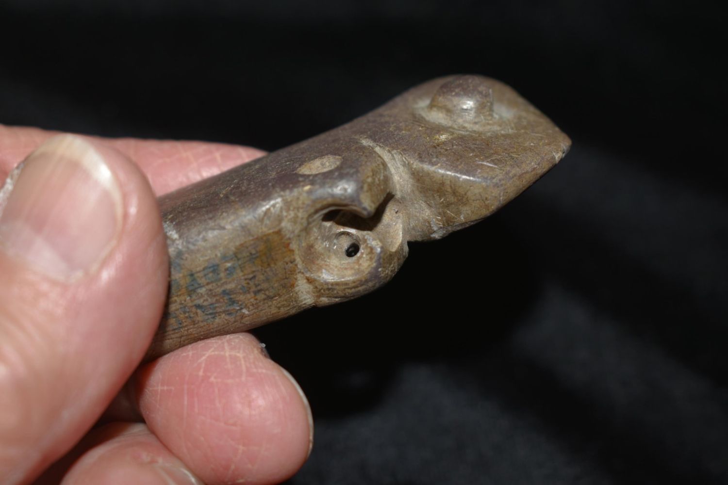 2 15/16" Slate Birdstone, Pop-eyed, Writing on bottom is illegible, Ex. Thunderbird Native American Museum NJ Dorothy Middleton Nelson was the founder, curator and proprietor of the Thunderbird Museum on Mt. Laurel Road during the 1930s through the 1960s. At one time it held one of the largest collections of Native American artifacts (nearly 50,000) in North America. Photo credit: "Dorothy’s Dream: Dorothy Middleton and her Indian Artifact Museum" by O. Kirk Spurr.Dorothy’s Dream, Dorothy Middelton and her Indian Artifact Museumby O. Kirk Spurr, PhDFor nearly fifty years Dorothy Middleton Nelson made her collection of Indian archaeological and ethnological materials–reputedly the fourth largest private collection in North America at the time