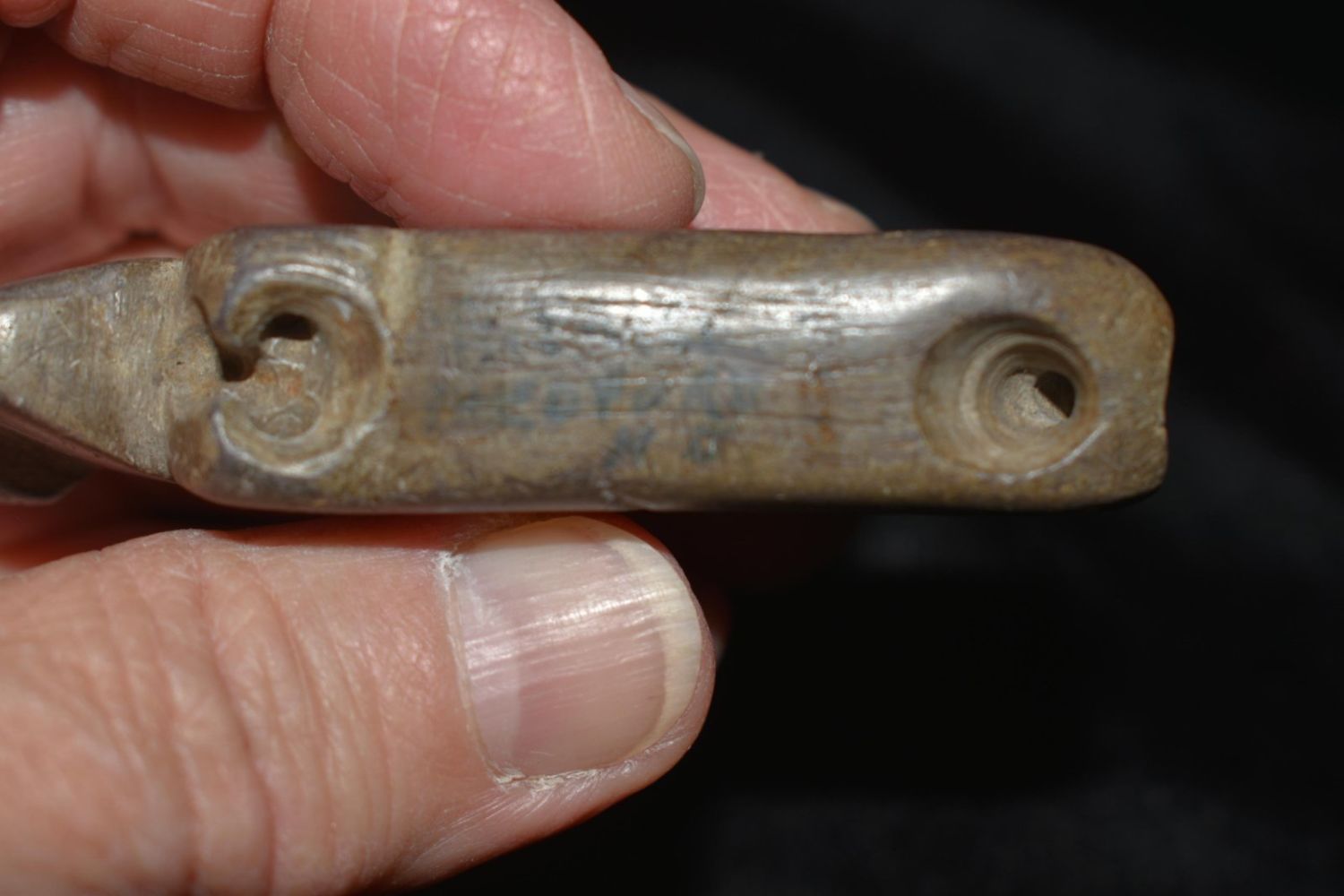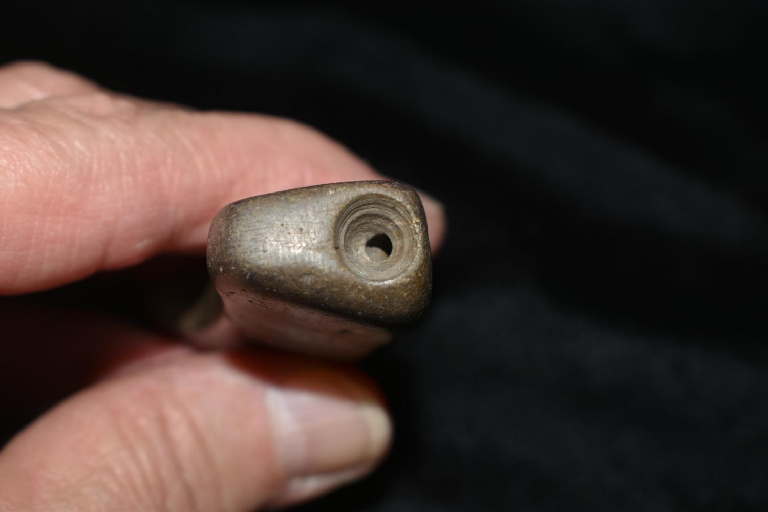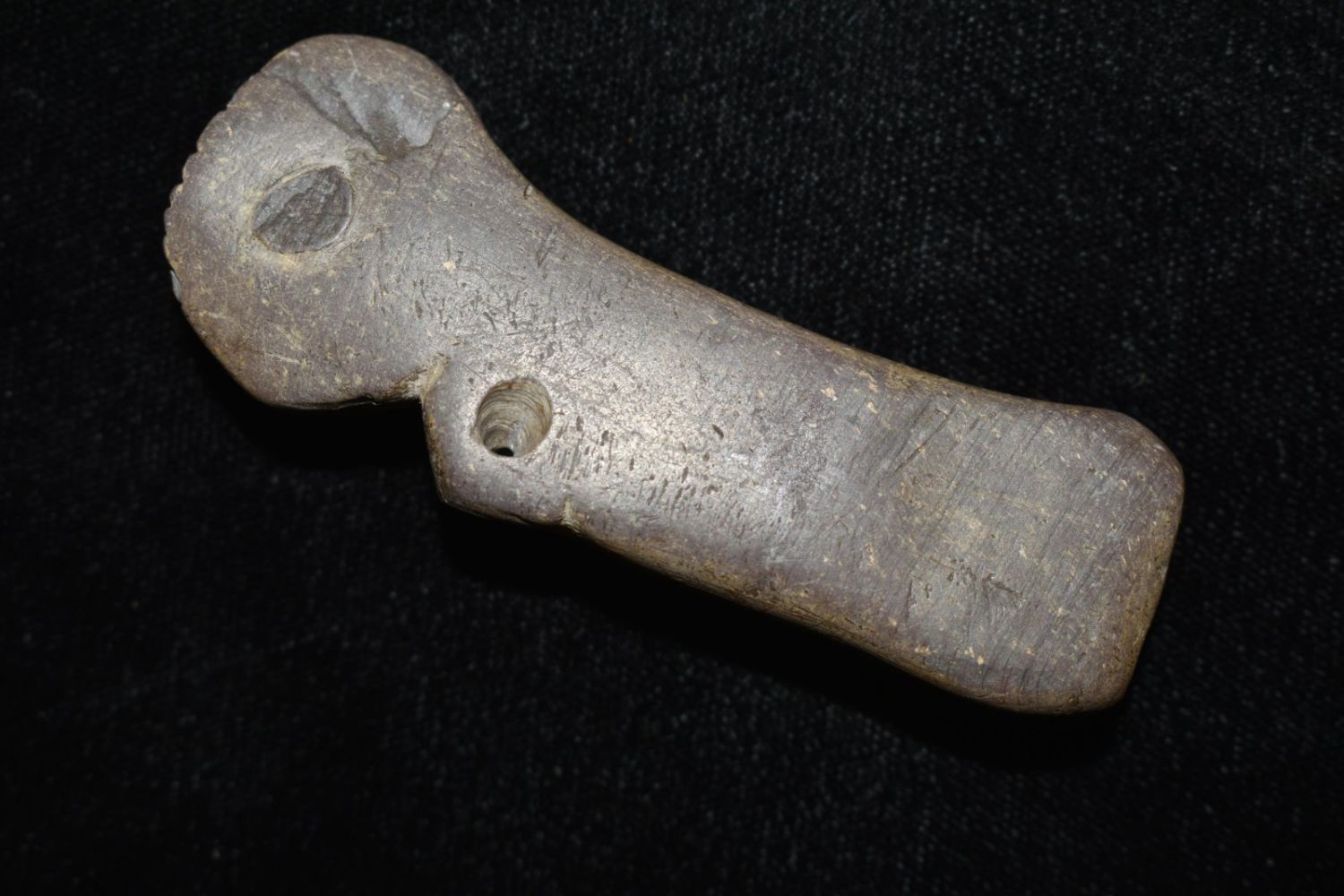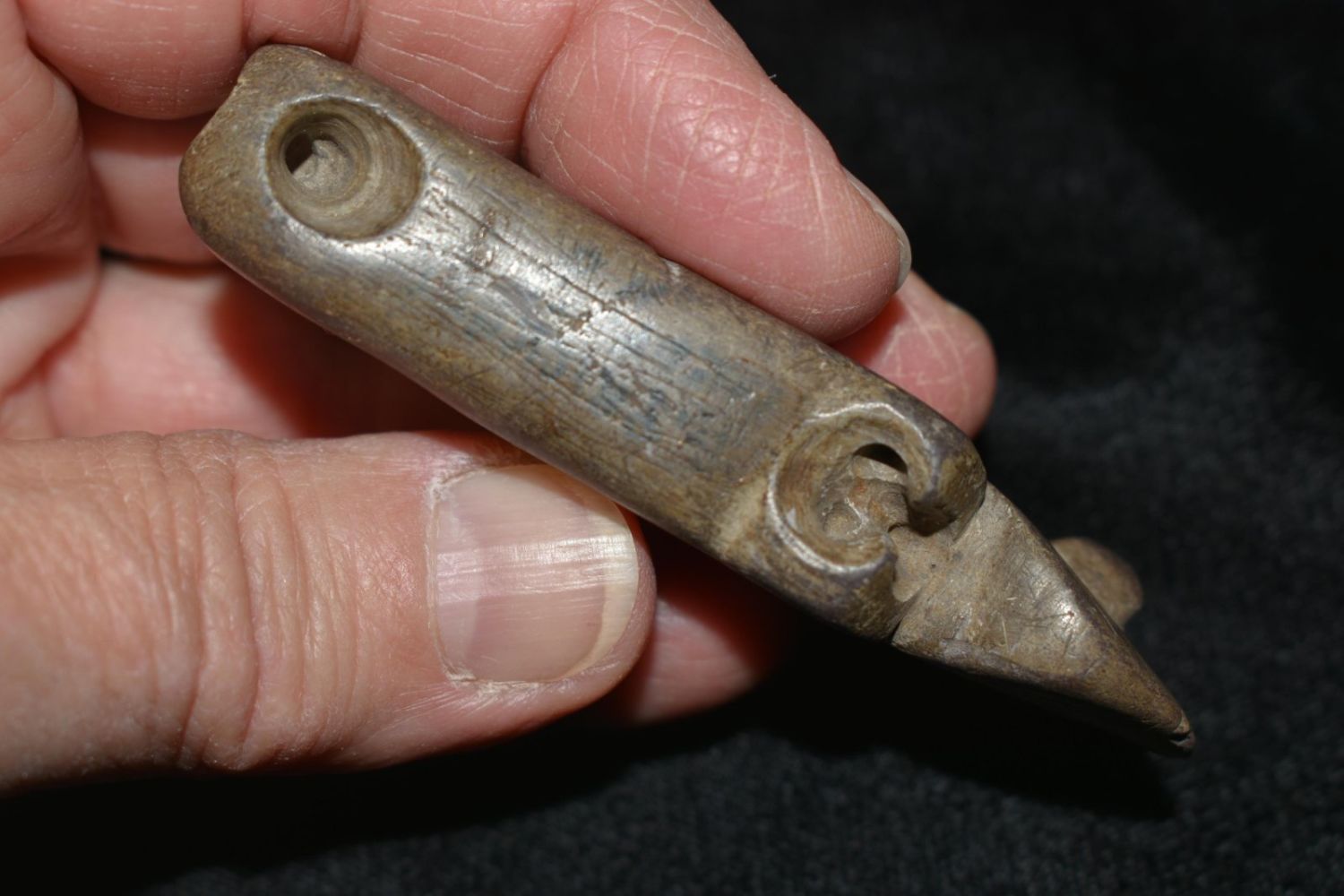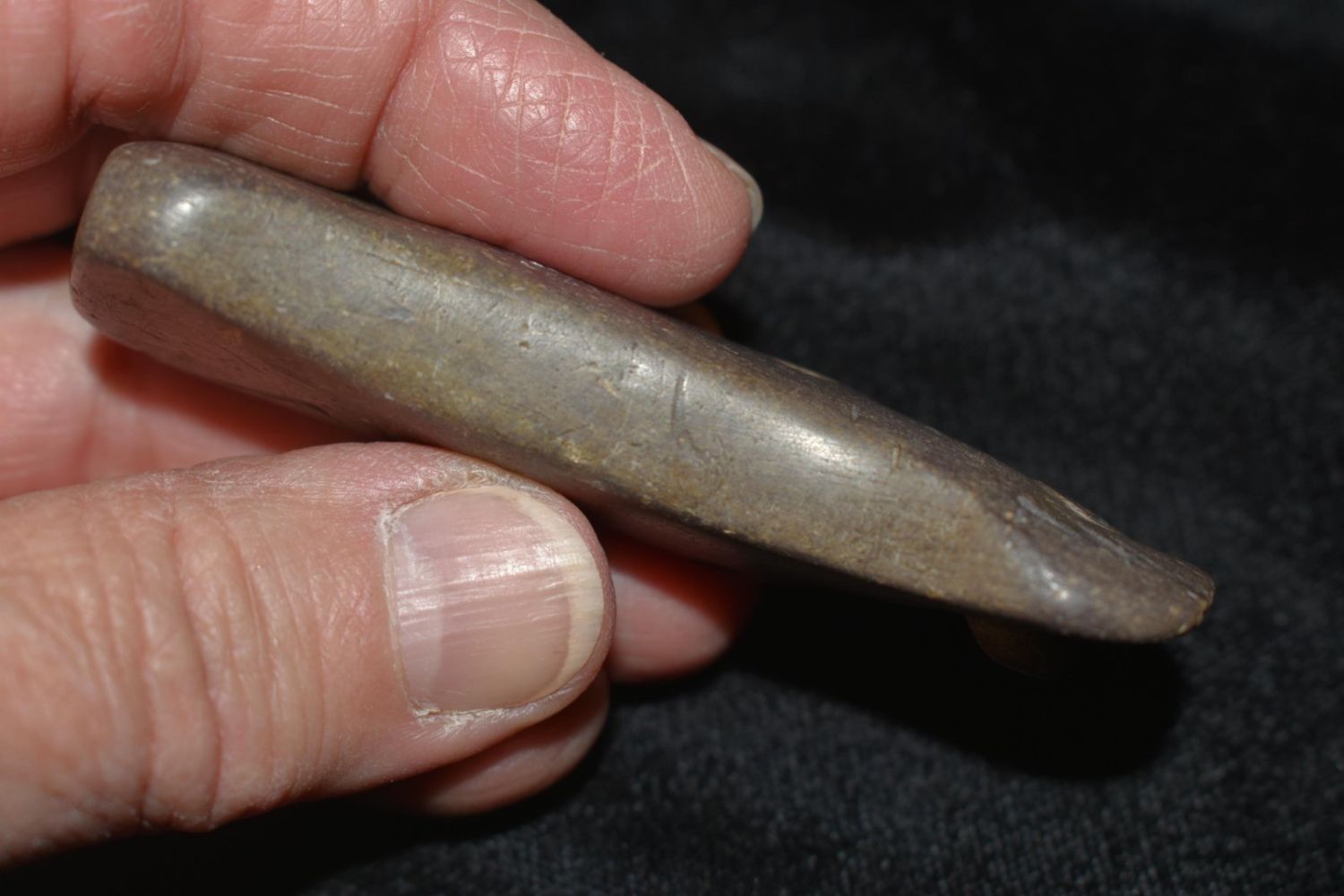 2 15/16" Slate Birdstone, Pop-eyed, Writing on bottom is illegible, Ex. Thunderbird Native American Museum NJ Dorothy Middleton Nelson was the founder, curator and proprietor of the Thunderbird Museum on Mt. Laurel Road during the 1930s through the 1960s. At one time it held one of the largest collections of Native American artifacts (nearly 50,000) in North America. Photo credit: "Dorothy’s Dream: Dorothy Middleton and her Indian Artifact Museum" by O. Kirk Spurr.Dorothy’s Dream, Dorothy Middelton and her Indian Artifact Museumby O. Kirk Spurr, PhDFor nearly fifty years Dorothy Middleton Nelson made her collection of Indian archaeological and ethnological materials–reputedly the fourth largest private collection in North America at the time