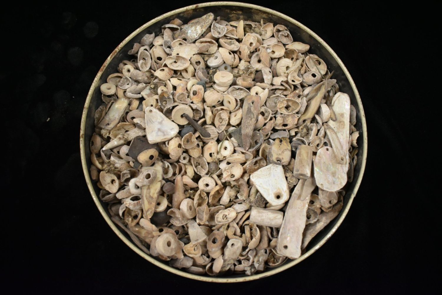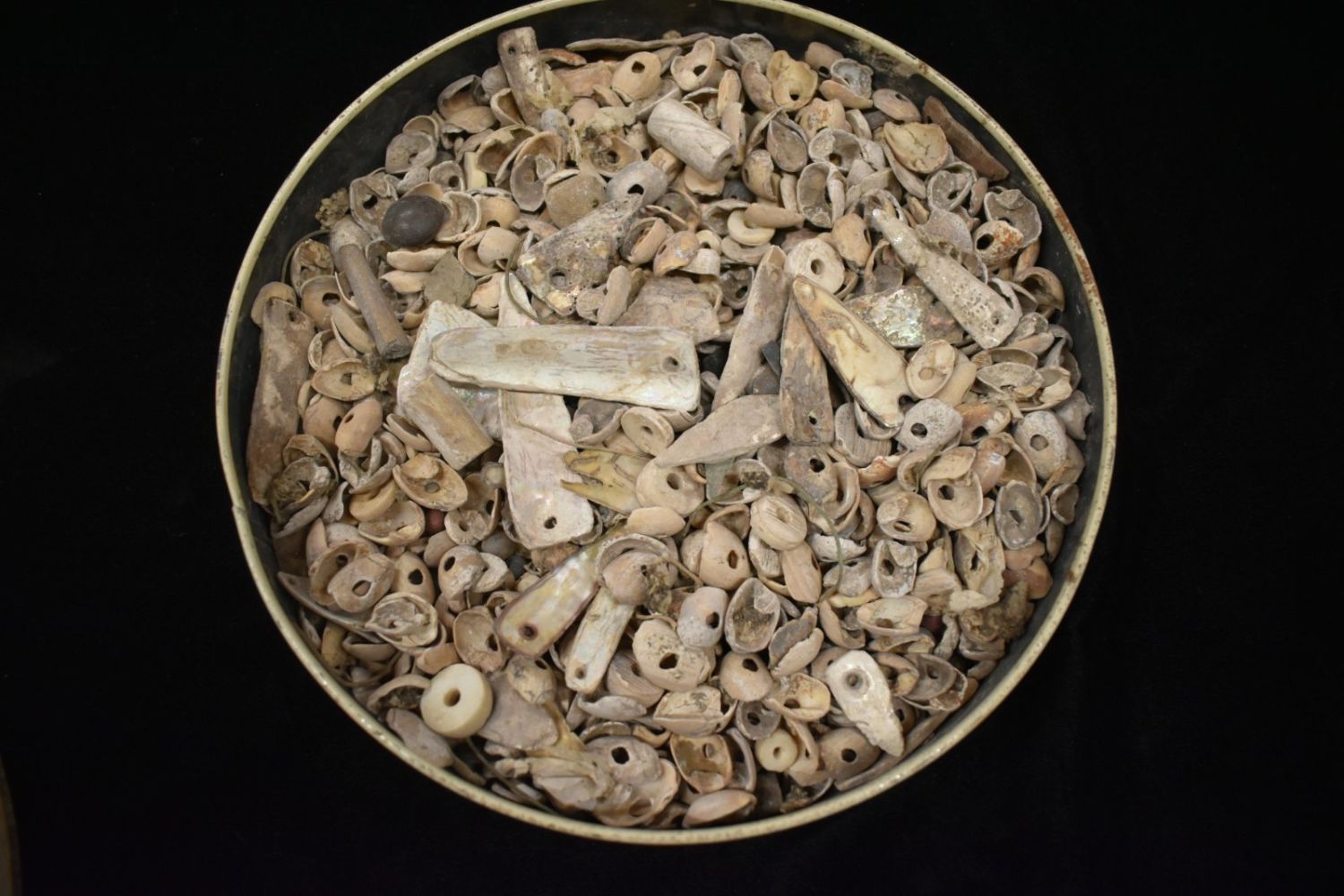 Large Grouping of Anastazi Shell Beads, Several Hundred pcs, Tin is 8 3/4" diameter by 1 1/2" tall Ex. Thunderbird Native American Museum NJ Dorothy Middleton Nelson was the founder, curator and proprietor of the Thunderbird Museum on Mt. Laurel Road during the 1930s through the 1960s. At one time it held one of the largest collections of Native American artifacts (nearly 50,000) in North America.Photo credit: "Dorothy’s Dream: Dorothy Middleton and her Indian Artifact Museum" by O. Kirk Spurr.Dorothy’s Dream, Dorothy Middelton and her Indian Artifact Museumby O. Kirk Spurr, PhDFor nearly fifty years Dorothy Middleton Nelson made her collection of Indian archaeological and ethnological materials–reputedly the fourth largest private collection in North America at the time