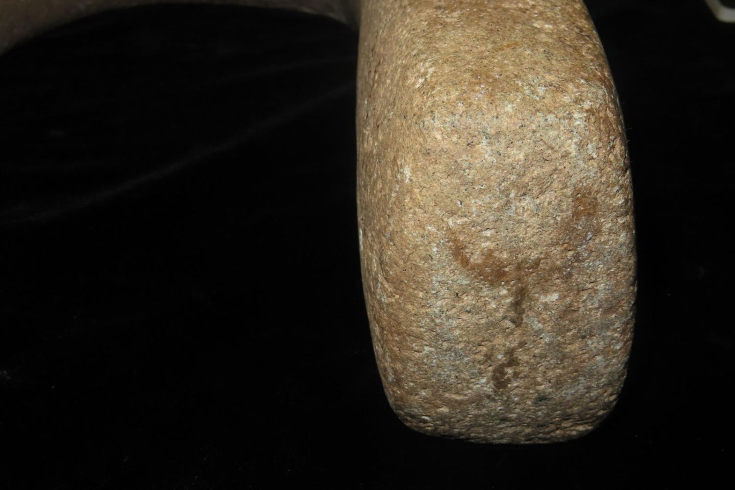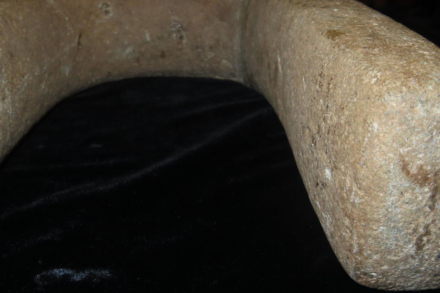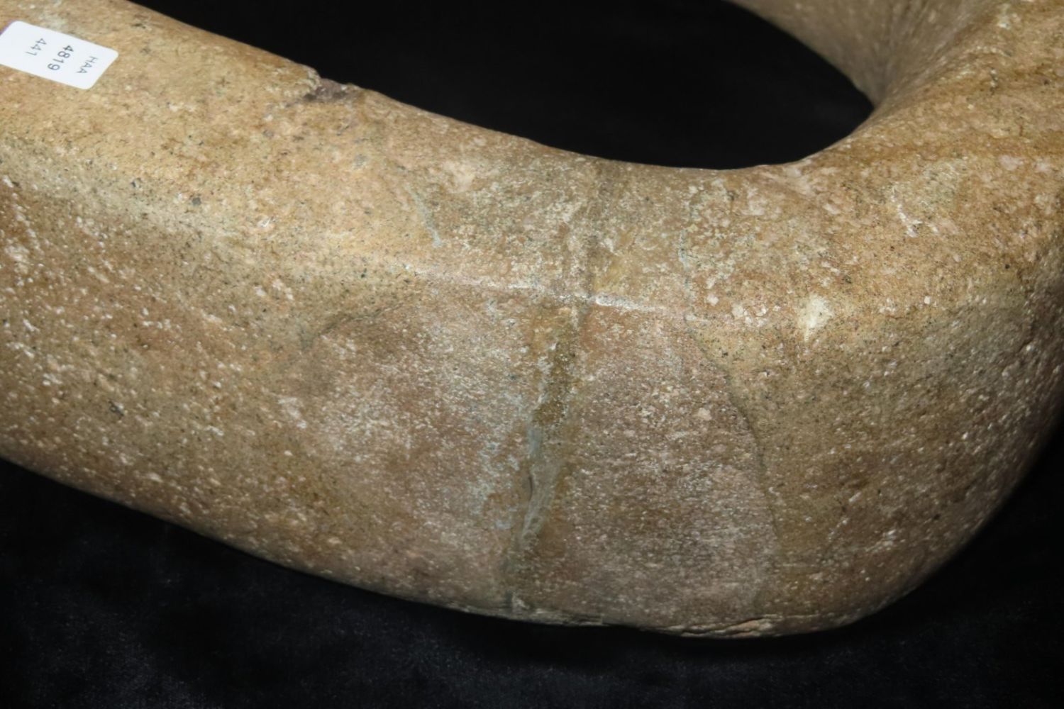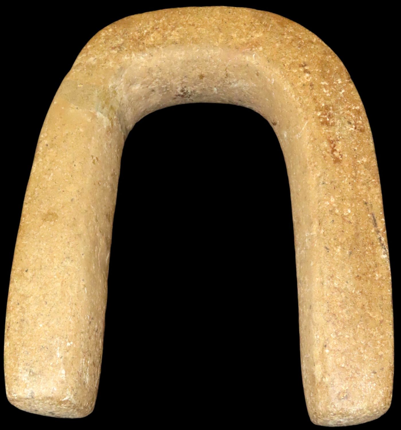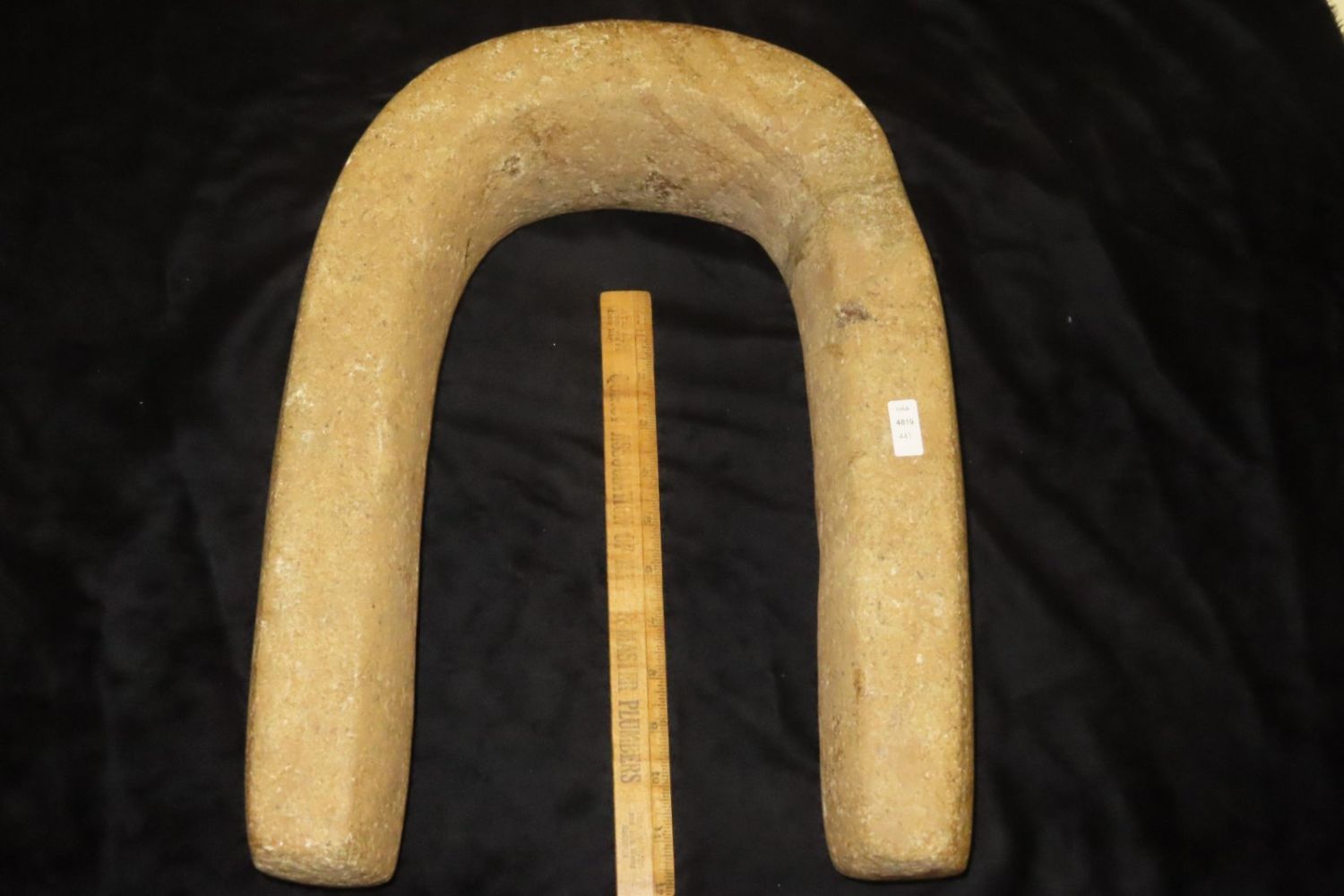 16″ Pre-Colombian Gaming Yoke from the Byron Knoblock Collection-pictured in Who’s Who in Indian Relics, Vol. 1. broken and glued-12 3/8″ Wide, with nice finishThe Yoke and Its Significance in the Mesoamerican Ball Game: One of the most salient artifacts associated with the ball game is a stone belt, also named a yoke by the Spanish. A yoke is generally u-shaped and made out of various stone, such as diorite, basalt or other fine stones. In general, the predominant view among scholars is agreed to be that the stone belt was used during the ball game. These belts remarkably fit around a person’s waist fairly well. The purpose of wearing a yoke during the game is believed to have been to add more weight on the player in order to hit the large, heavy ball with a greater force. This force would propel the ball at a higher velocity and longer range. The function of these stone belts can be paralleled to the Puerto Rican stone “collars” which were worn during the ball game. By comparing similar artifacts of other cultures, archaeologists can make a good predication as to how the object was actually used in Mesoamerica. Also through experimental archaeology, archaeologists have put on the belt and simulated its use to test different functions of the belt.-Leslie Arapi, University of Pennsylvania