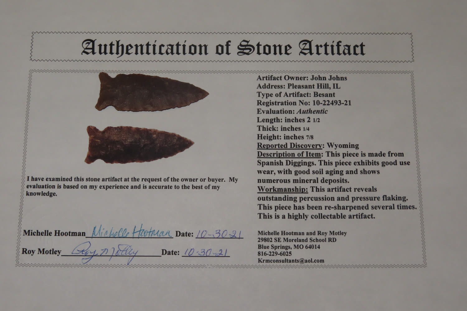2 1/2″ Besant, Motley COA, found in WY