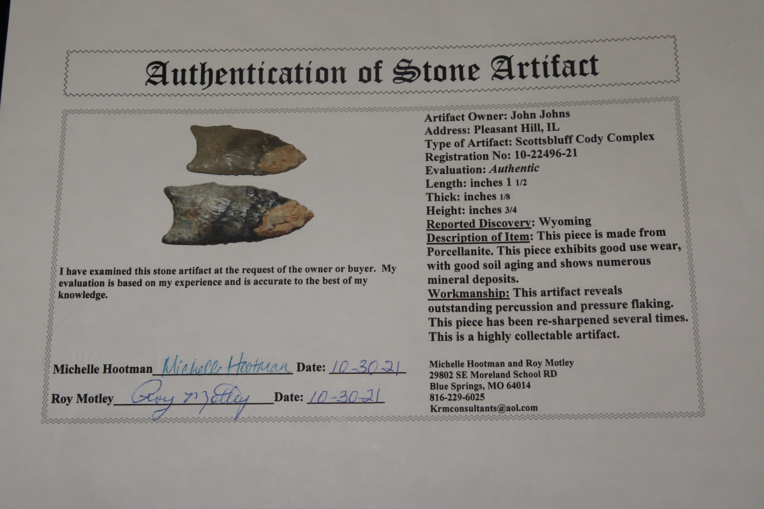 1 1/2″ Scott’s Bluff, Motley COA, found in WY