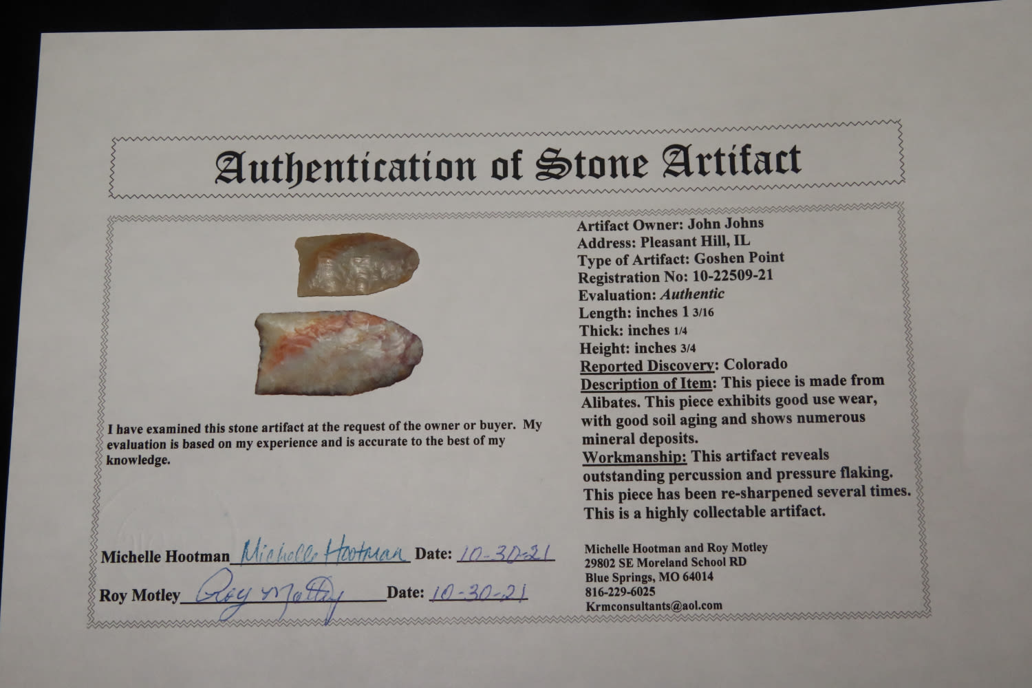 1 3/16″ Goshen, Motley COA, found in CO