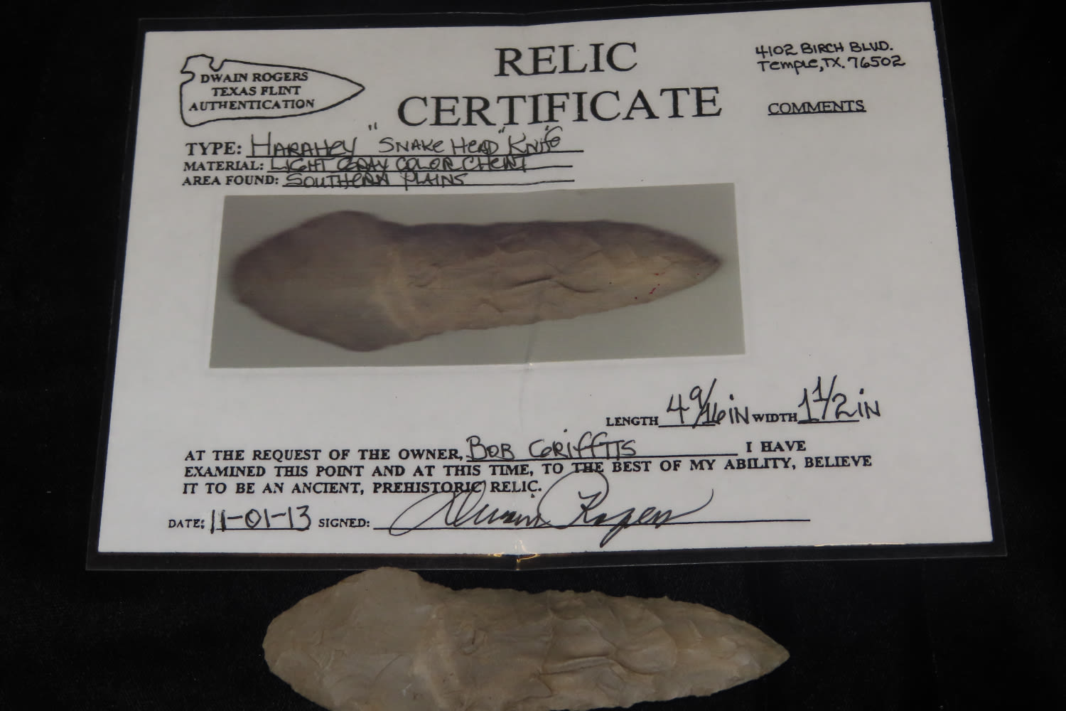 4 9/16″ Snake Head Parahey, Rogers COA, Southern Plains