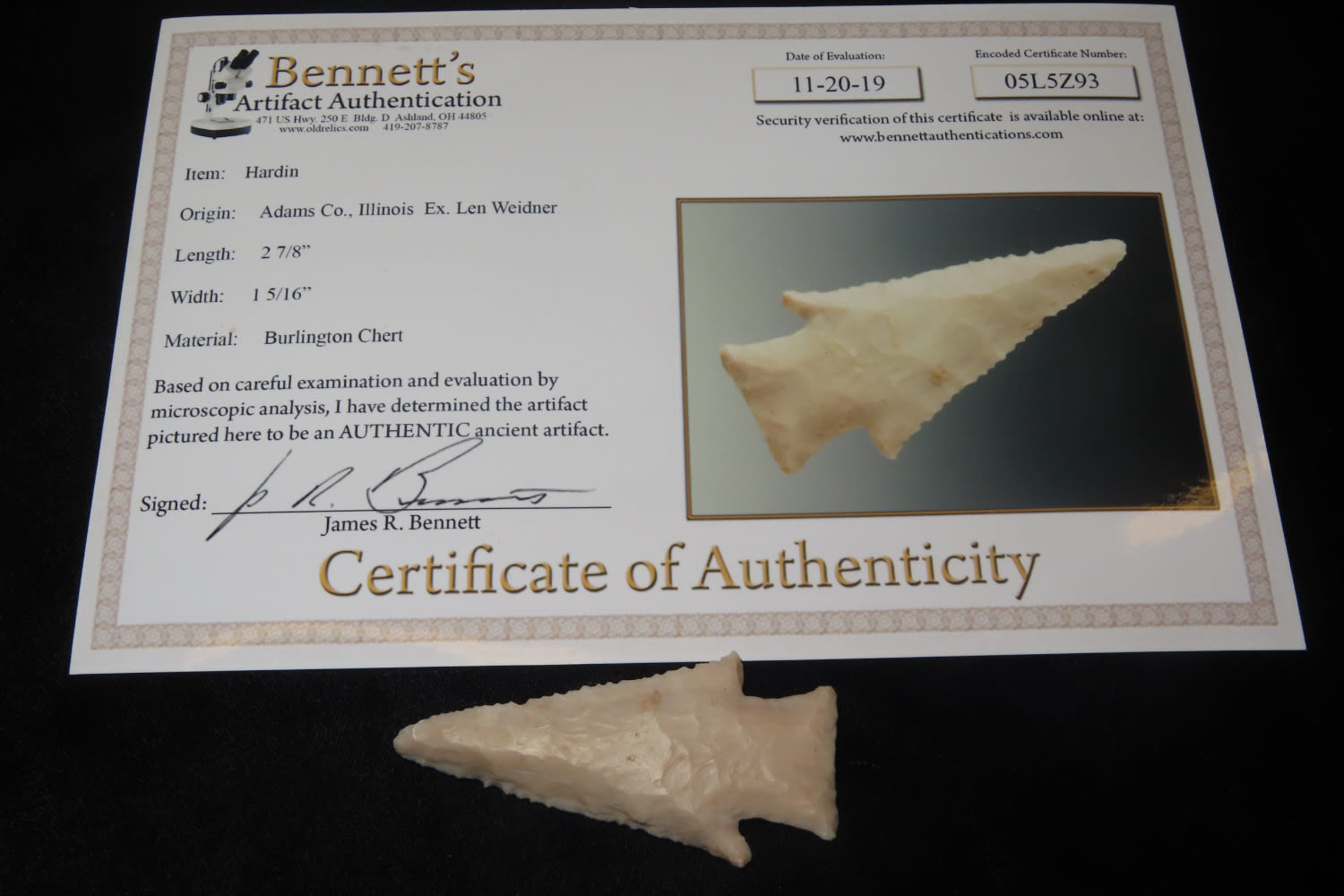 2 7/8″ Hardin, Bennett COA. Adams Co IL