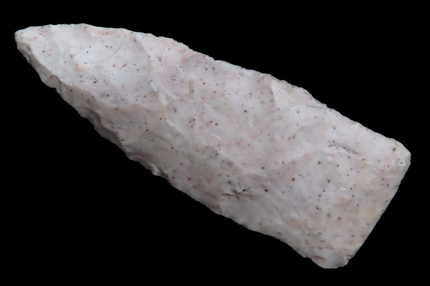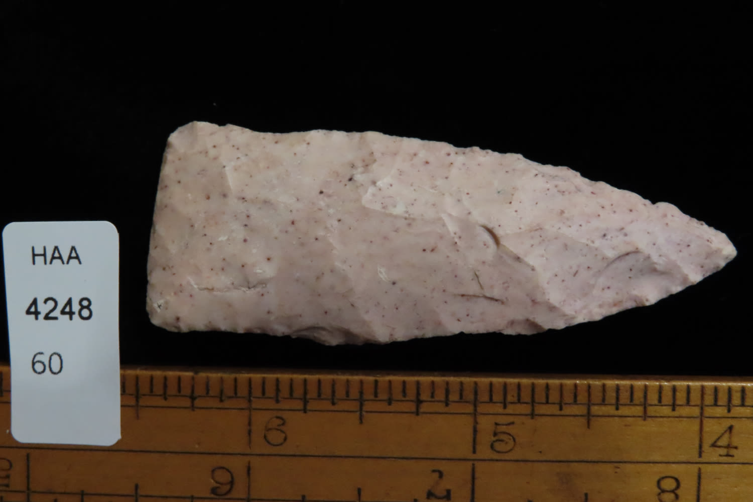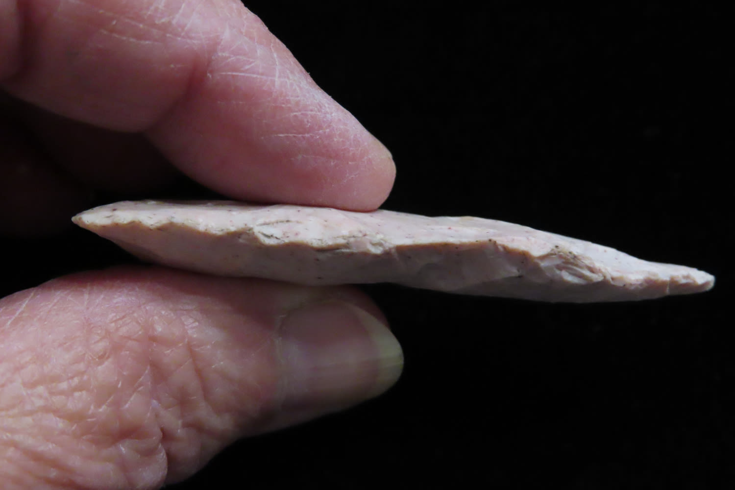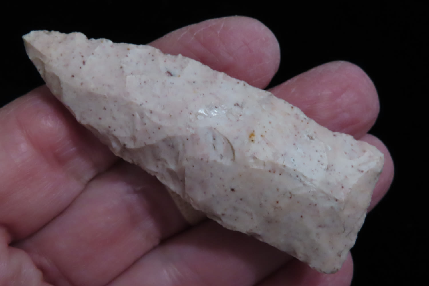 2 5/8″ Rice Side-Notched with great color. Made from Heat Treated Burlington flint and found by Brandon Hunt in Greene Co, Illinois.