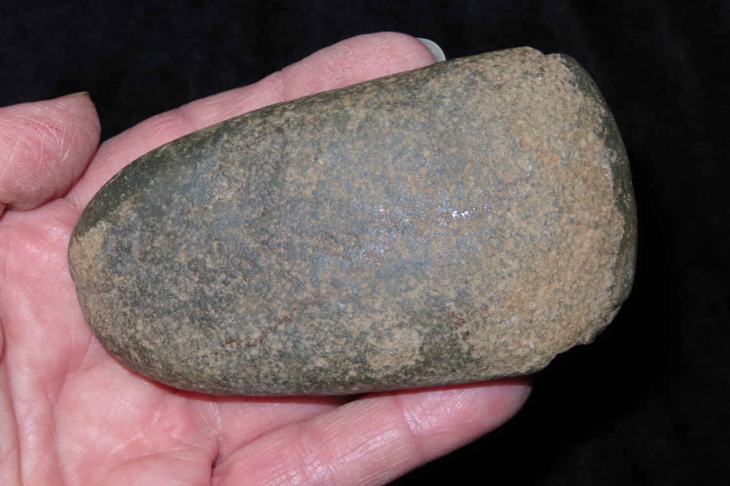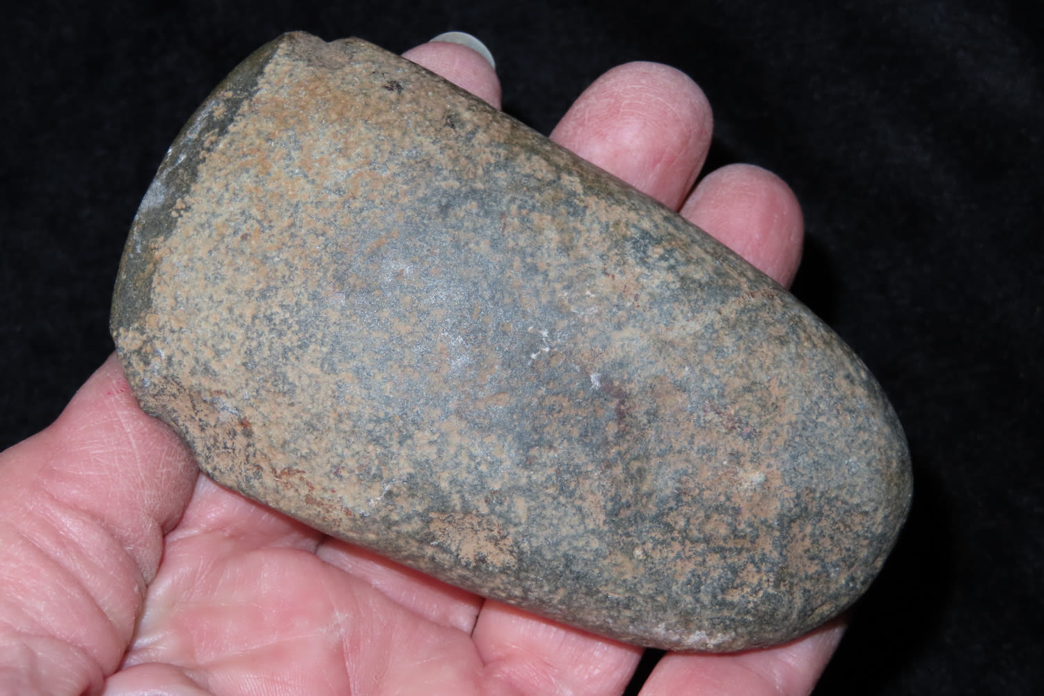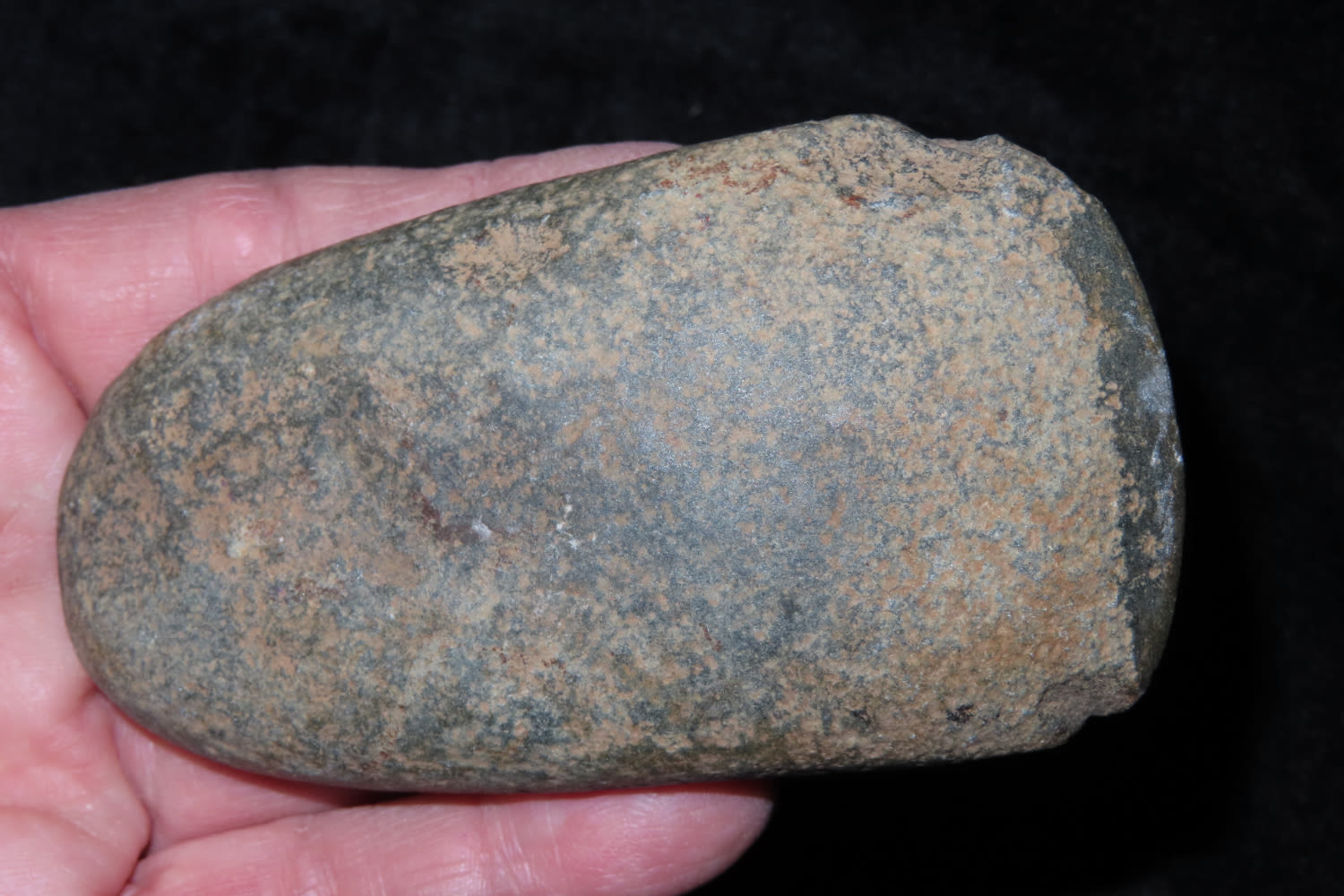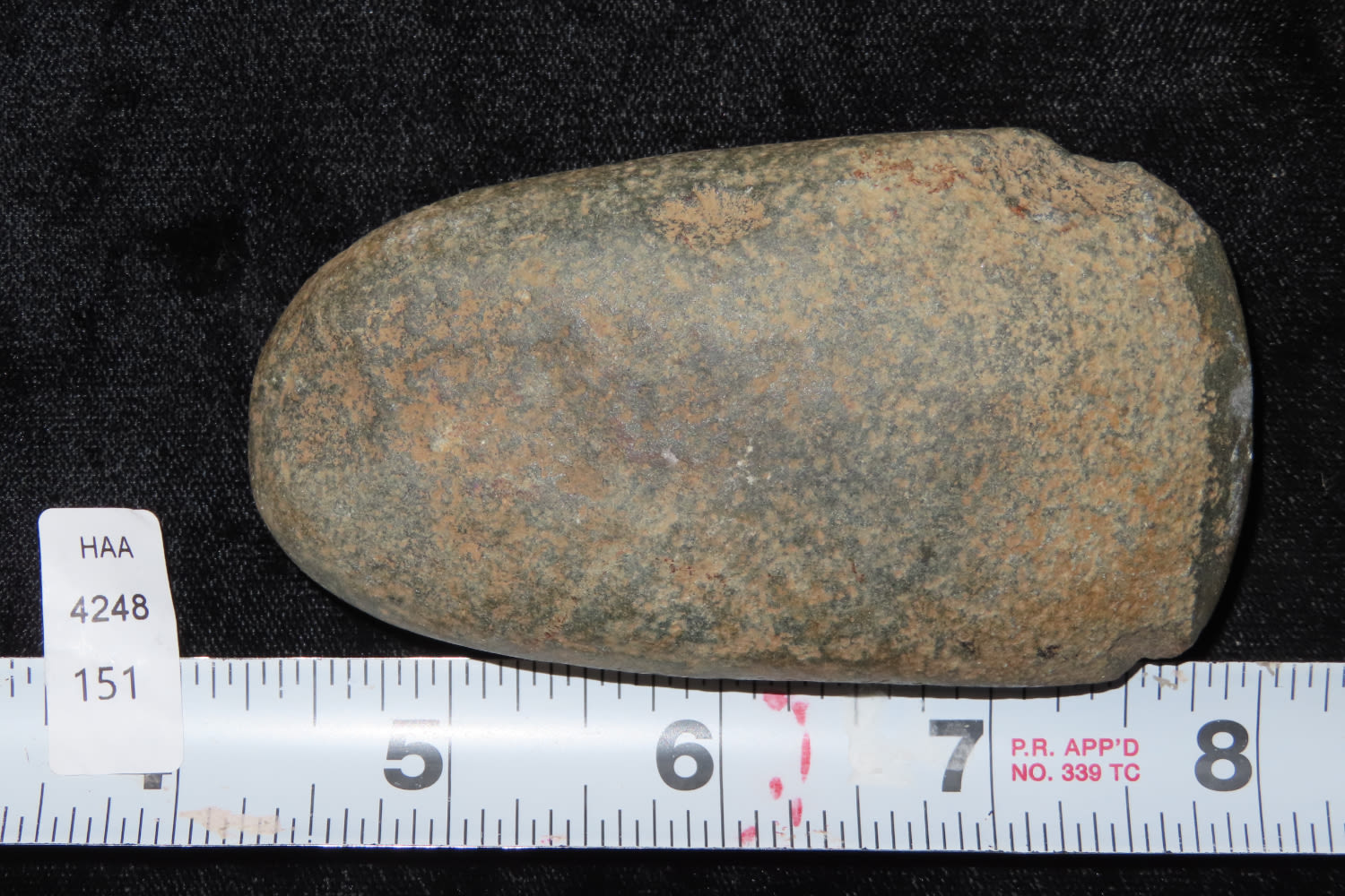 3 5/8″ Granite Celt shows great use ware on the bit found in Stoddard Co, Missouri.