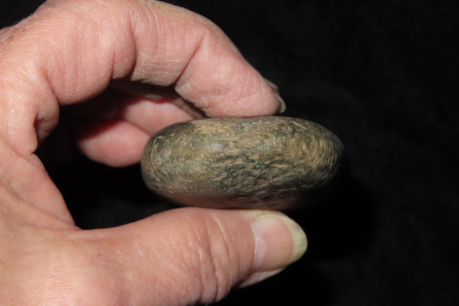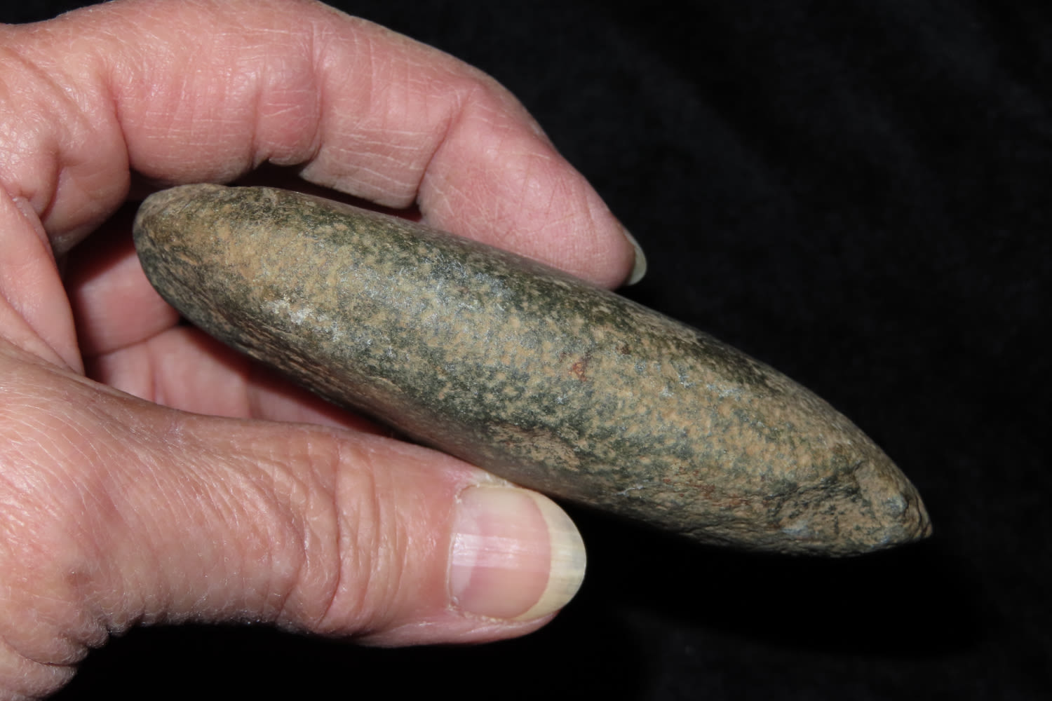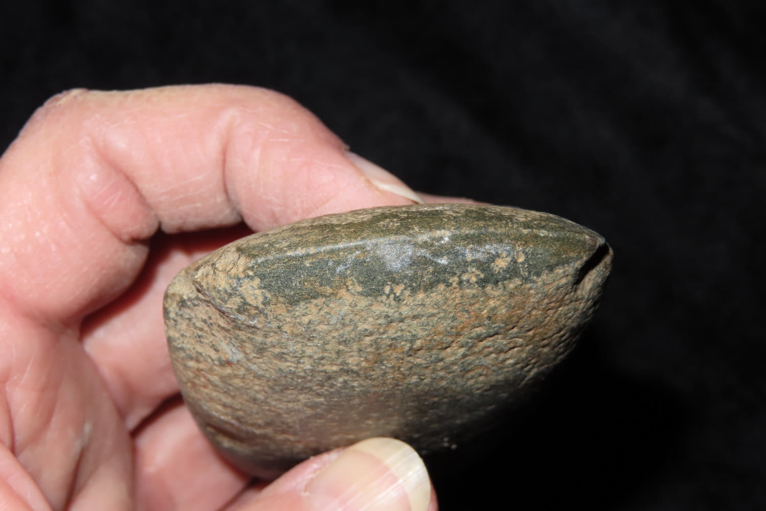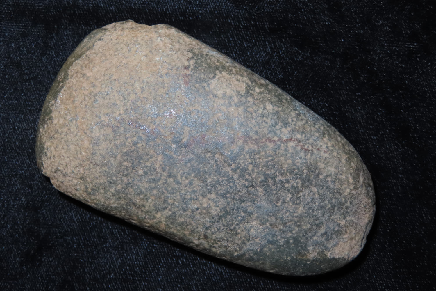 3 5/8″ Granite Celt shows great use ware on the bit found in Stoddard Co, Missouri.