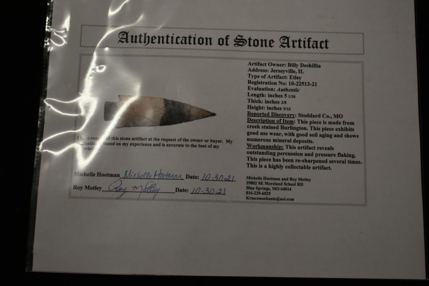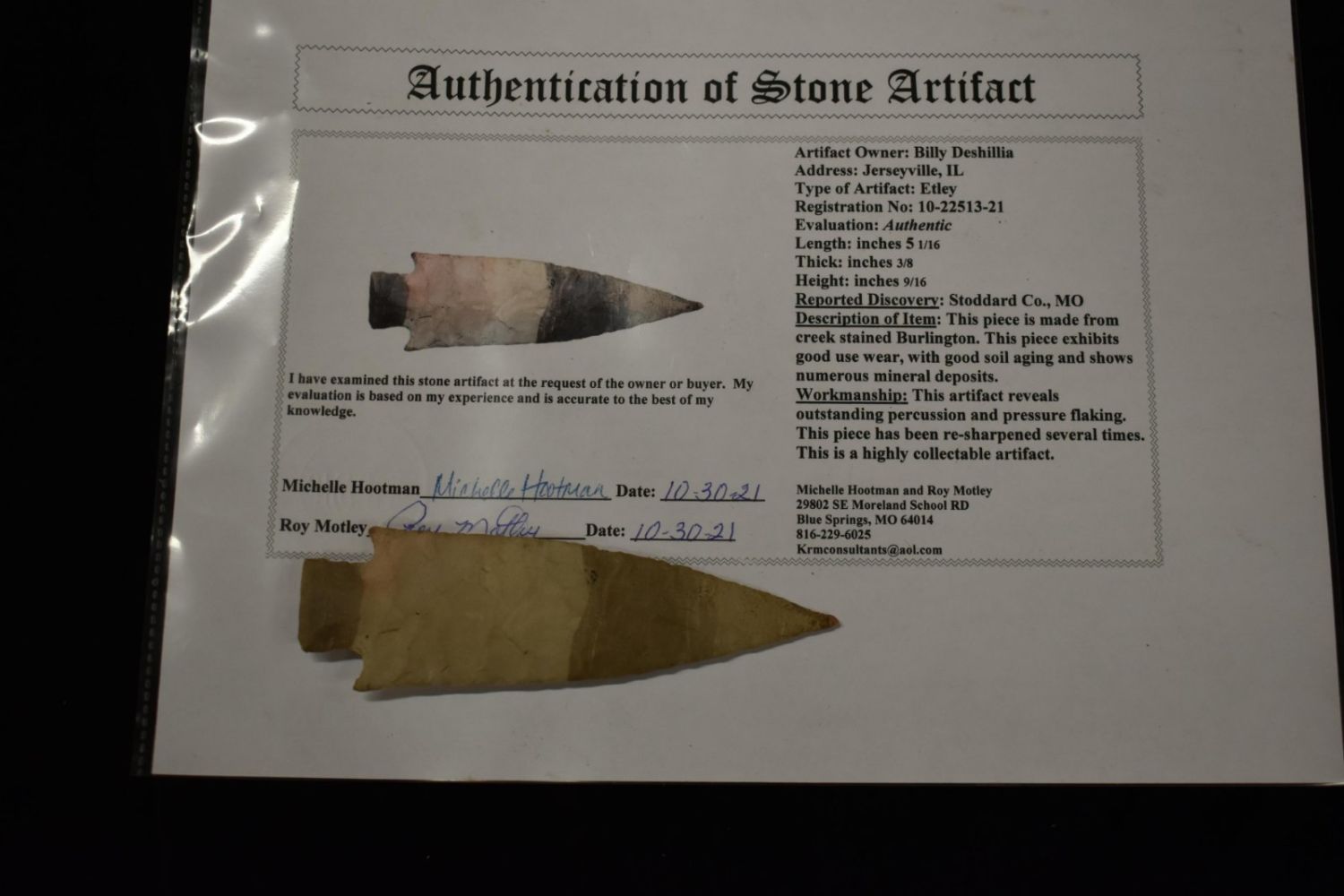5 1/16" Etley, Motley COA, found in Stoddard Co Missouri