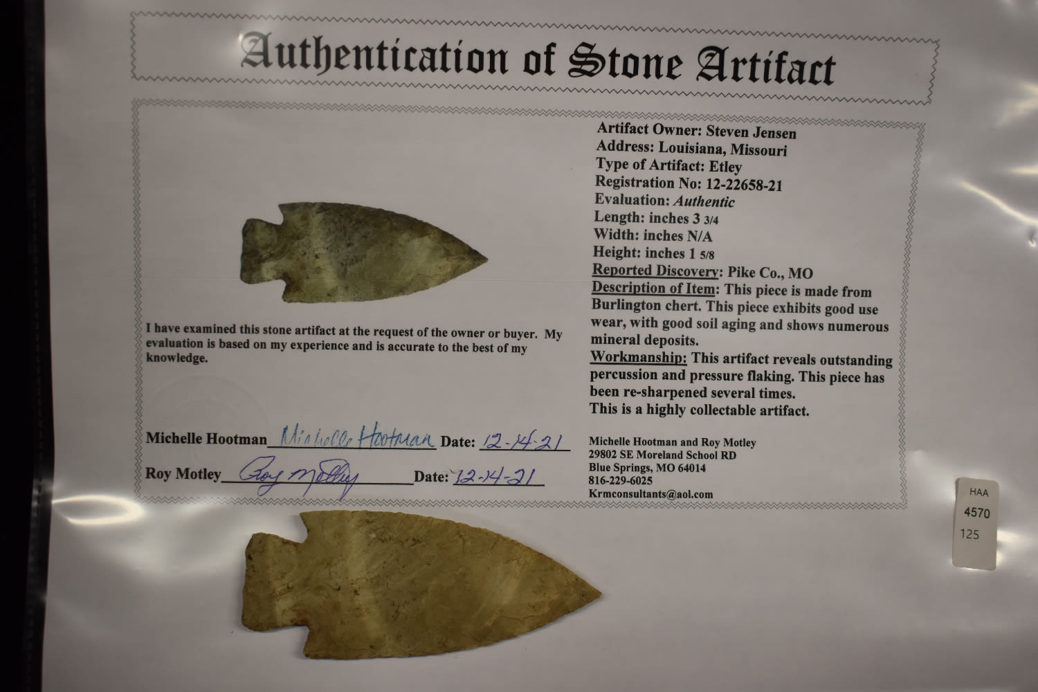 3 3/4″ Etley, Motley COA, Pike Co MO, Nice Creek Find