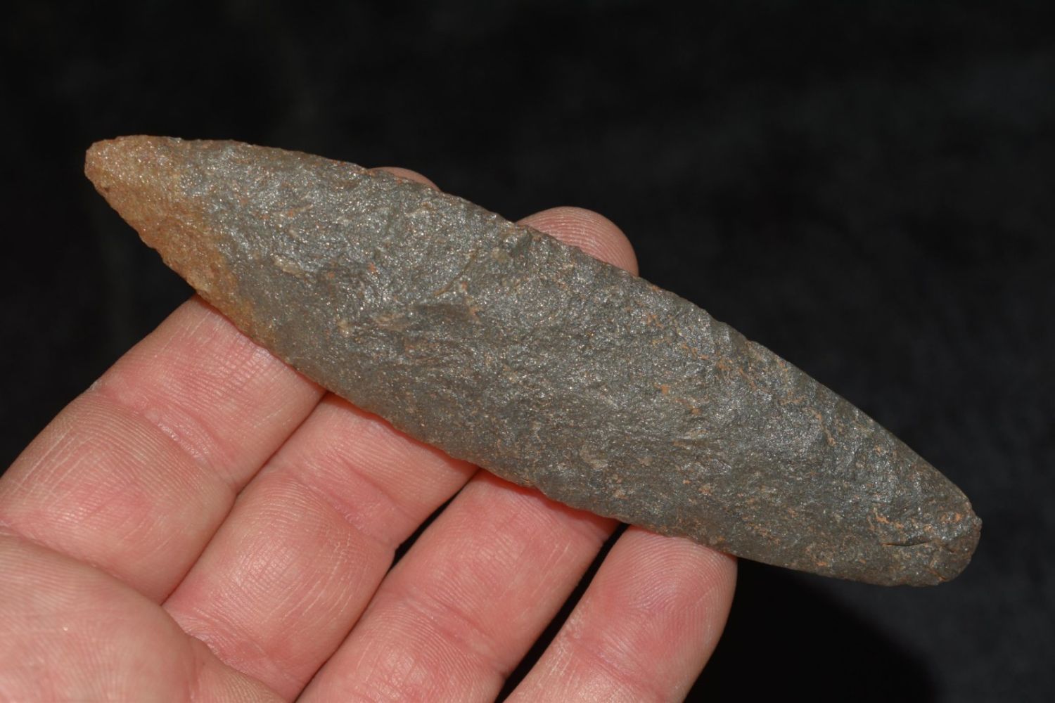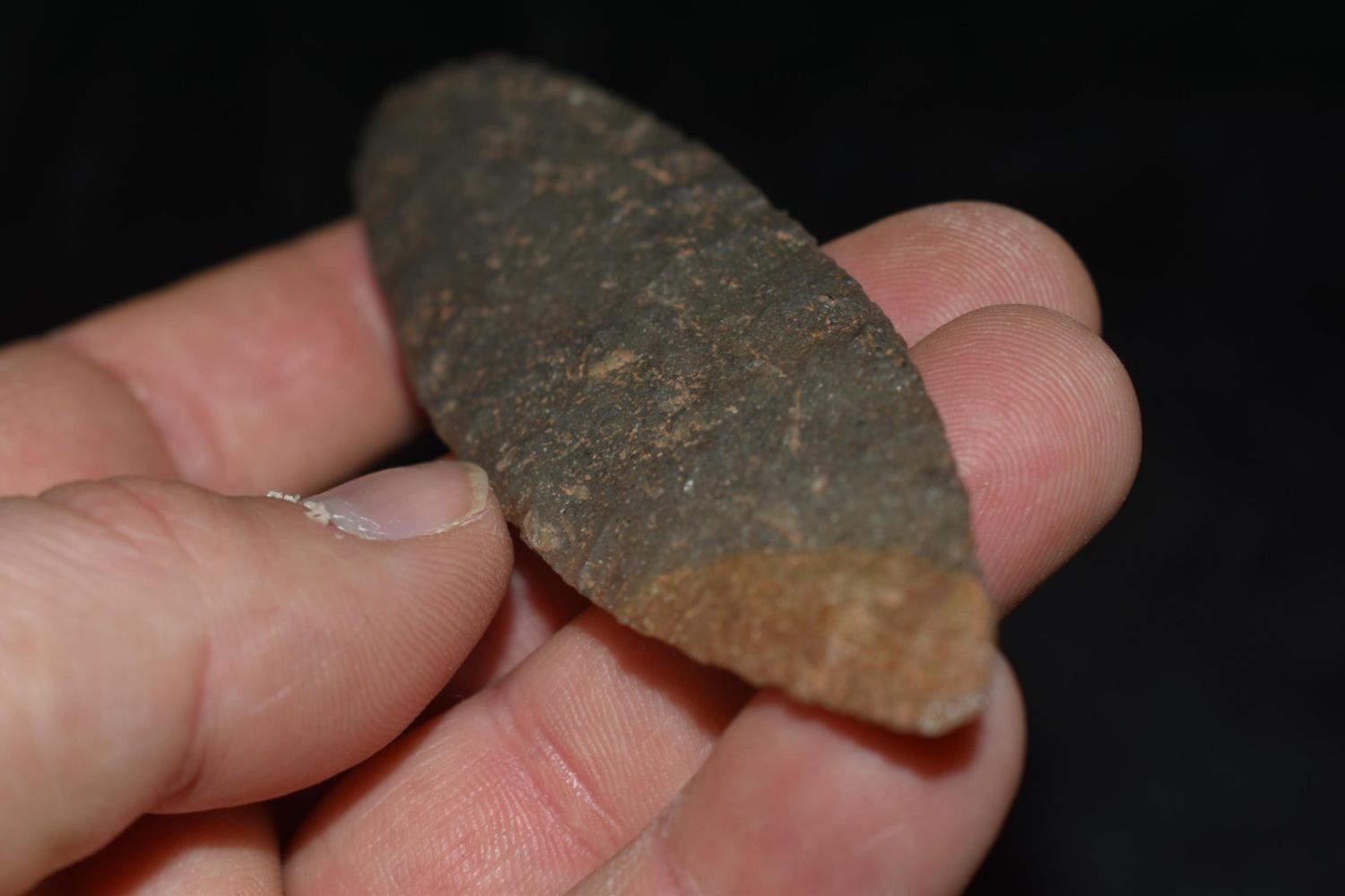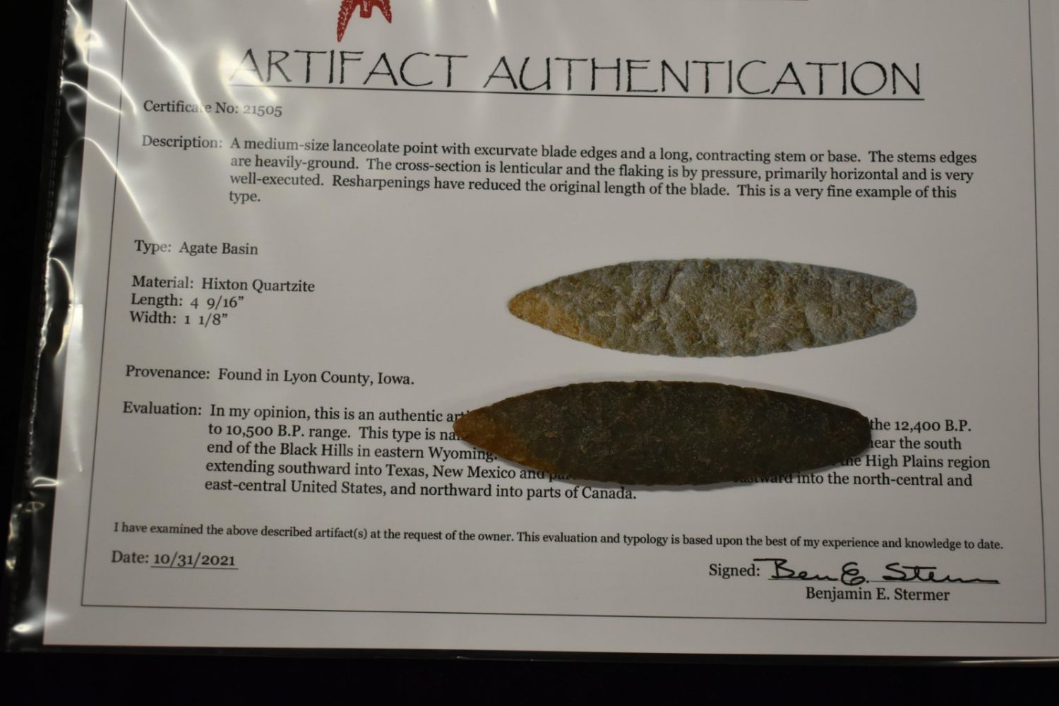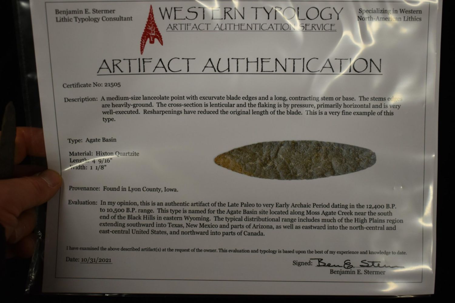 4 9/16″ Agate Basin, Stermer COA, made of Hixton Quartzite, Well Ground Base and Nicely flaked-found near Lyon Co Iowa