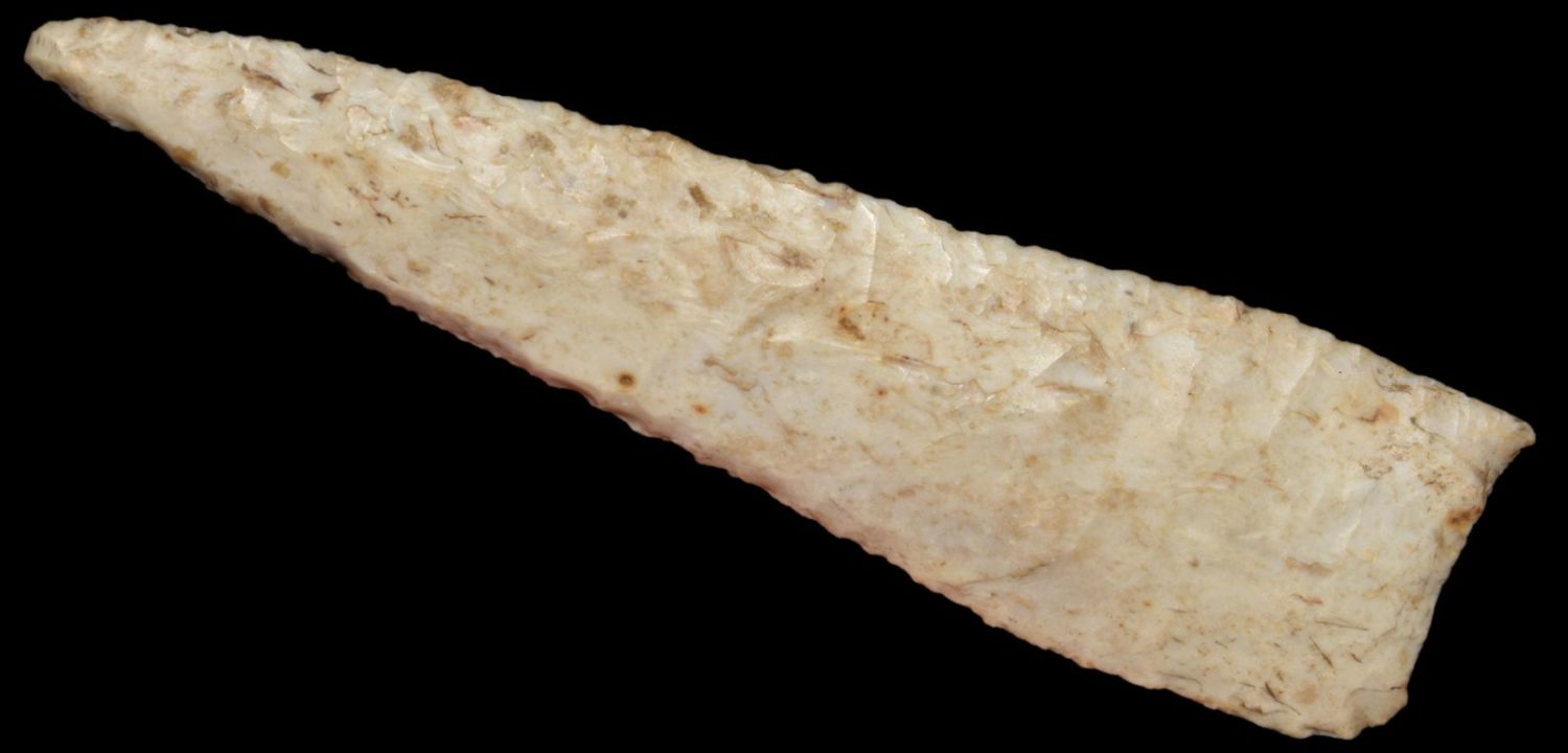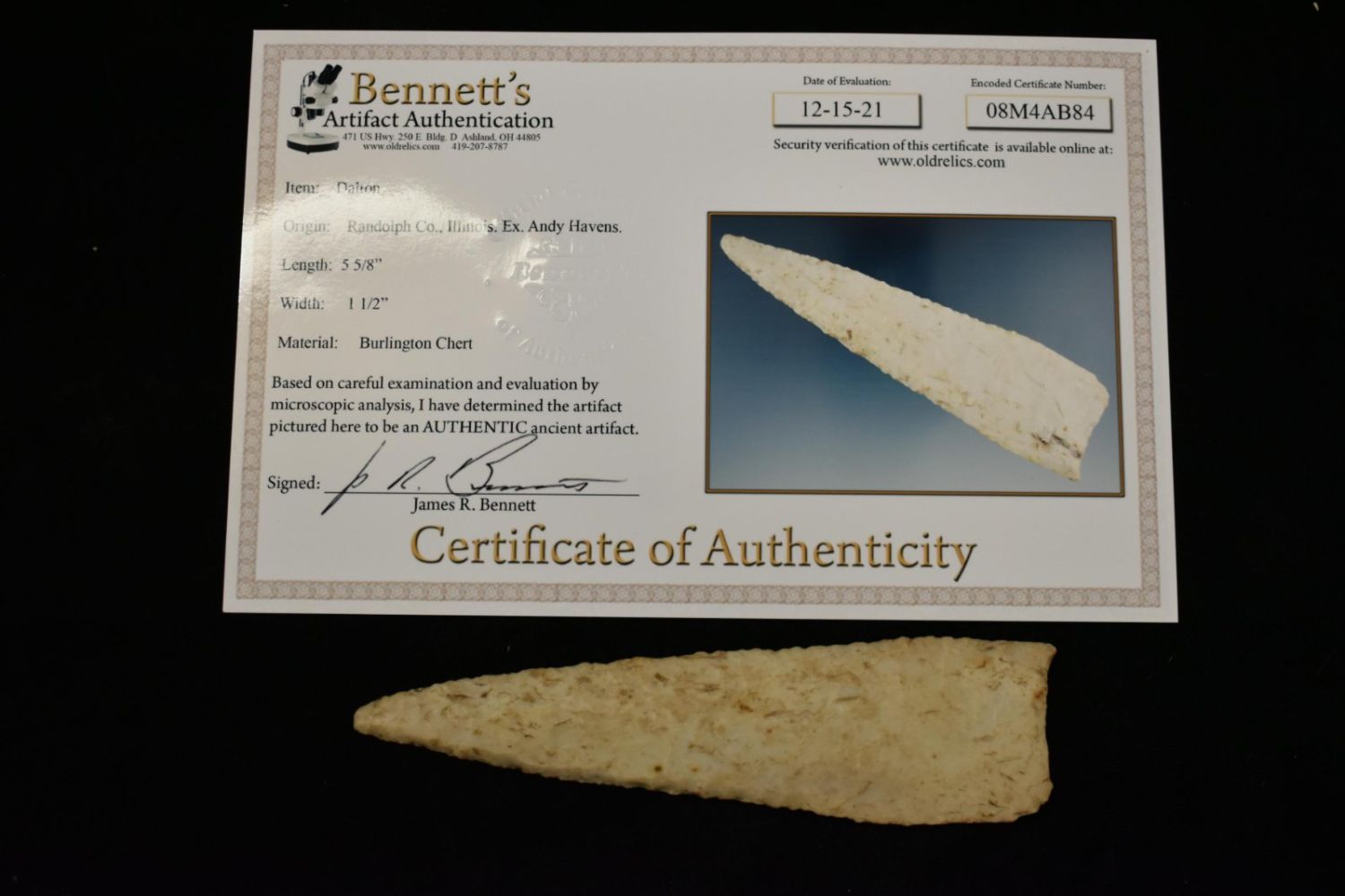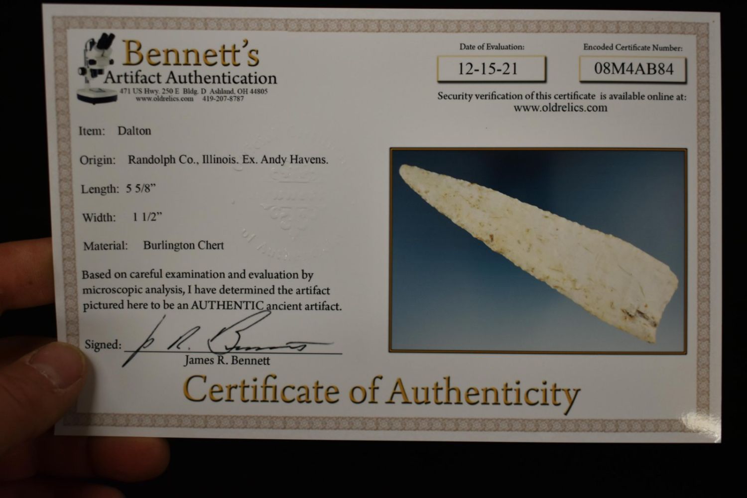 5 5/8" Dalton, Bennett COA, -Superior Size, Burlington Chert, Lightly Beveled, Found in Randolph Co. Illinois, Ex. Randy Havens; Ex John Harriss