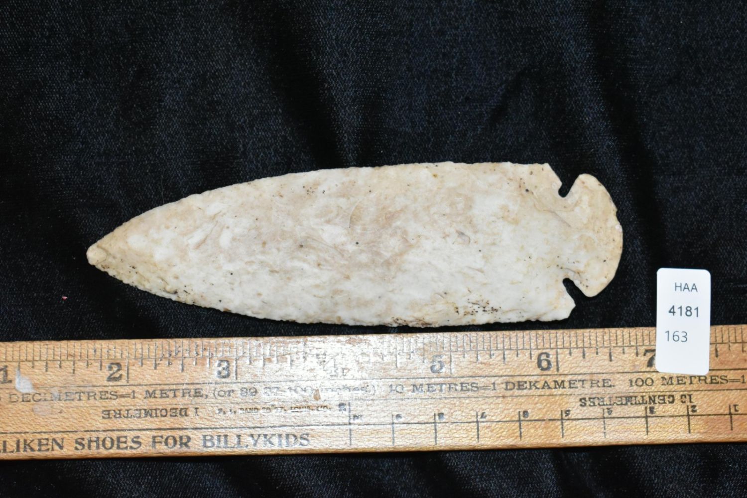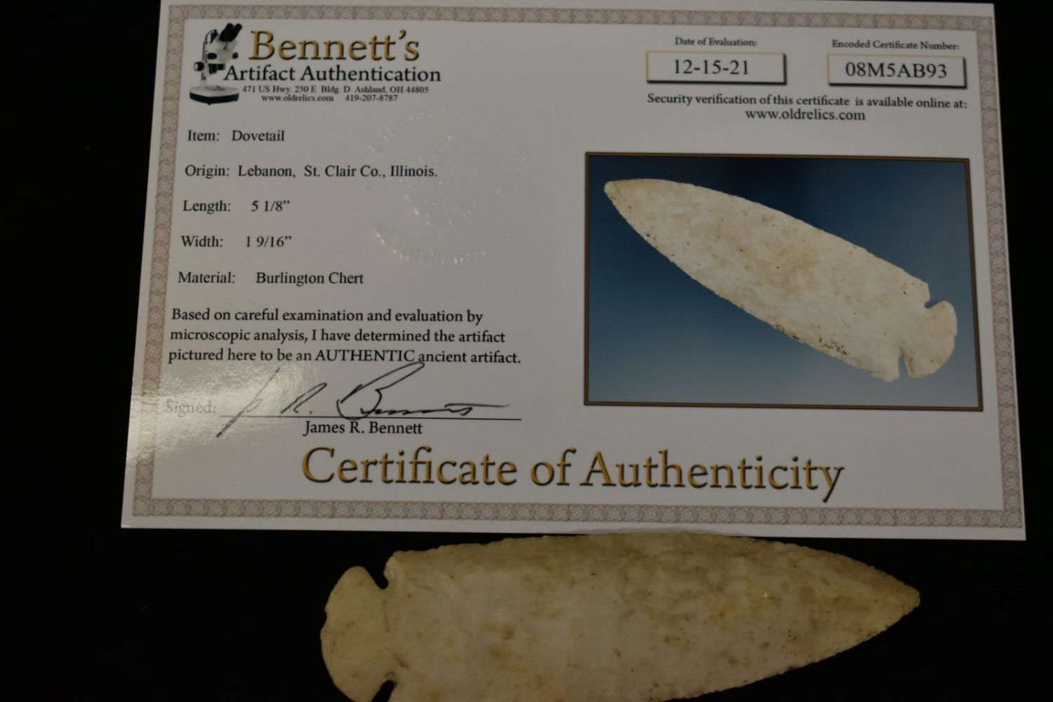 5 1/8" Dovetail, Bennett COA, found near Lebanon in St. Clair Co Illinois, EX John Harriss, Burlington Chert-Well Made and Great Size- formerly had small restoration that has since been removed