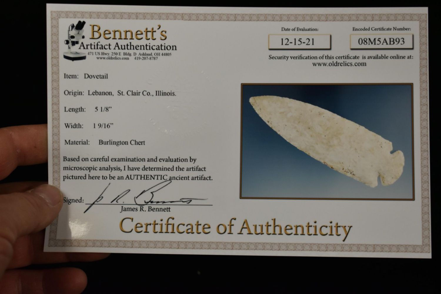 5 1/8" Dovetail, Bennett COA, found near Lebanon in St.