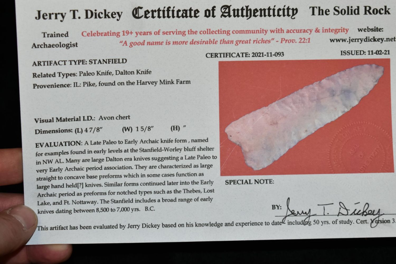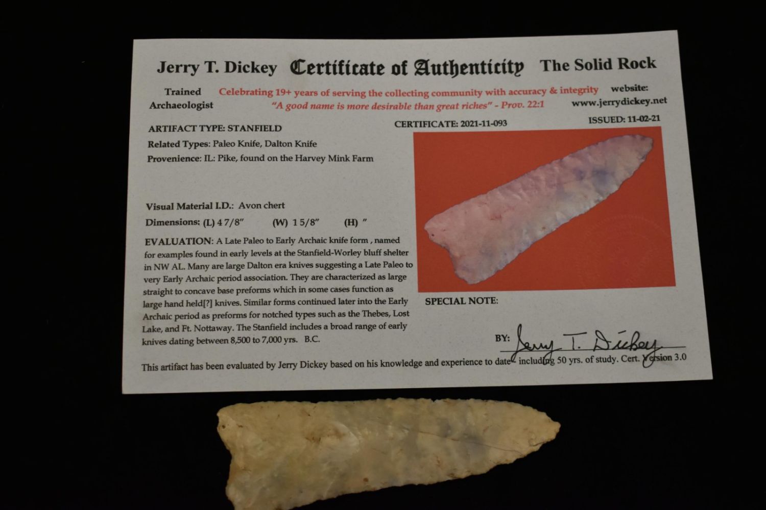 4 7/8" Stanfield Dickey COA found on Harvey Mink Farm in Pike Co Illinois- Avon Chert